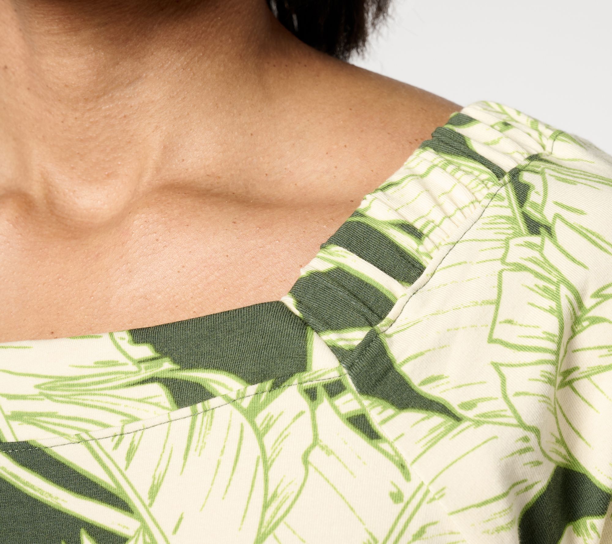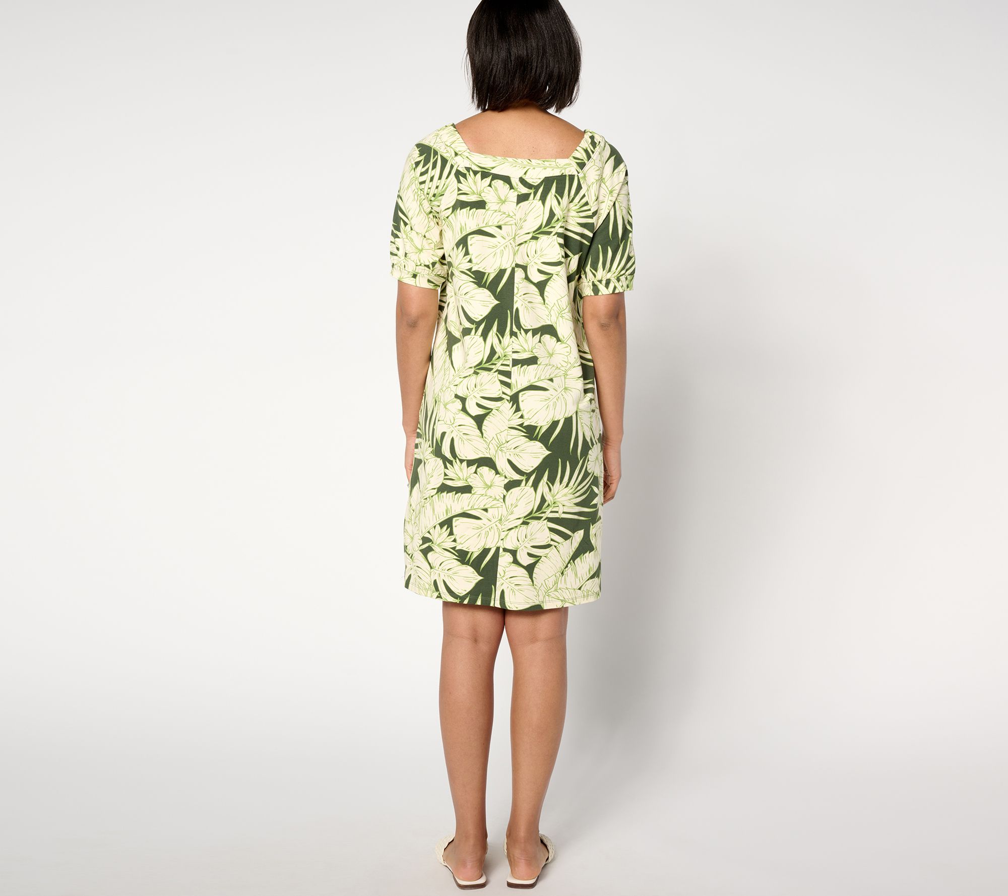 • Features: tropical print, square neckline, elbow-length raglan sleeves, side seam pockets