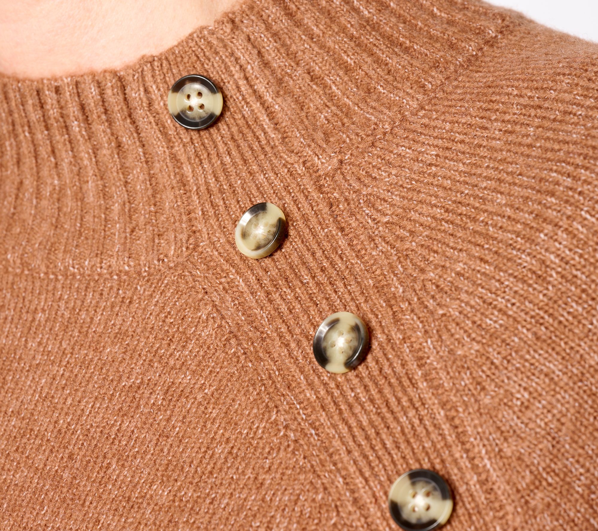 Features: raglan long sleeves; mock neckline with non-functional button placket at wearer's left side; ribbed neck, cuff, and hem