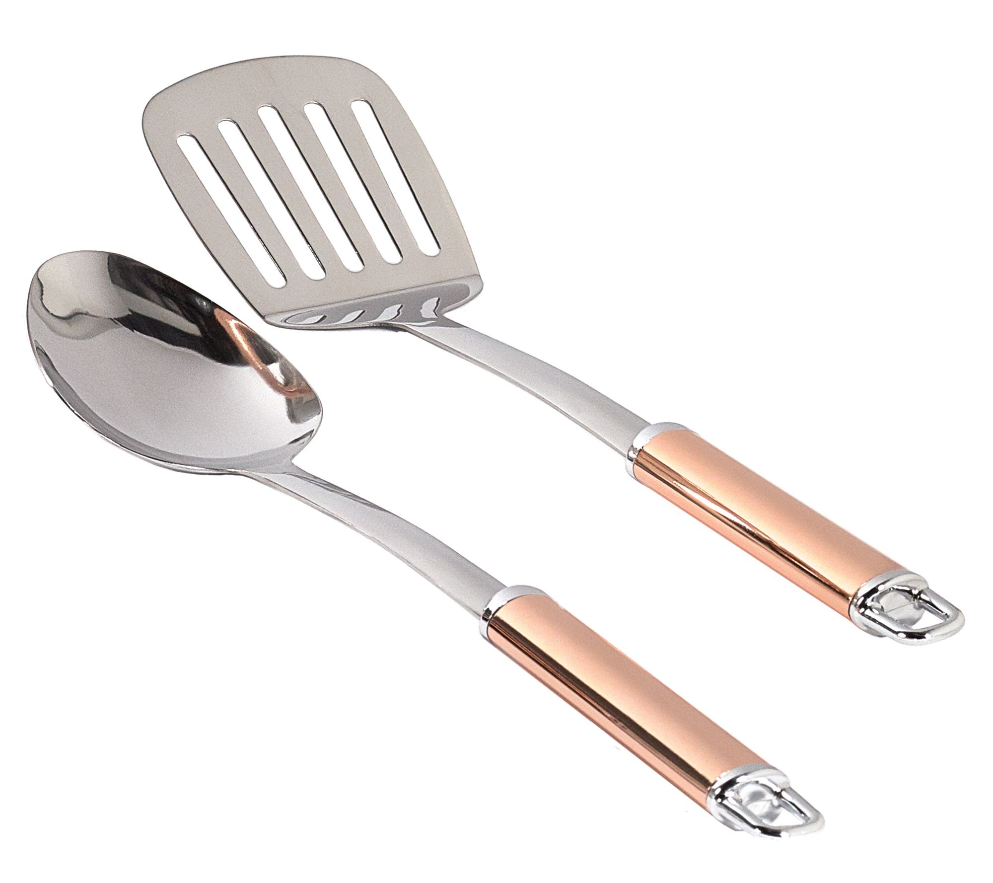 • Includes 1-qt covered saucepan, 2-qt covered saucepan, 5-qt covered Dutch oven, 9.5" open skillet, 8" open skillet, stainless steel slotted turner, and stainless steel solid spoon