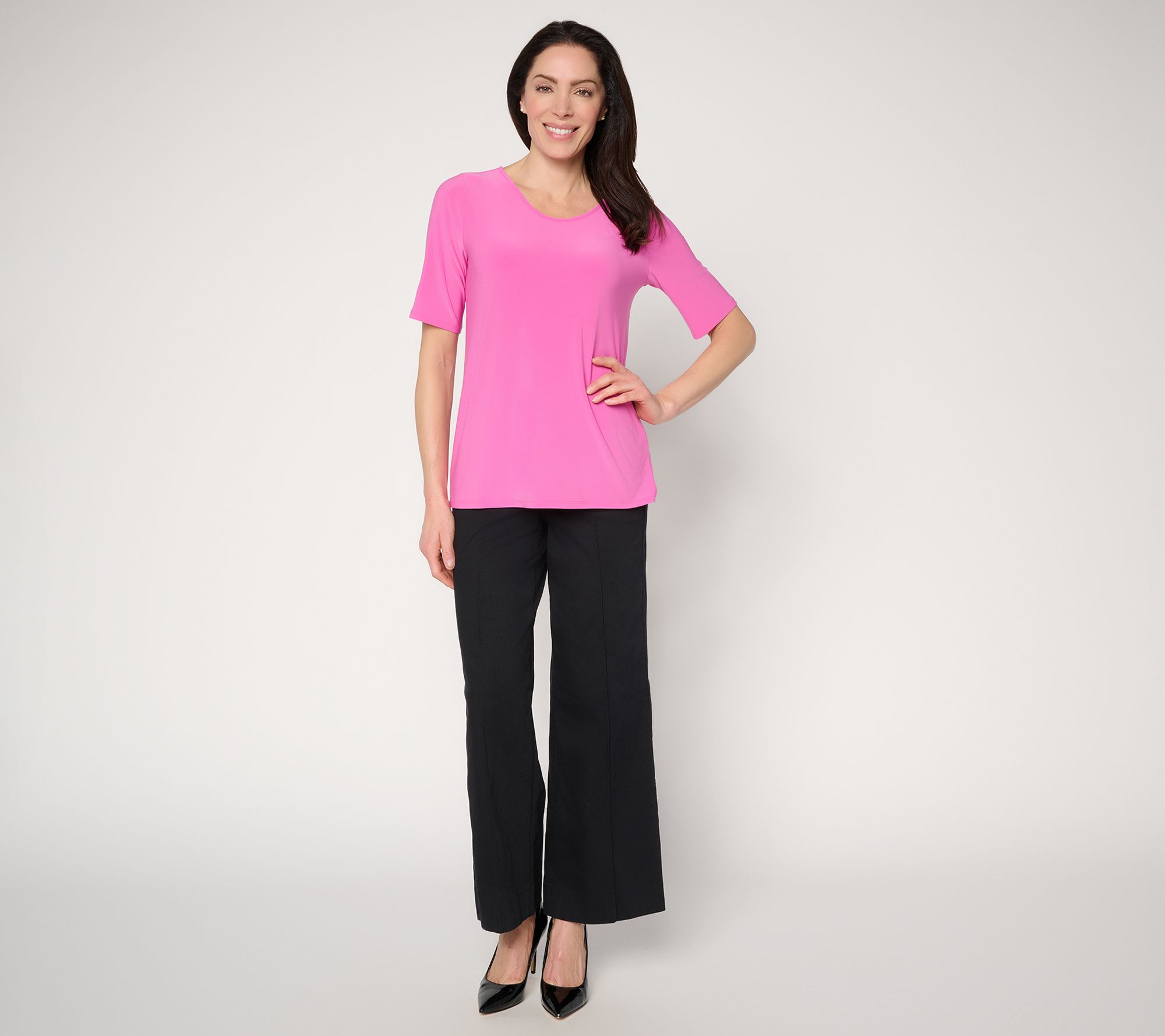 Whether you are heading out for brunch or settling in for a cozy evening, this swoop-neck knit top brings just the right mix of polish and relaxed comfort. The soft, semi-fitted silhouette and elbow-length sleeves flatter effortlessly, making it easy to pair with jeans or skirts for everyday elegance. From Dennis Basso.