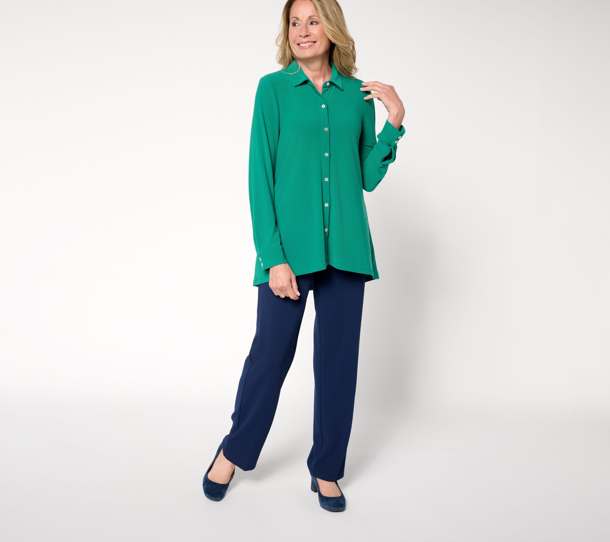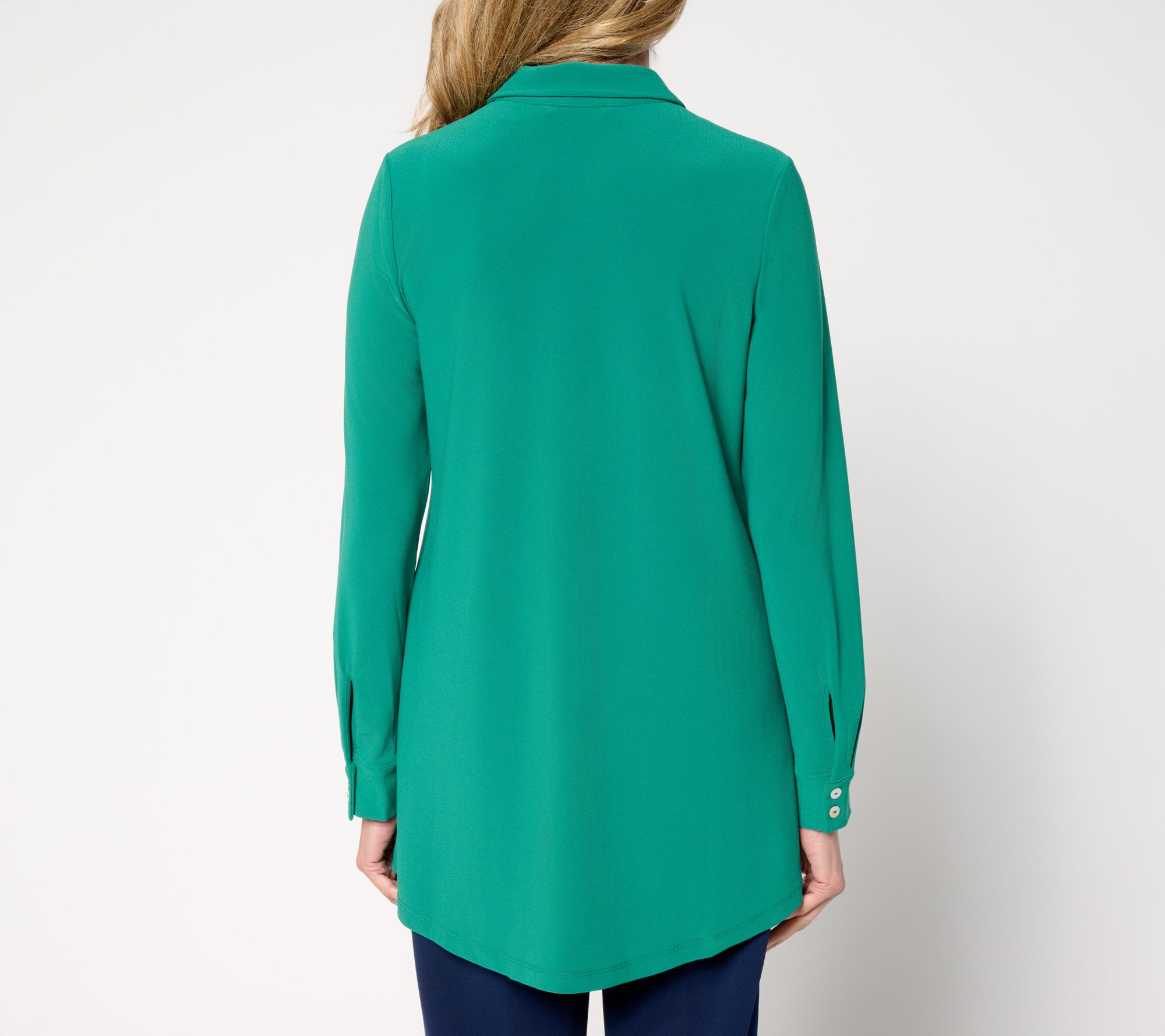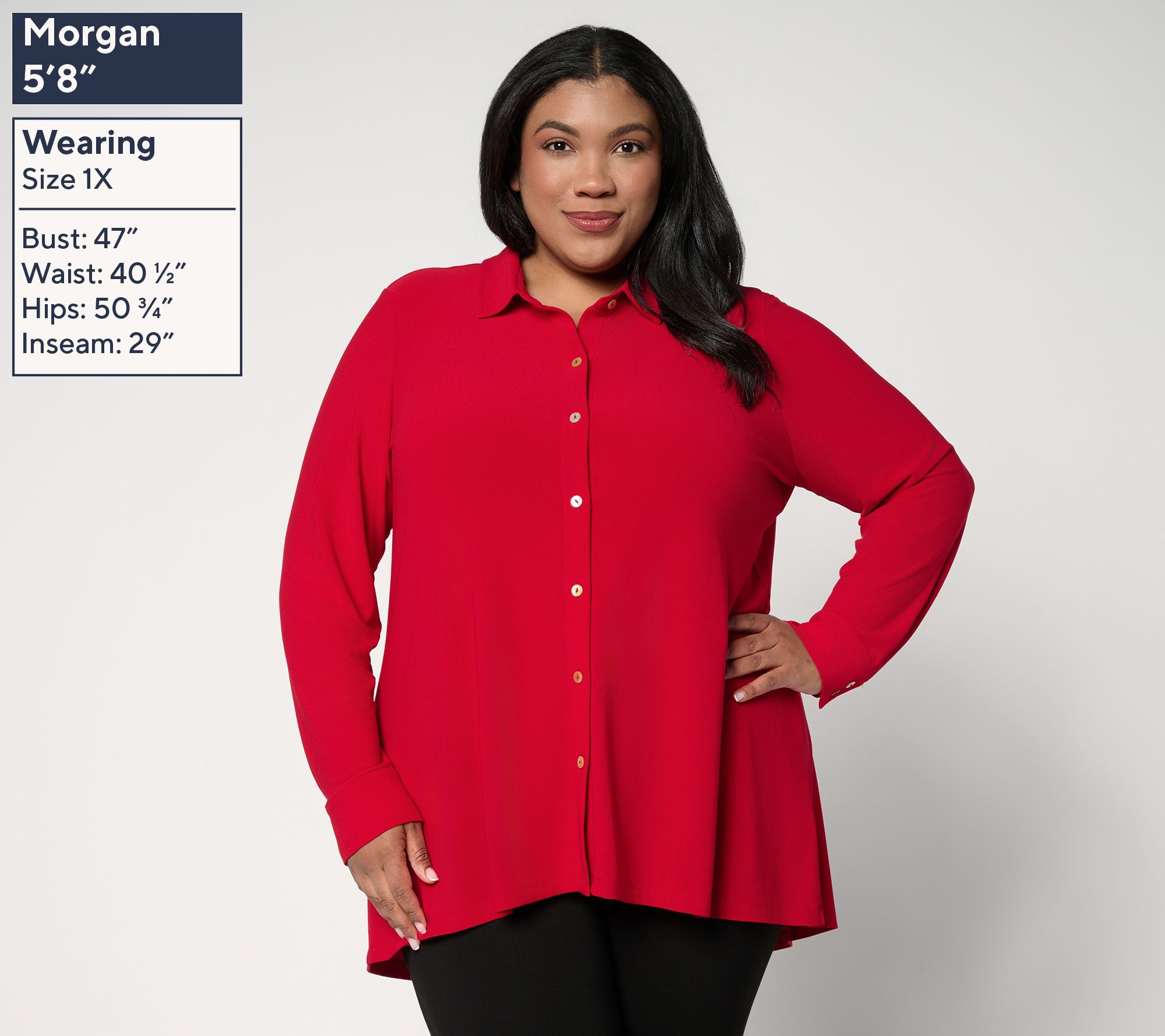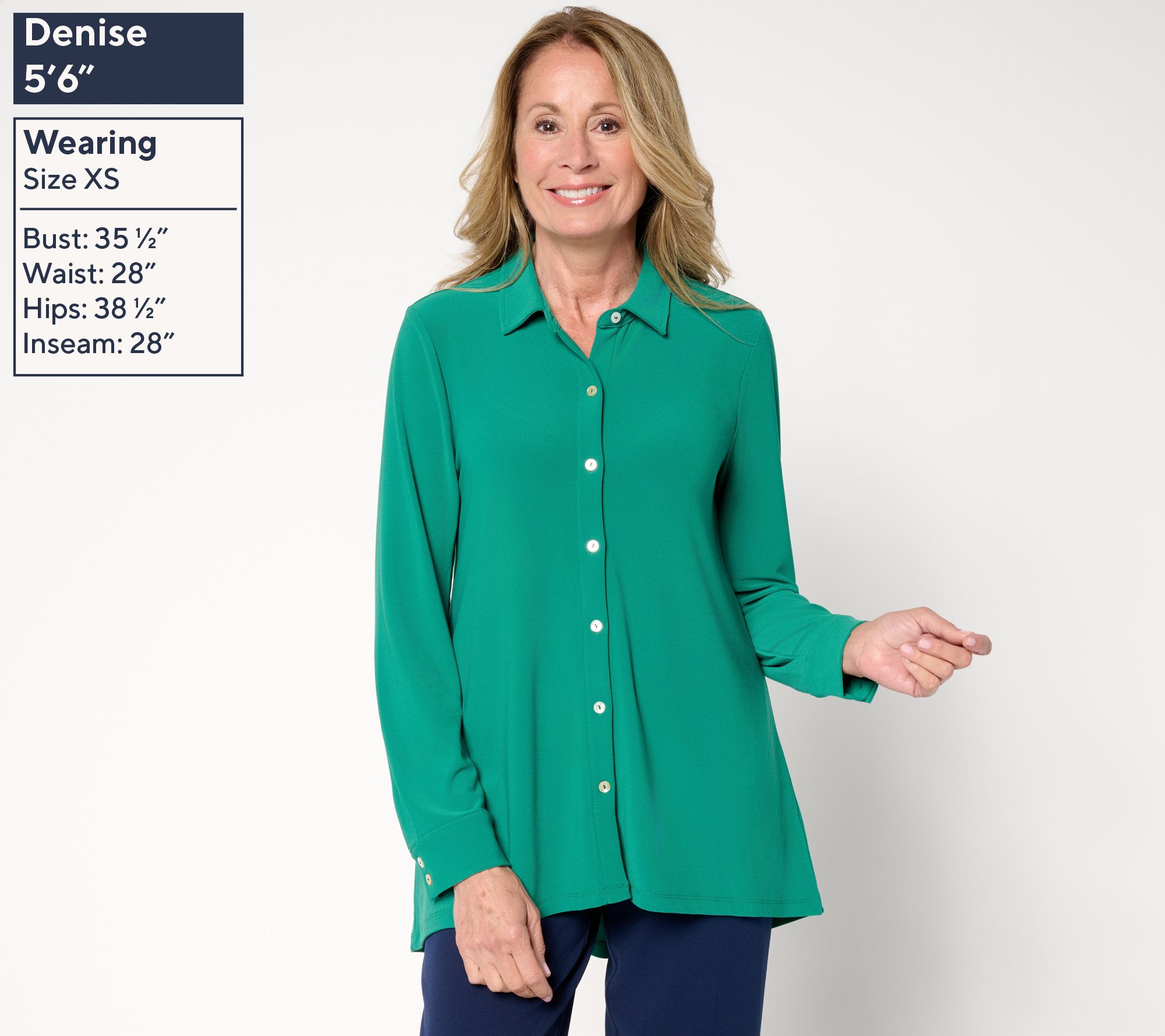 Designed in luxurious caviar crepe, this button-front shirt exudes everyday elegance, with a flared hi-low hem that adds graceful movement to every step you take. From Dennis Basso.