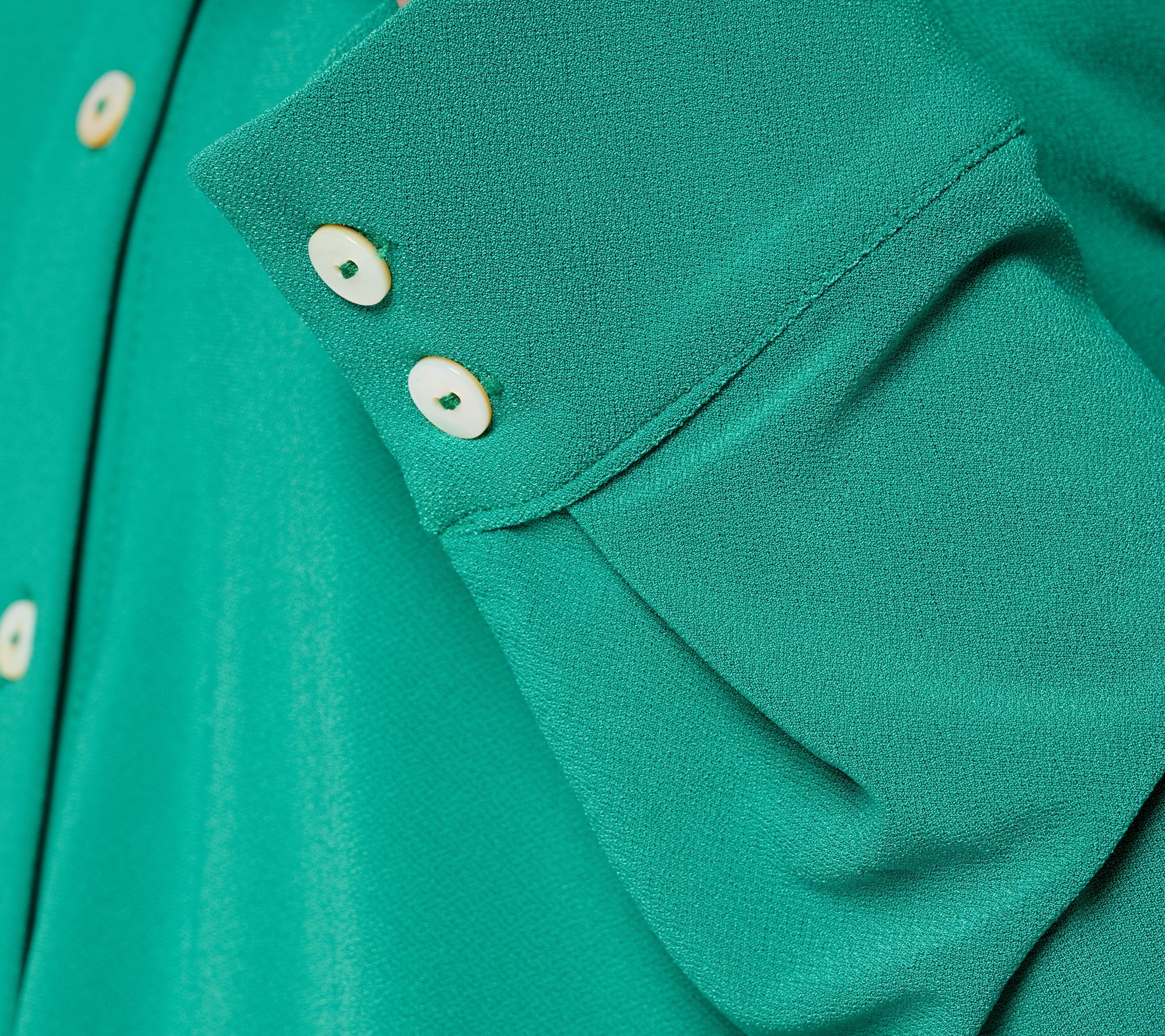 Features: collared, button-front closure, long sleeves with buttoned cuffs, hi-low hemline