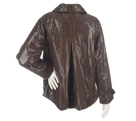 Mock croc. Done in faux croc-embossed material, this jacket is cool on the outside yet cozy on the inside thanks to a quilted lining. The snap-up placket is covered to maintain a sleek look. From Dennis Basso.