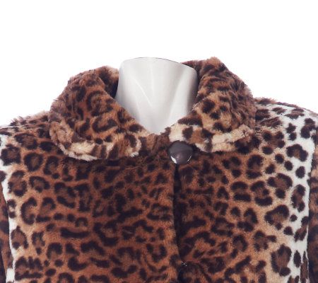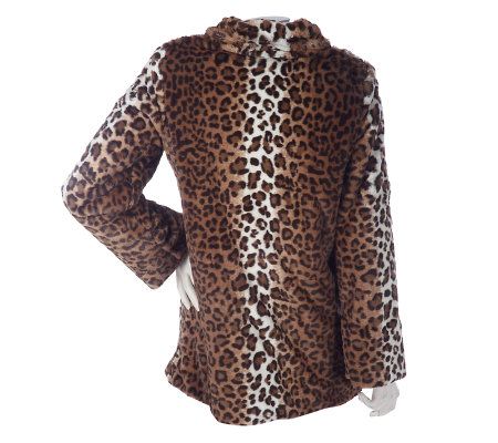 Fabulous faux. Welcome winter weather in style with this faux fur coat. It flaunts an eye-catching leopard print, a flattering stand collar, and front pockets to warm your hands. From Dennis Basso.