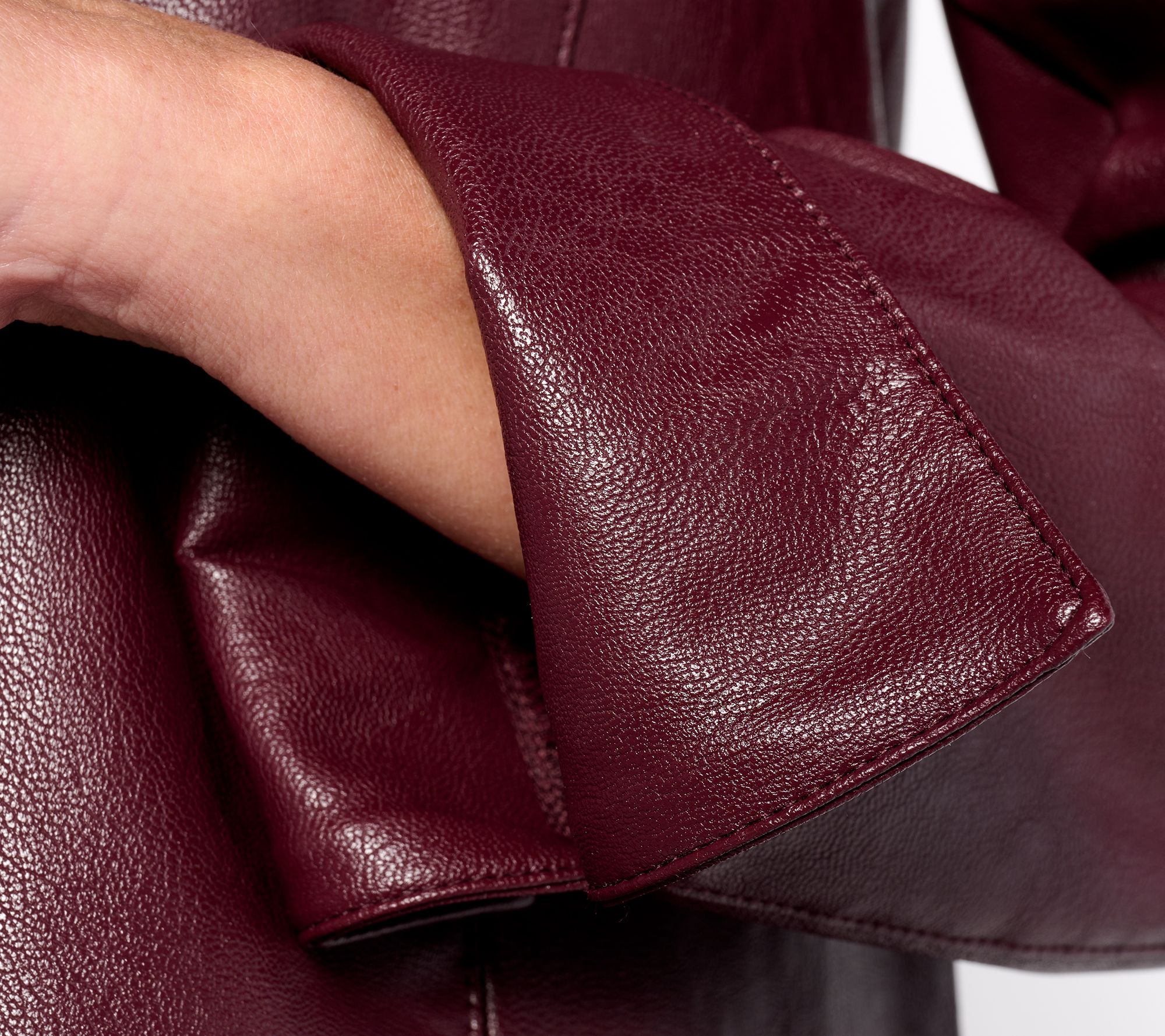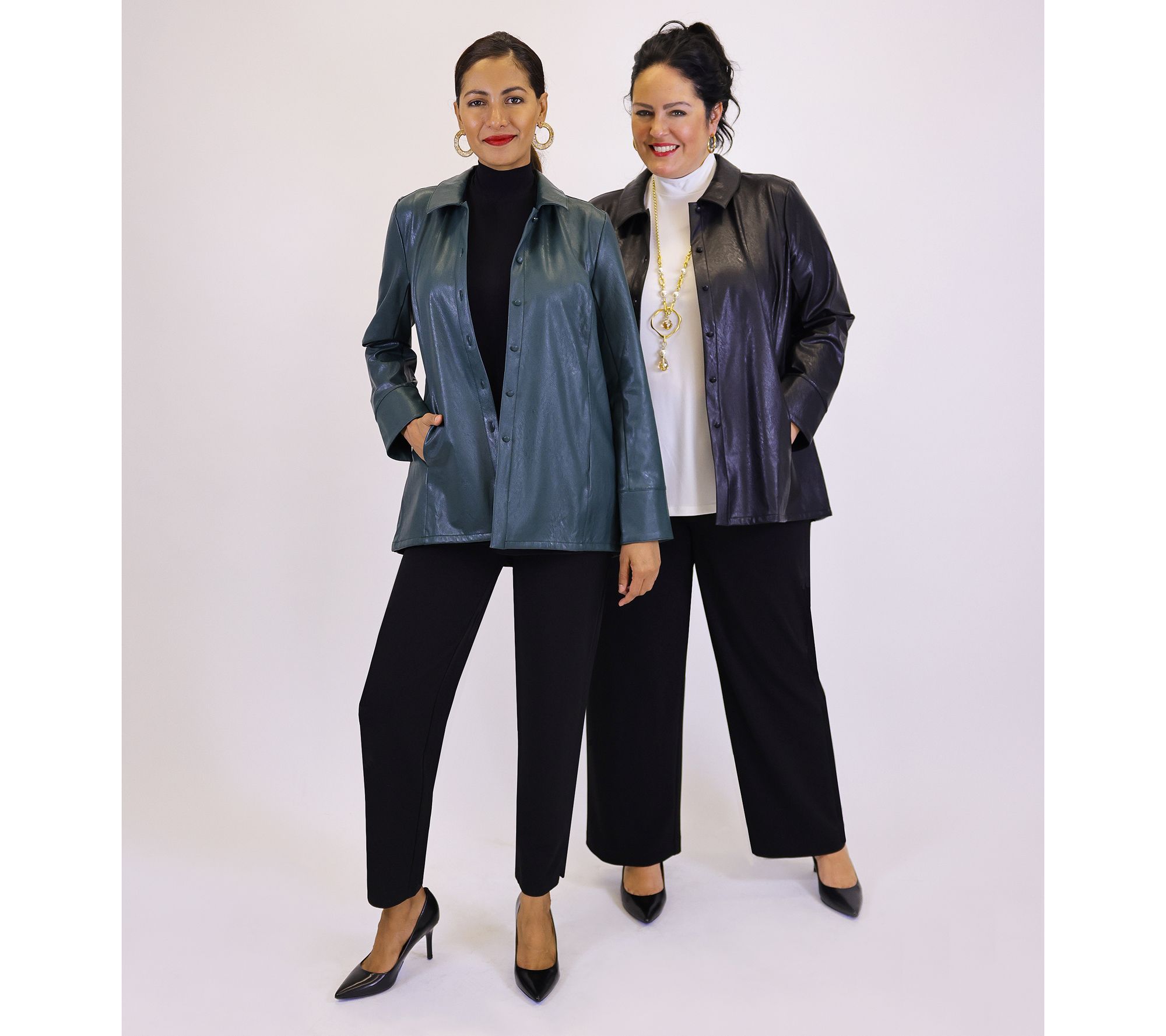 For an epic on-trend look that's surprisingly easy to wear (thank you, stretch backing), reach for this faux-leather shirt. From Dennis Basso.