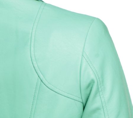 • Faux leather; fully lined; front-zip closure; shirt collar; seam detailing; two perforated, scalloped front pockets with flaps, back peplum; signature silvertone hardware