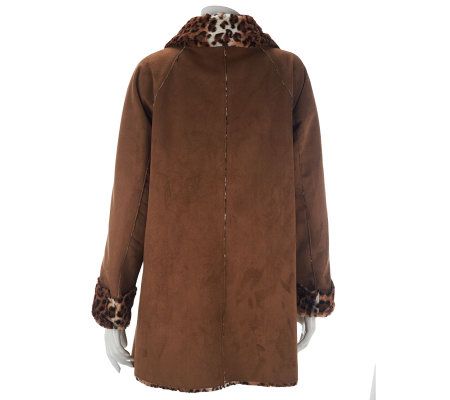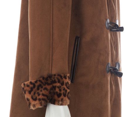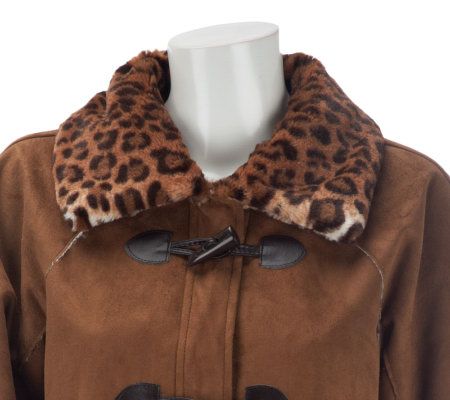 Keep wicked weather at bay the chic and fashion-forward way. Leopard-printed faux fur on the collar, cuffs, and lining of this toggle coat accent its cozy, faux suede design. From Dennis Basso.