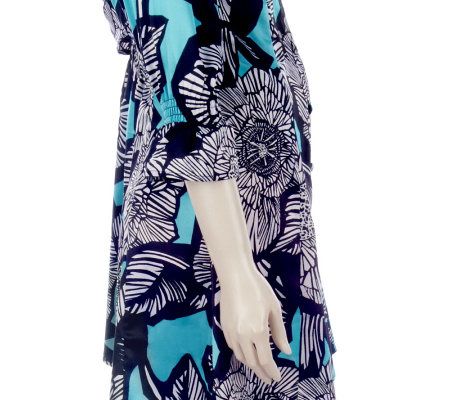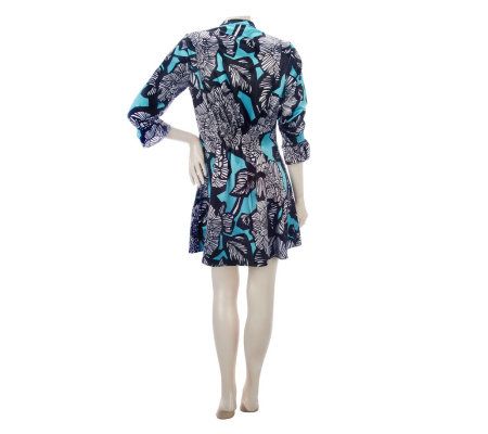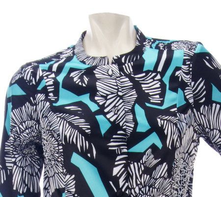 Distinctively fashioned with a button front, a mandarin collar, and shirring details, this flared tunic gets you set for the season. A bold floral print completes the stylish staple. From Dennis Basso.
