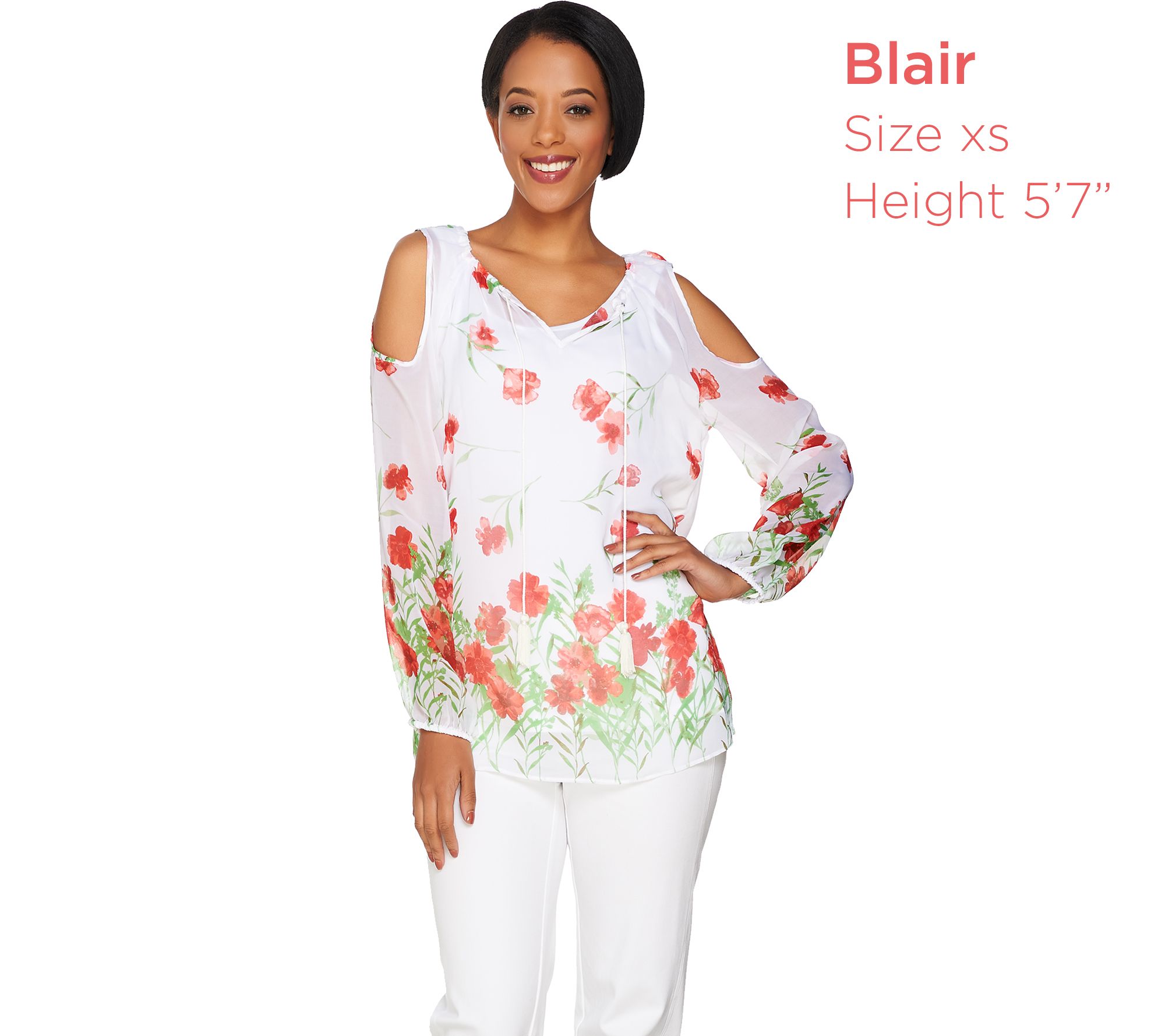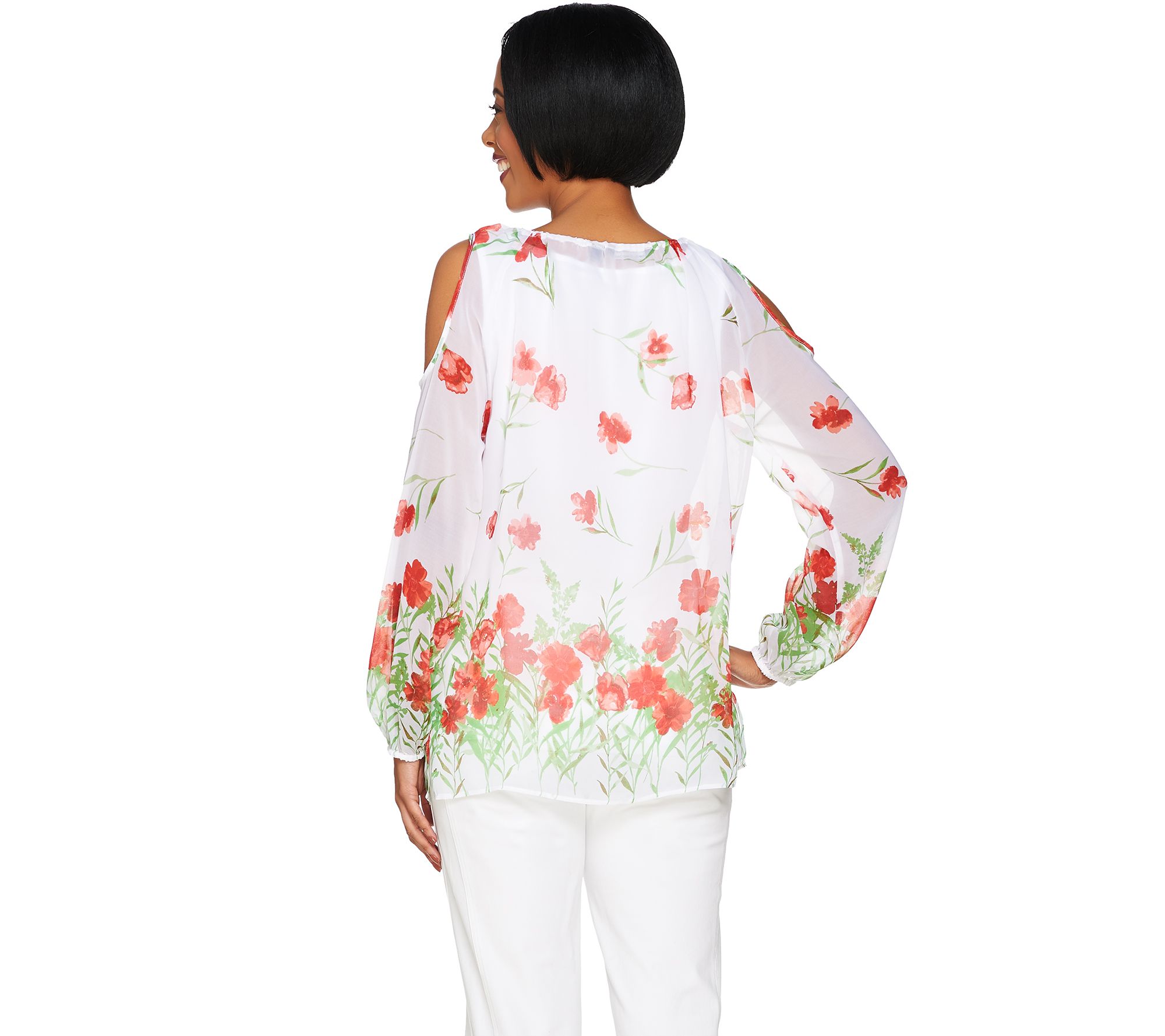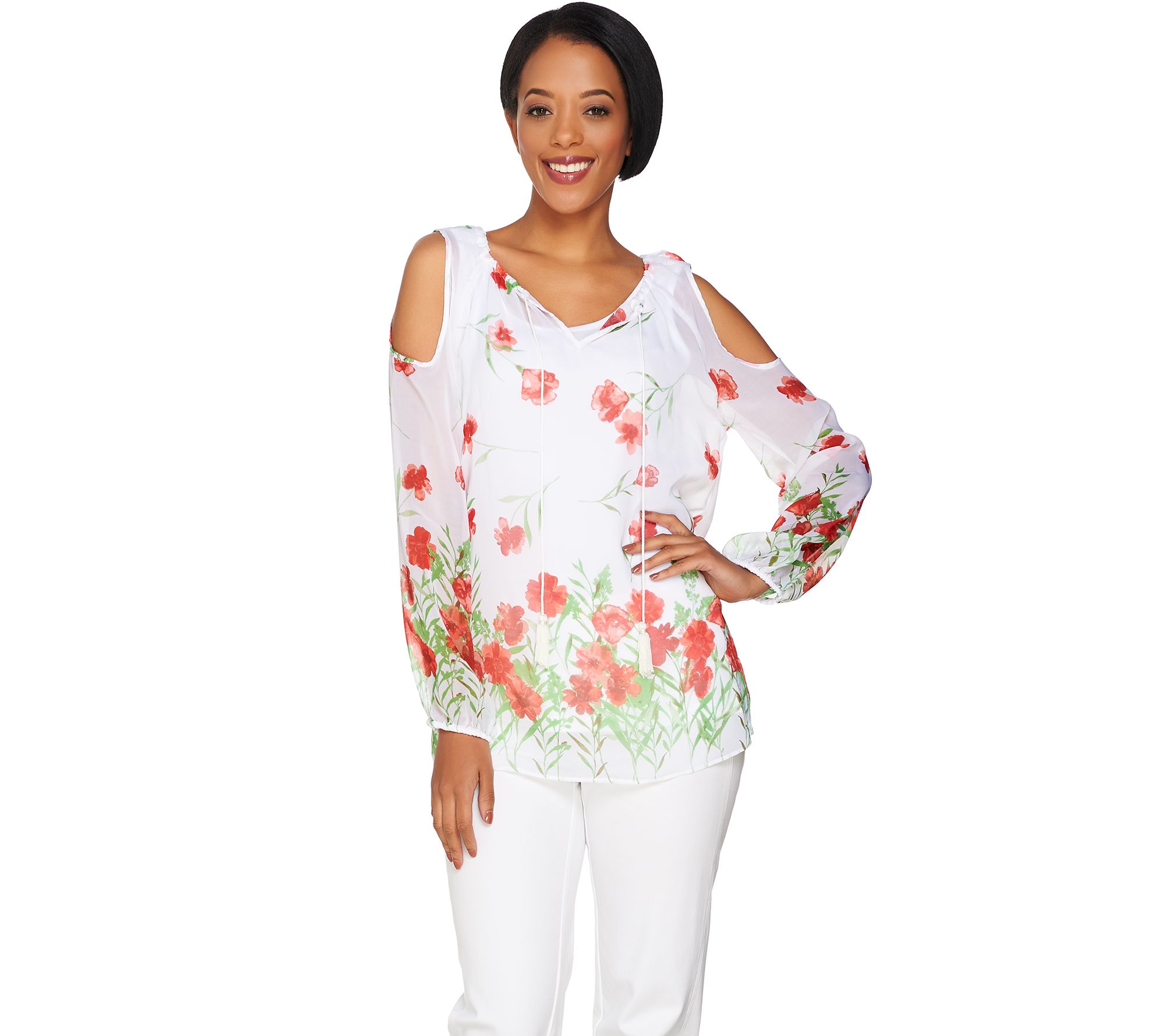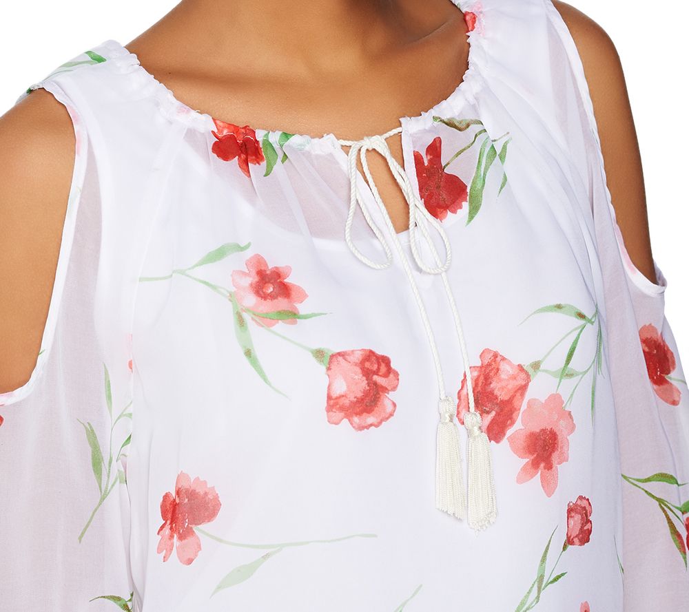 Pop top. There's more than meets the eye to this poppy floral print cold shoulder blouse by Dennis Basso. The included solid-color cami sits underneath a sheer field-of-florals top with the cool shoulder cut-outs everyone adores. From Dennis Basso.