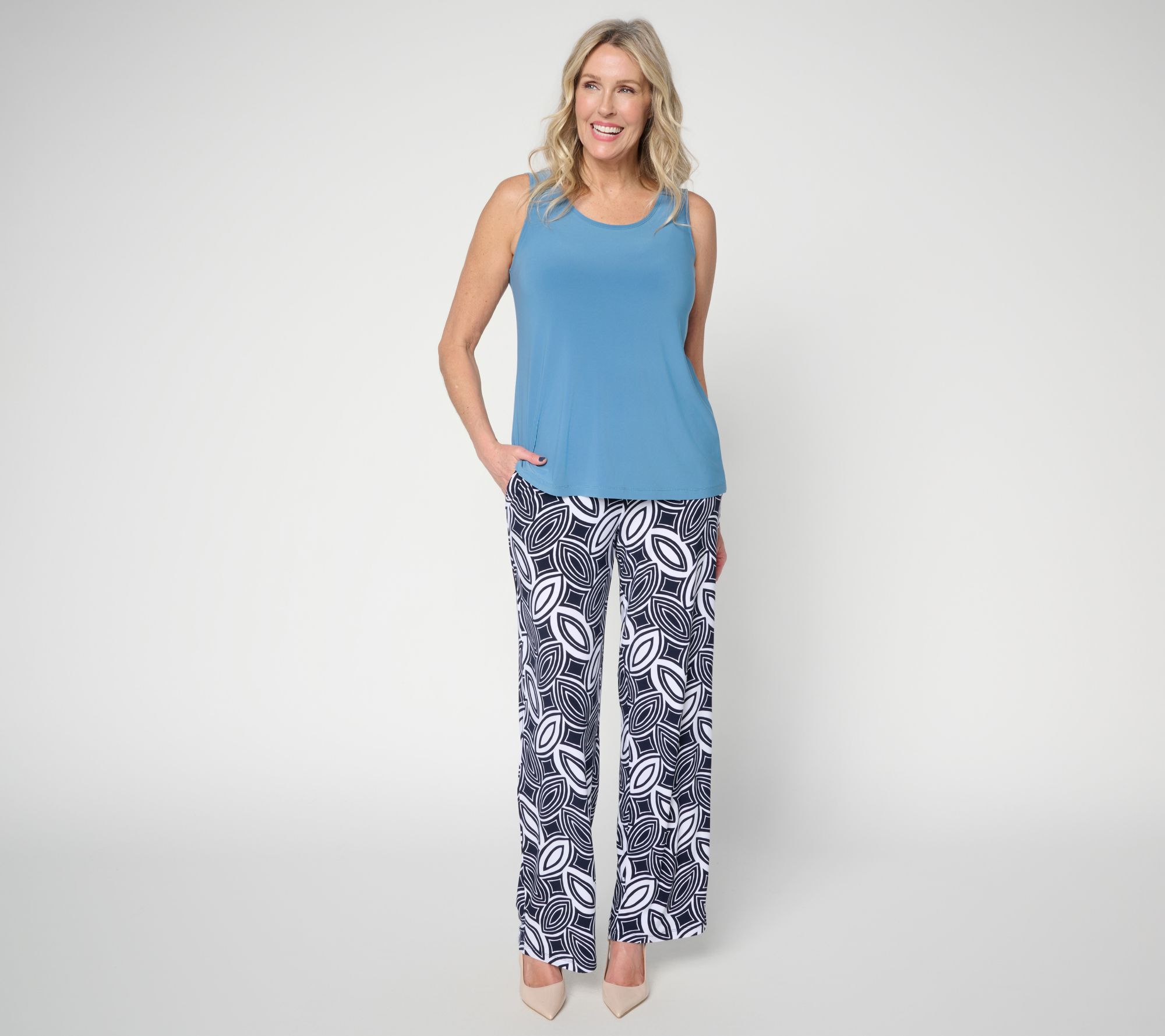 Slip into this scoop-neck tank top for an instantly polished layer -- ideal for sunny days on its own or as an easy piece under a blazer when you're heading to the office. The smooth knit fabrication drapes beautifully, and the straight hem gives it a crisp, versatile silhouette you can style up or down. From Dennis Basso.
