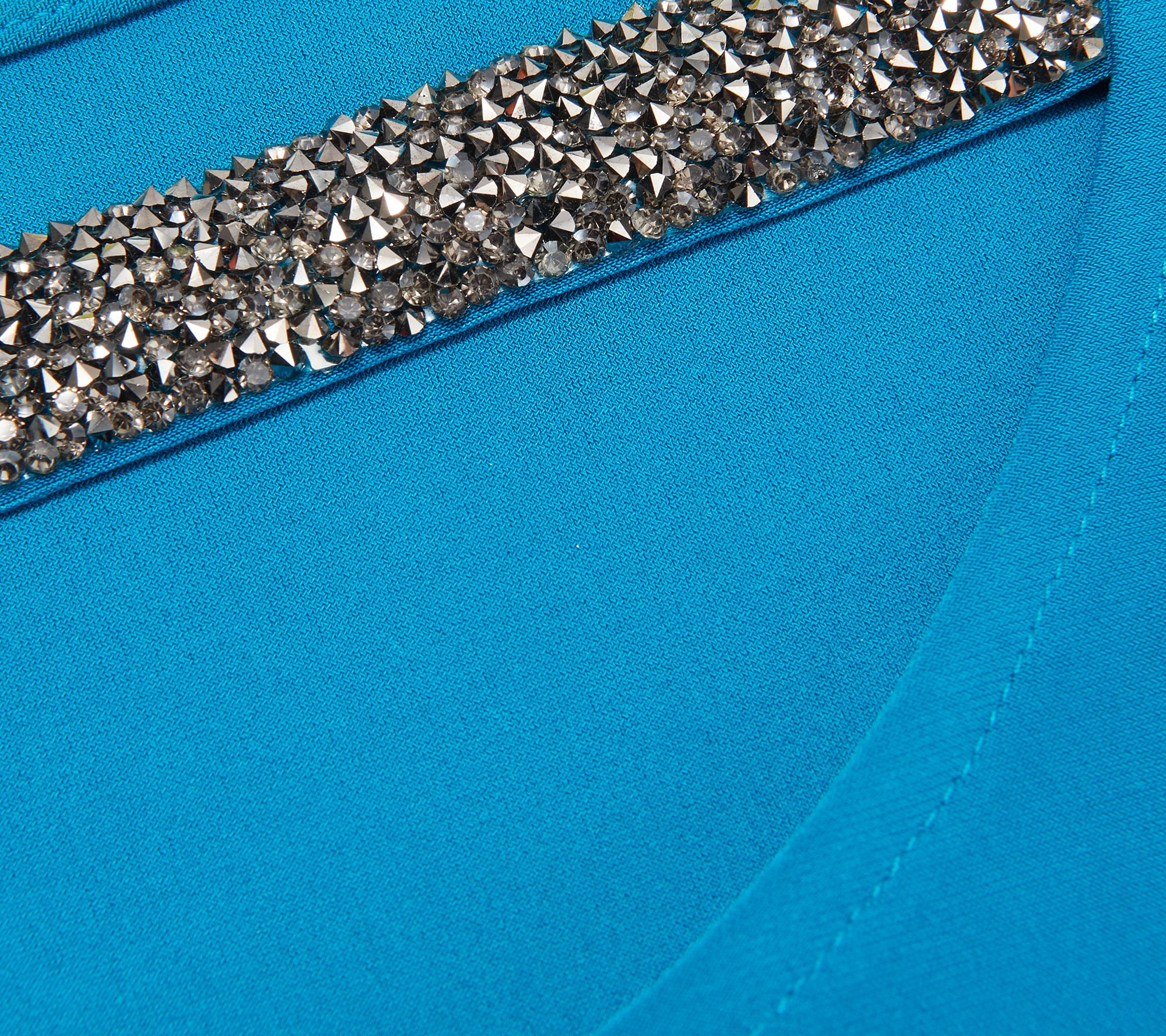 - Features: bateau front neckline, scoop back neckline, long sleeves, embellishment across back at neck