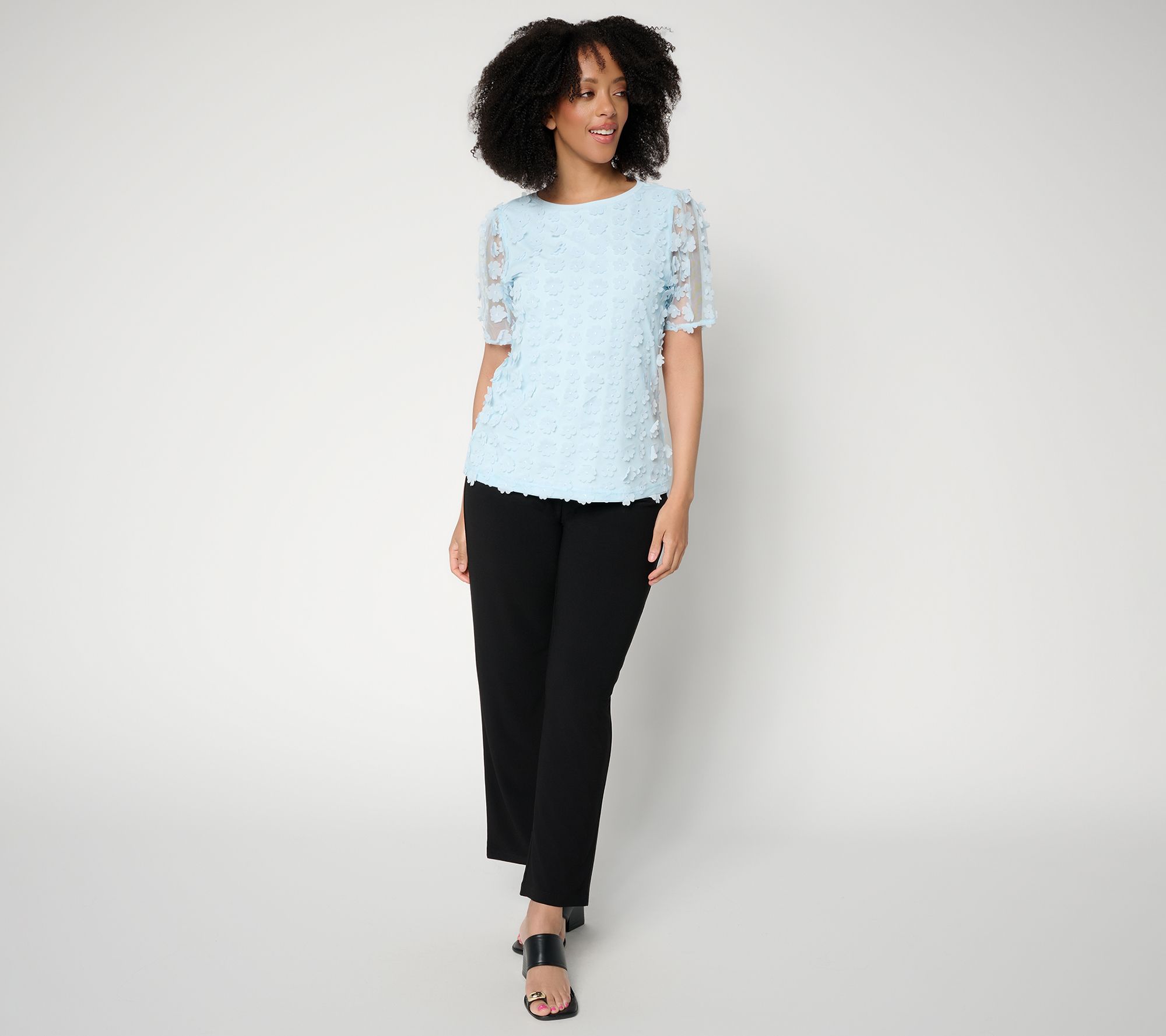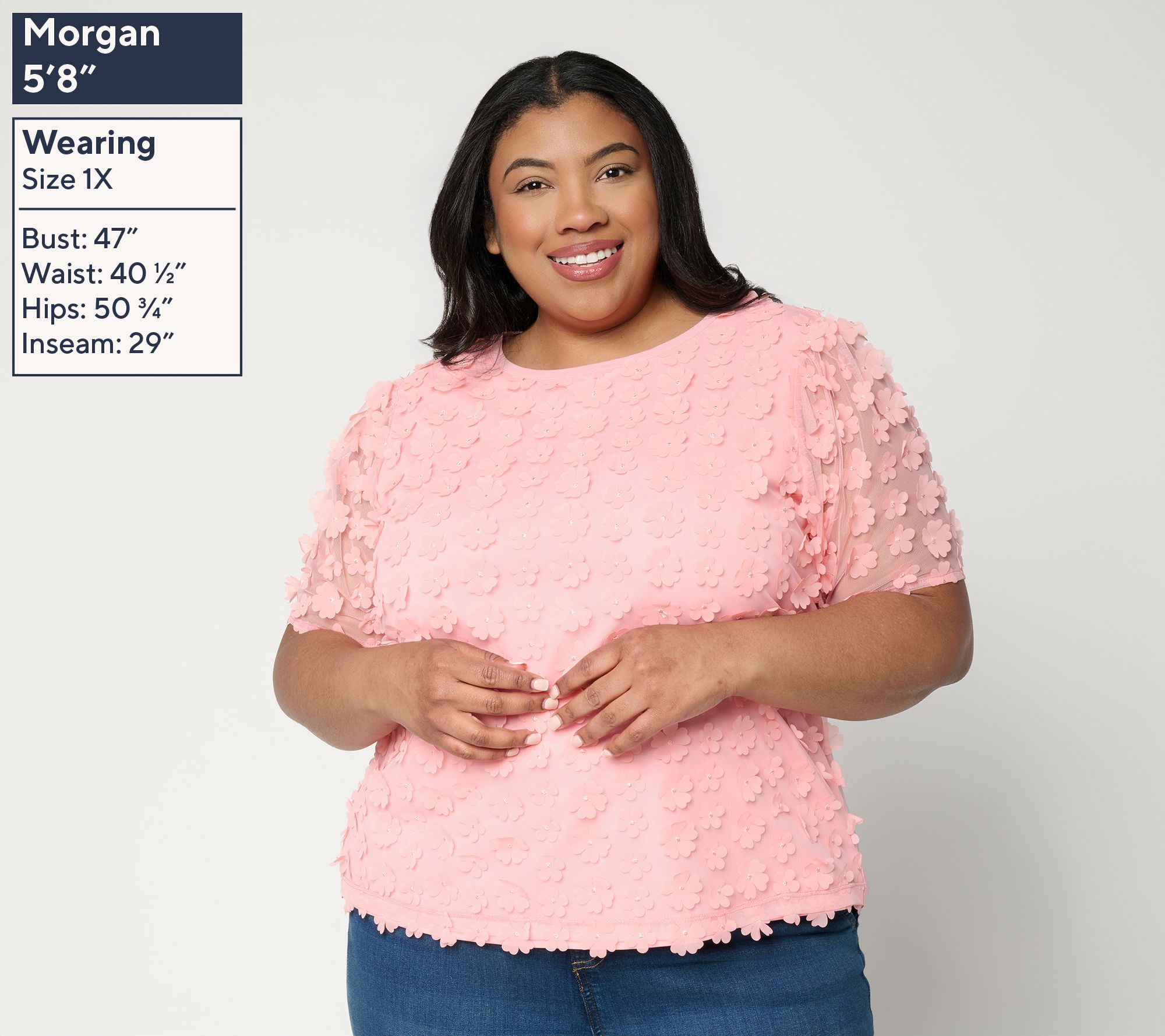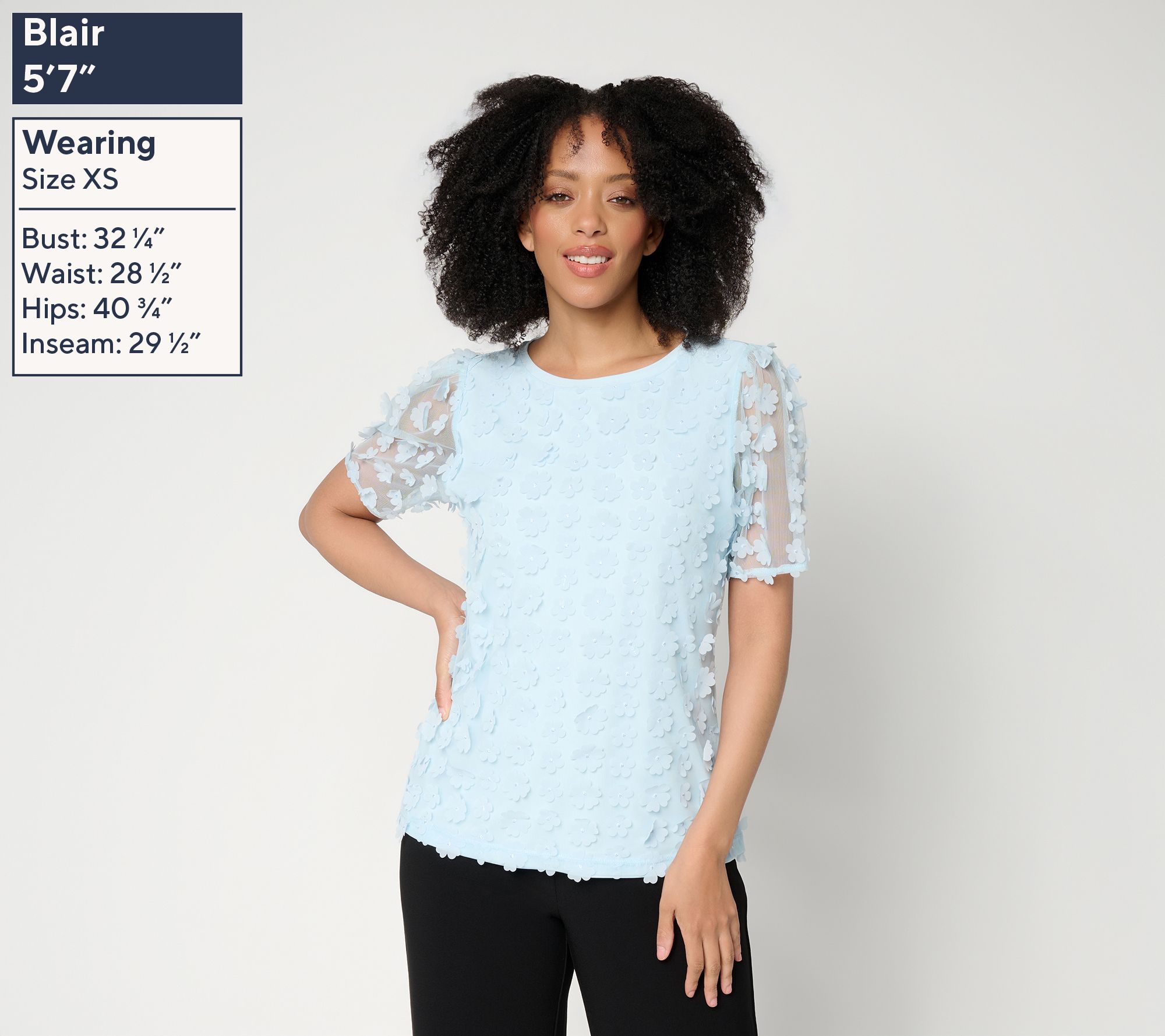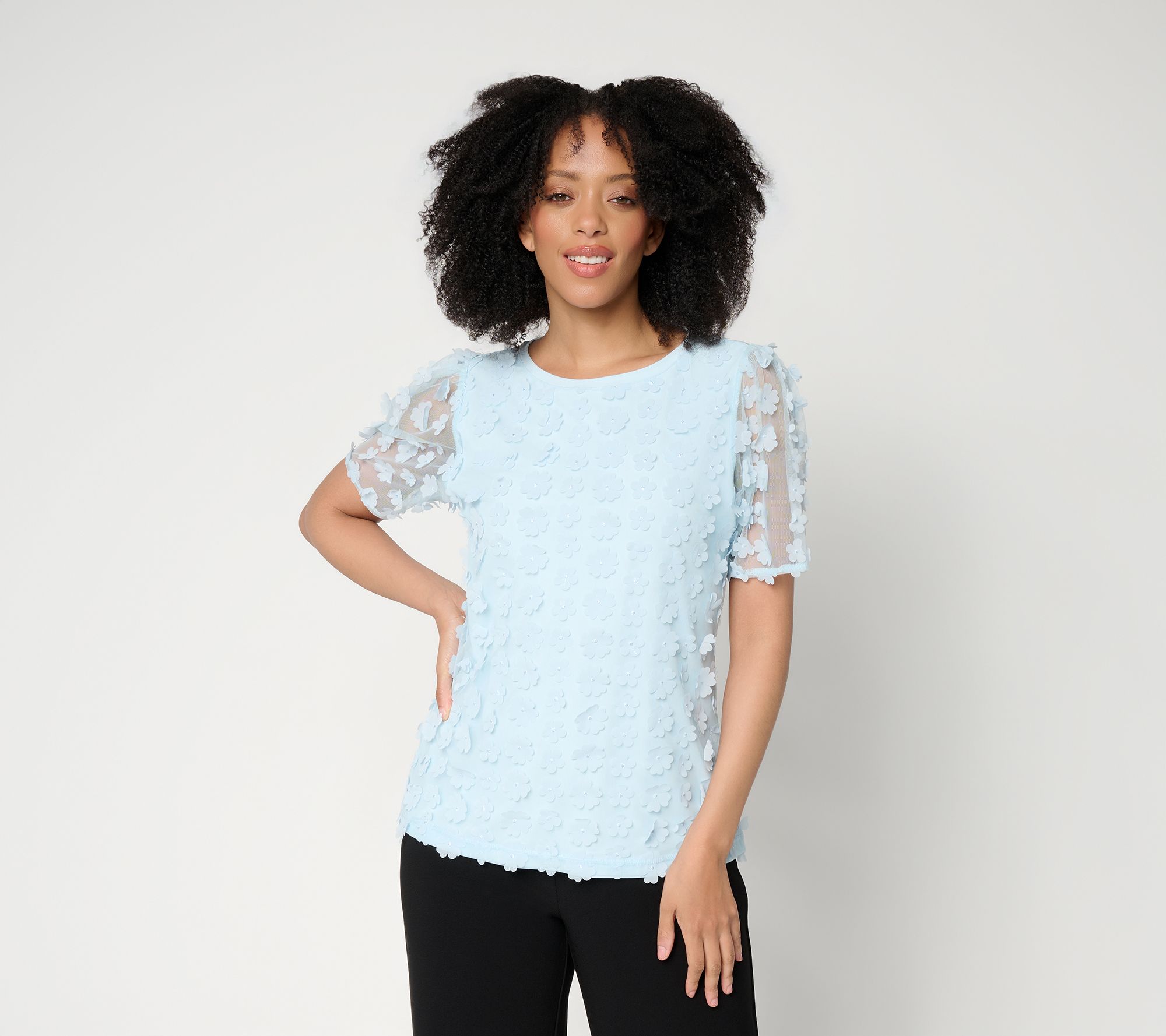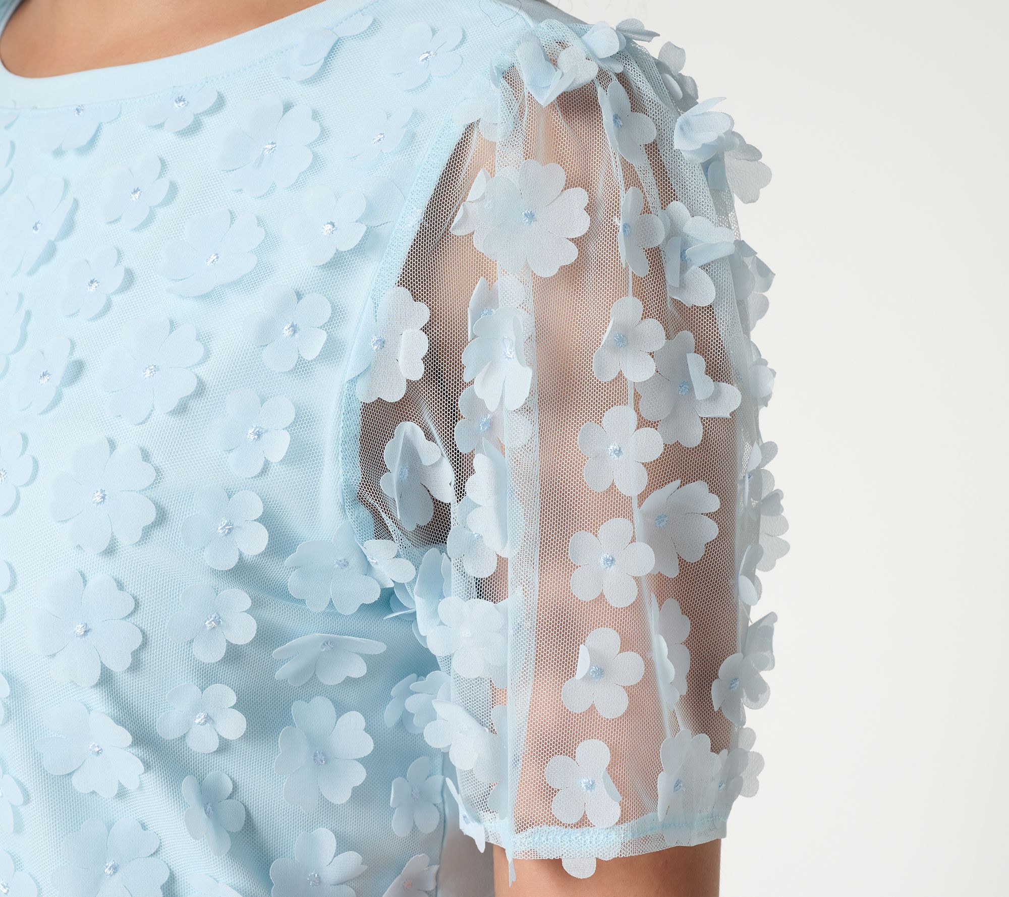 Features: mesh overlay at front with 3-D flower motifs, floral mesh short sleeves, bateau neck with neckband