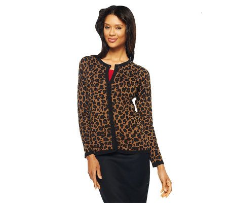 A true fashionista doesn't change her spots--she always wants to look fabulous! And, it's easy to do when she has style-savvy essentials such as this leopard-print cardigan in her closet. How fierce! From Dennis Basso.