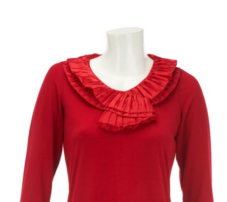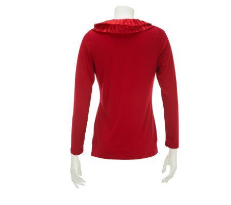 Dennis Basso Long Sleeve Knit Top with Satin Ruffle Detail