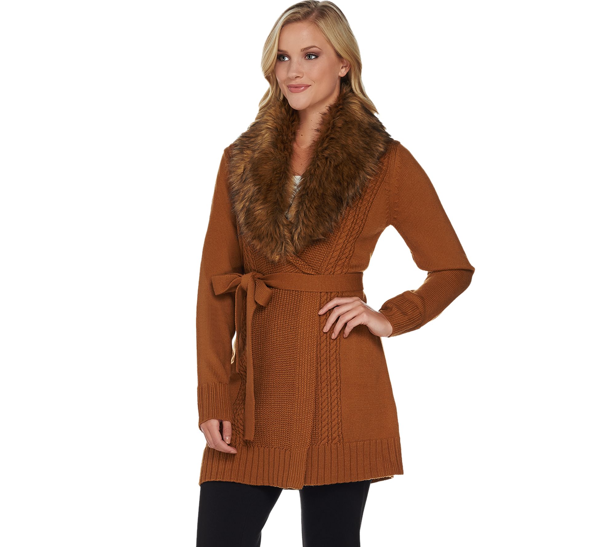 Dennis Basso Mix Stitch Belted Cardigan with Faux Fur Collar
