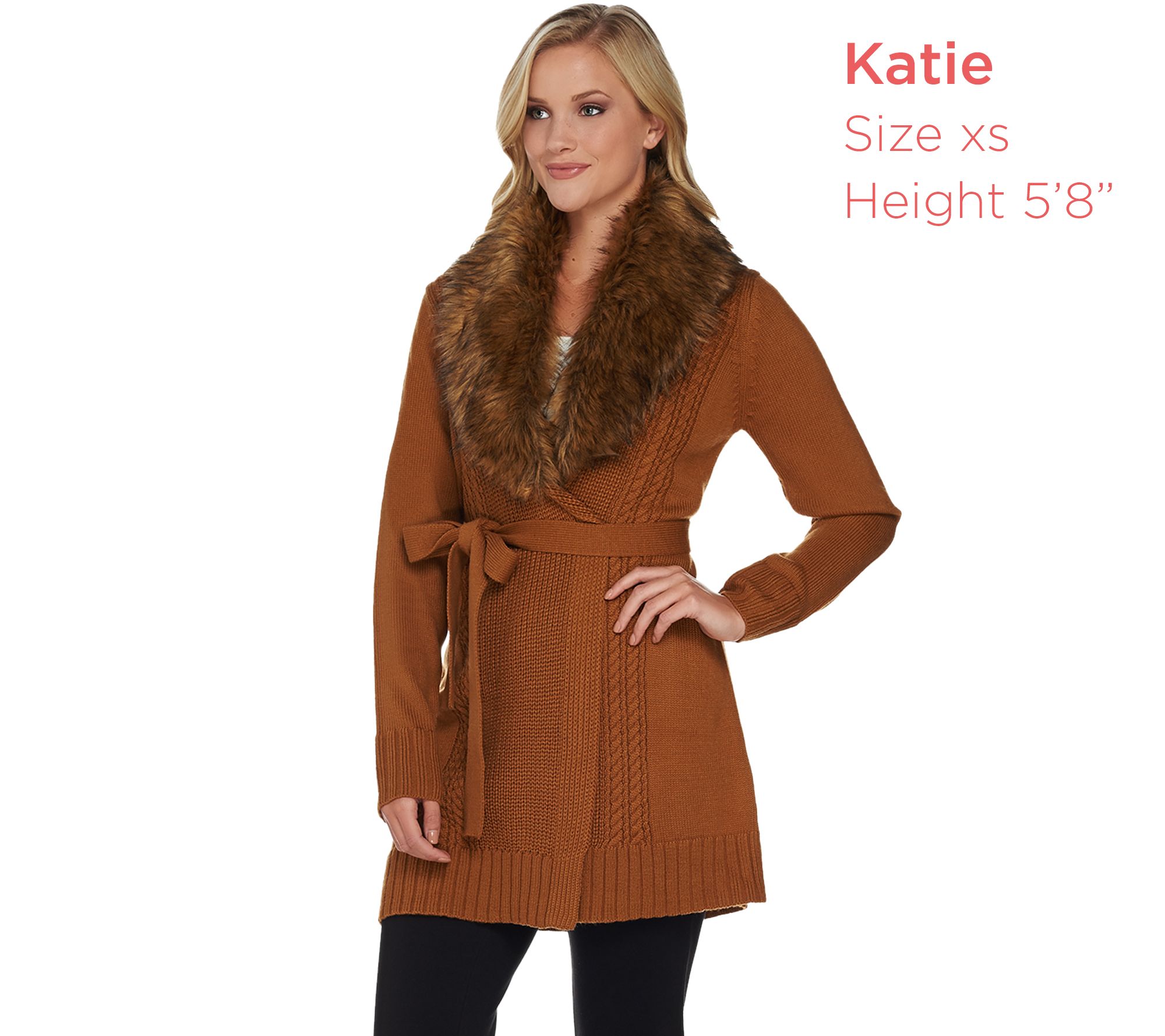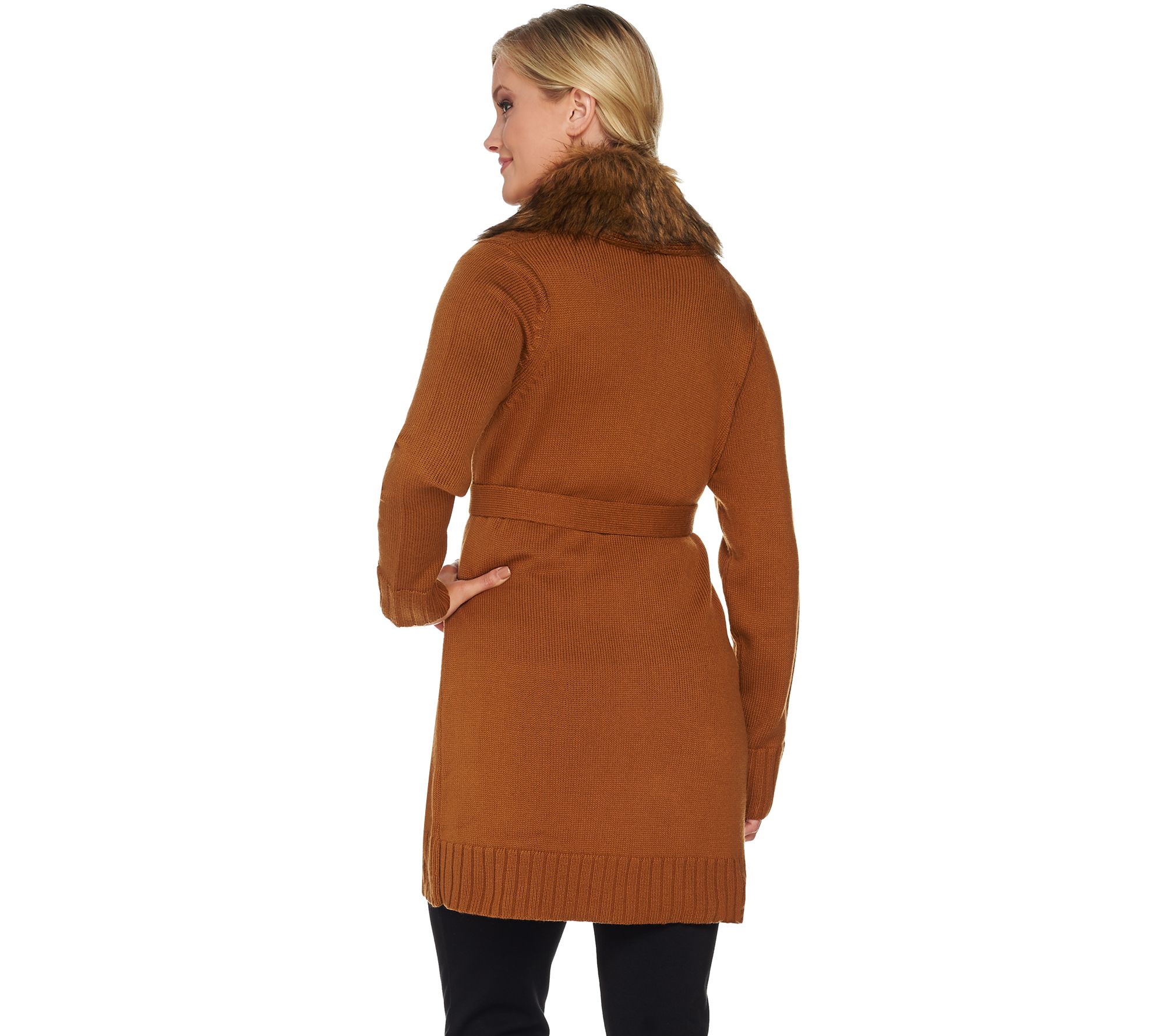 • Features: shawl collar, long sleeves, removable faux-fur collar, belt