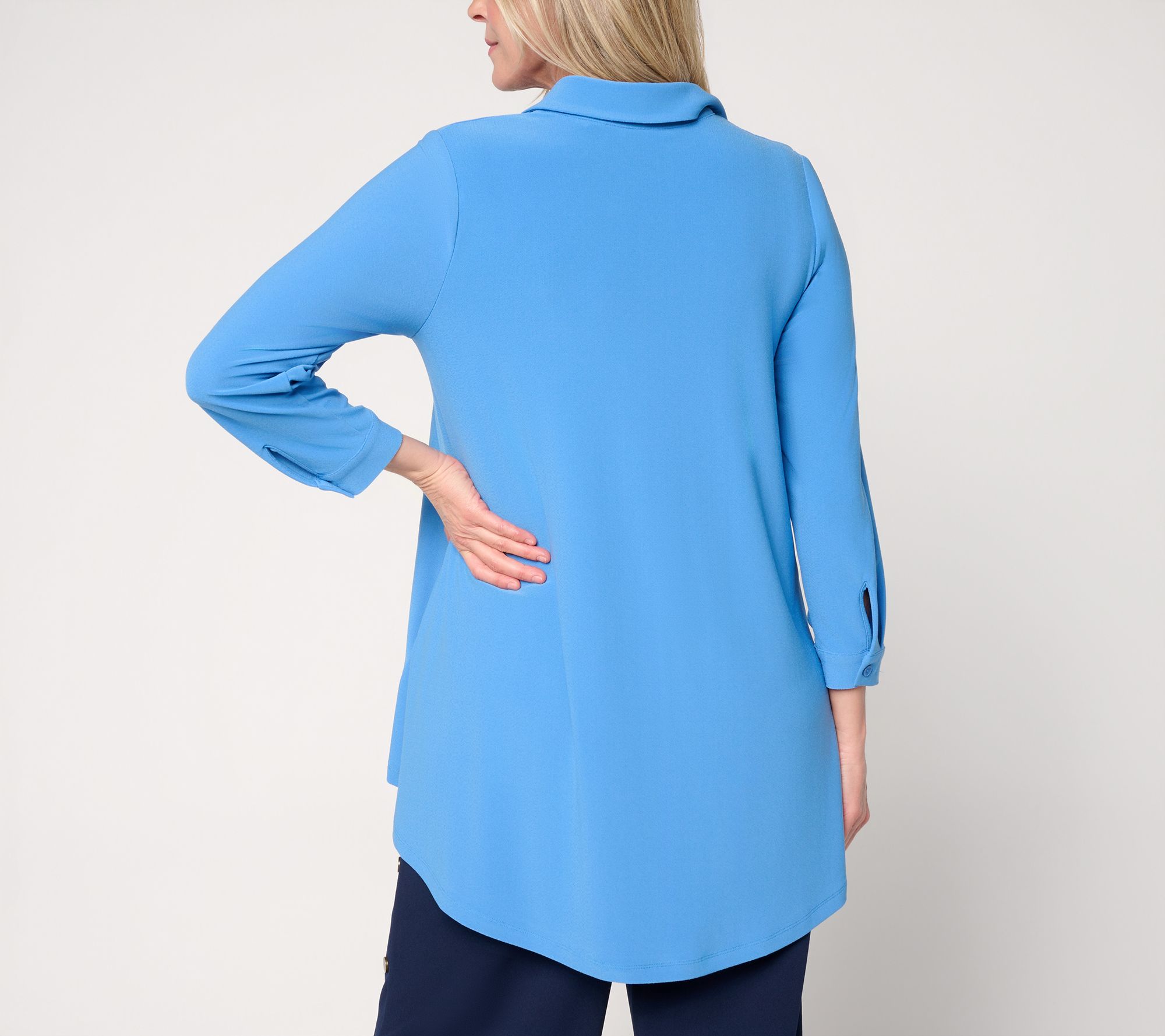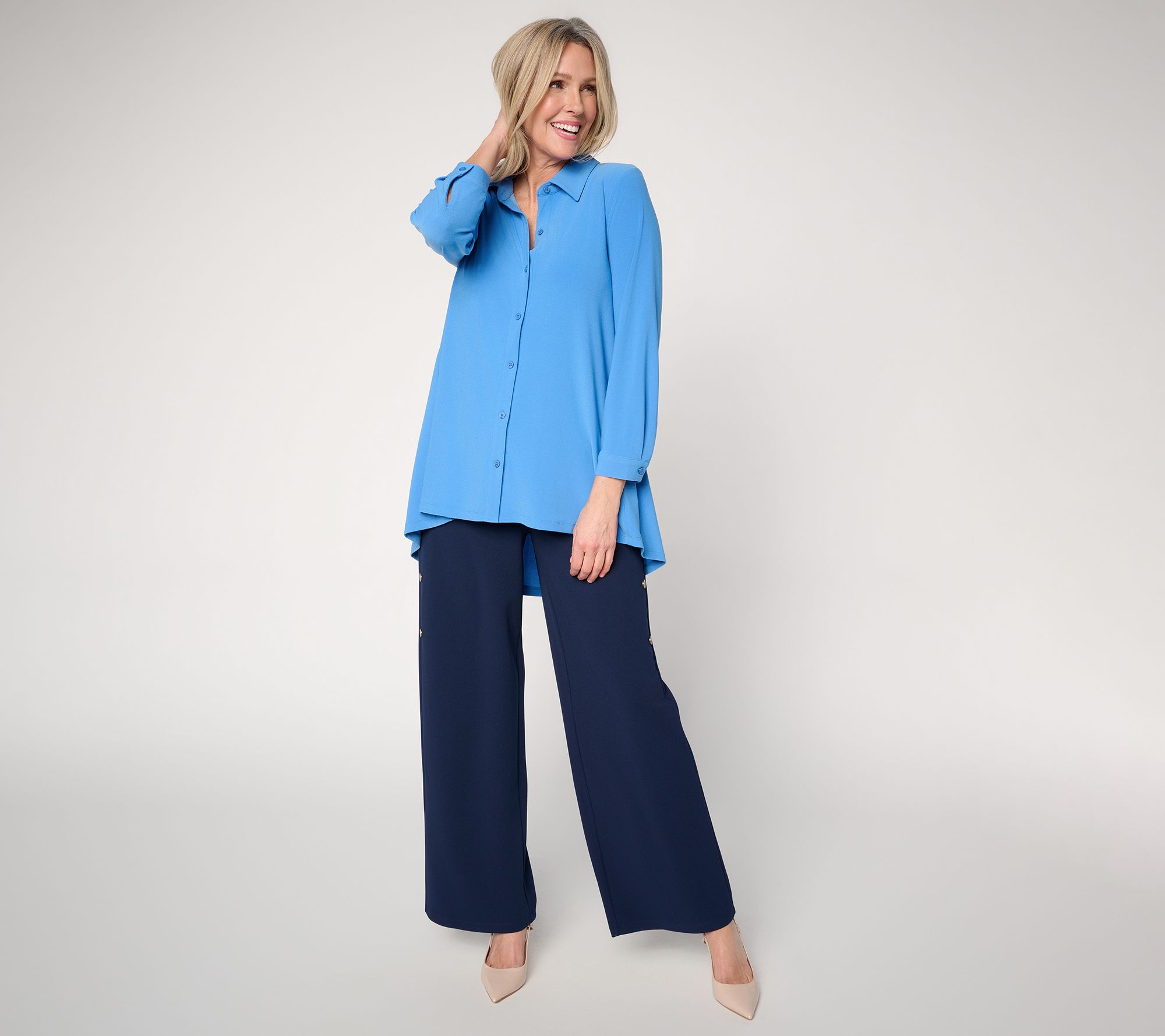 You know it's special when it's Caviar! The classic button-down top is reimagined with this elevated version from Dennis Basso. Crafted in his drapey Caviar Crepe knit, the fluttery find features angled side seams and a hi-low shirttail hem that catches the breeze with every step. Thank you, we'll have another (color). From Dennis Basso.