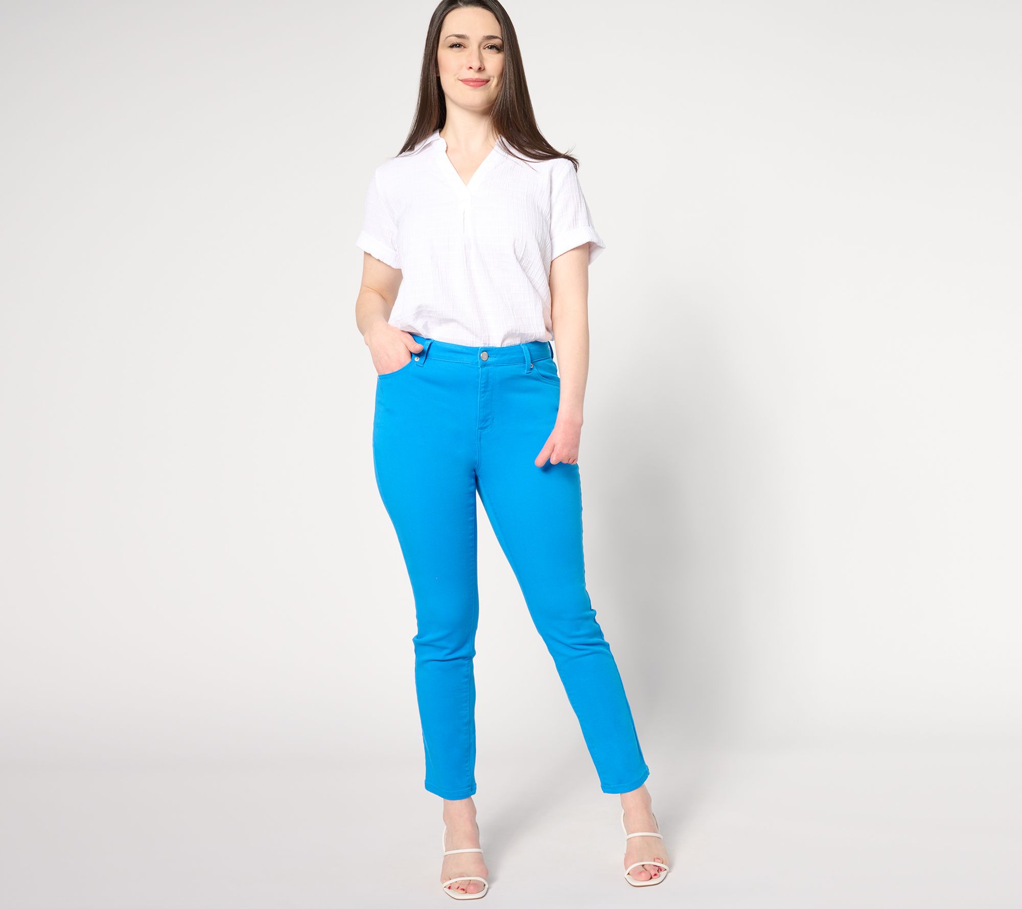 Tried-and-true denim blues are basics no wardrobe should be without. But a pop of color to perk up your OOTD options would be nice, too! These colored twill jeans are just what your closet ordered (in a footwear-friendly ankle length!). From Dennis Basso.