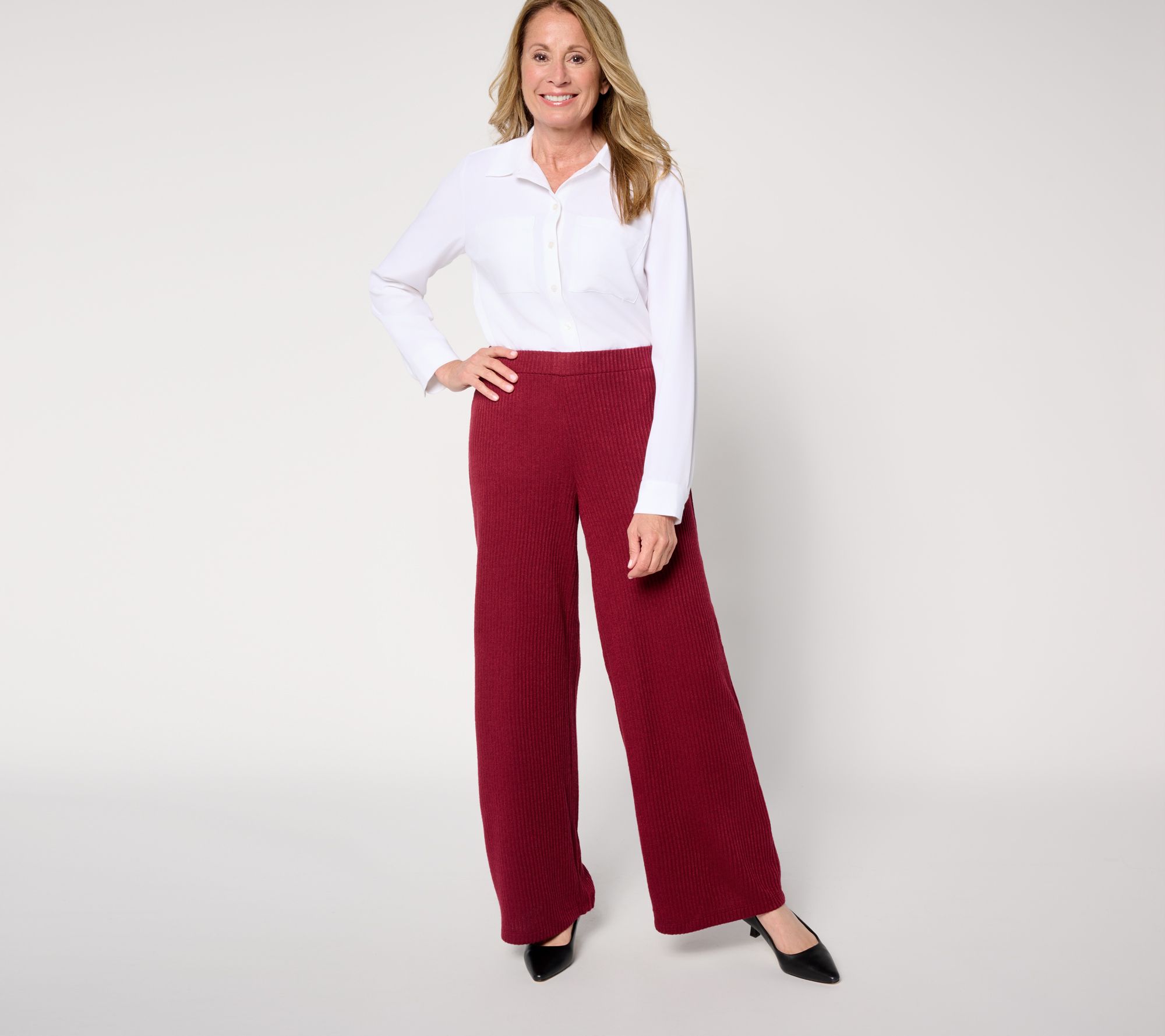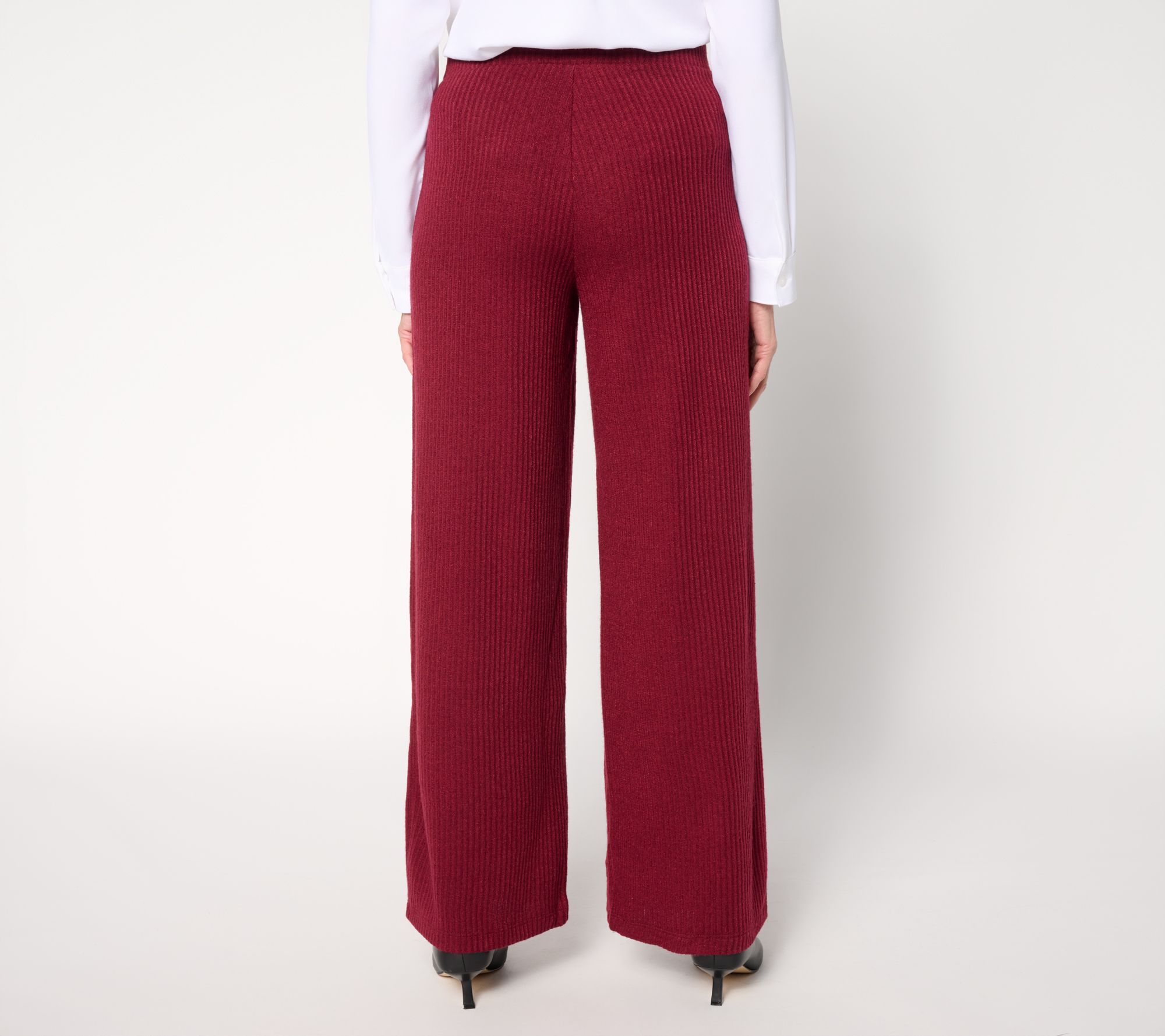 Busy days and cozy nights both call for these wide-leg pants. The easy rib-knit and pull-on styling team up to offer the ultimate blend of style and comfort, while the elastic-banded waistband lets you move with ease from morning coffee runs to evenings at home. From Dennis Basso.