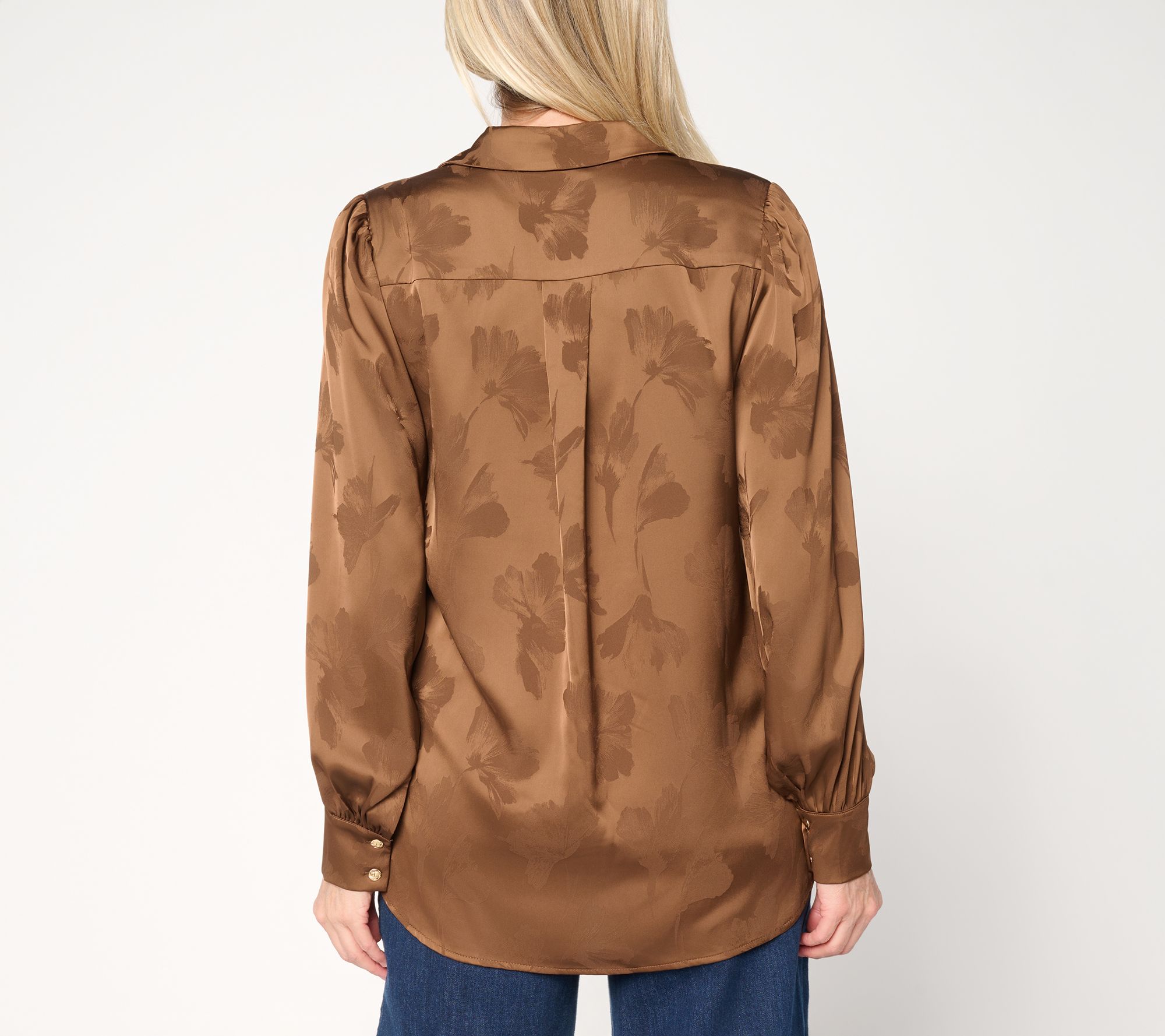 • Features: button-front closure, Y-neck with notch collar, floral pattern, full long full sleeves with wide sleeve cuff, soft shirttail with side slits