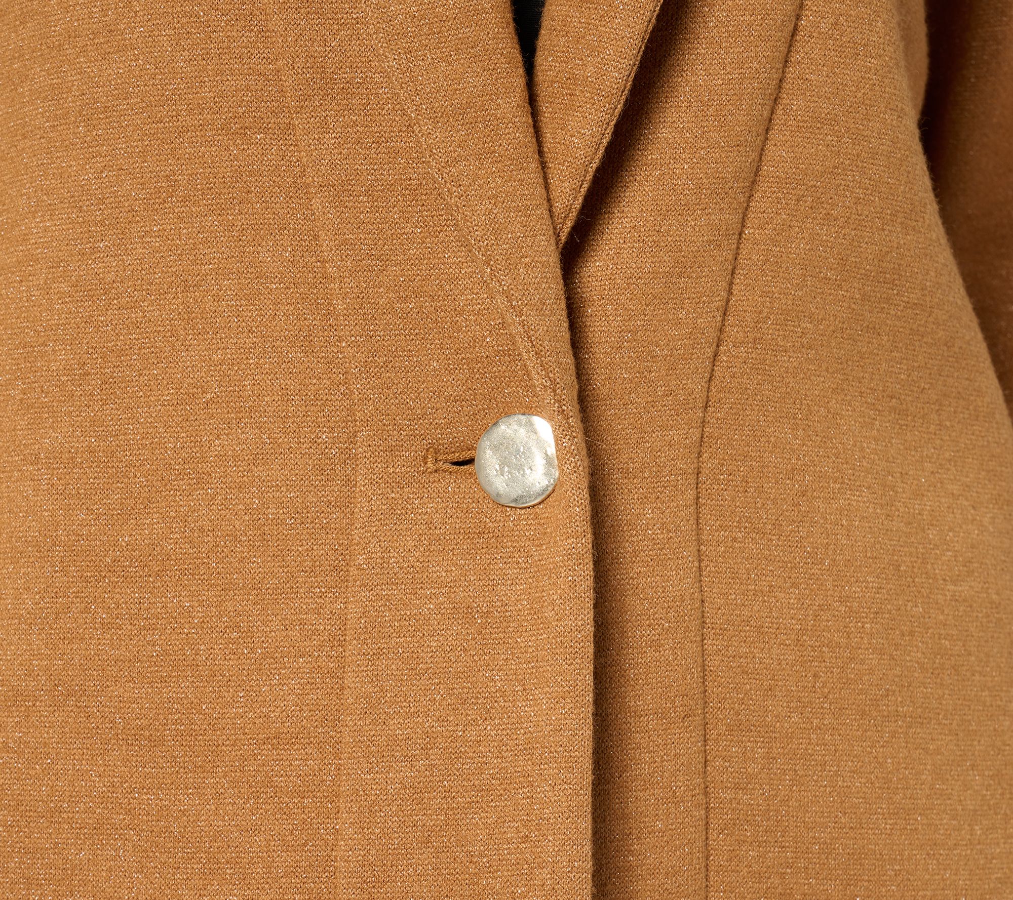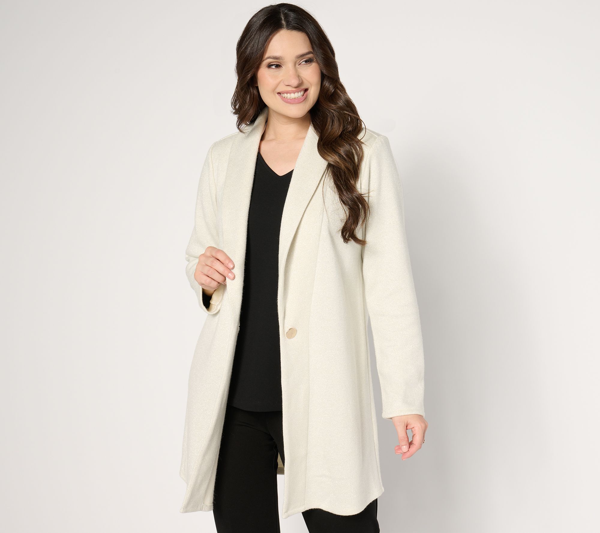 Features: long sleeves, shawl collar, single button closure