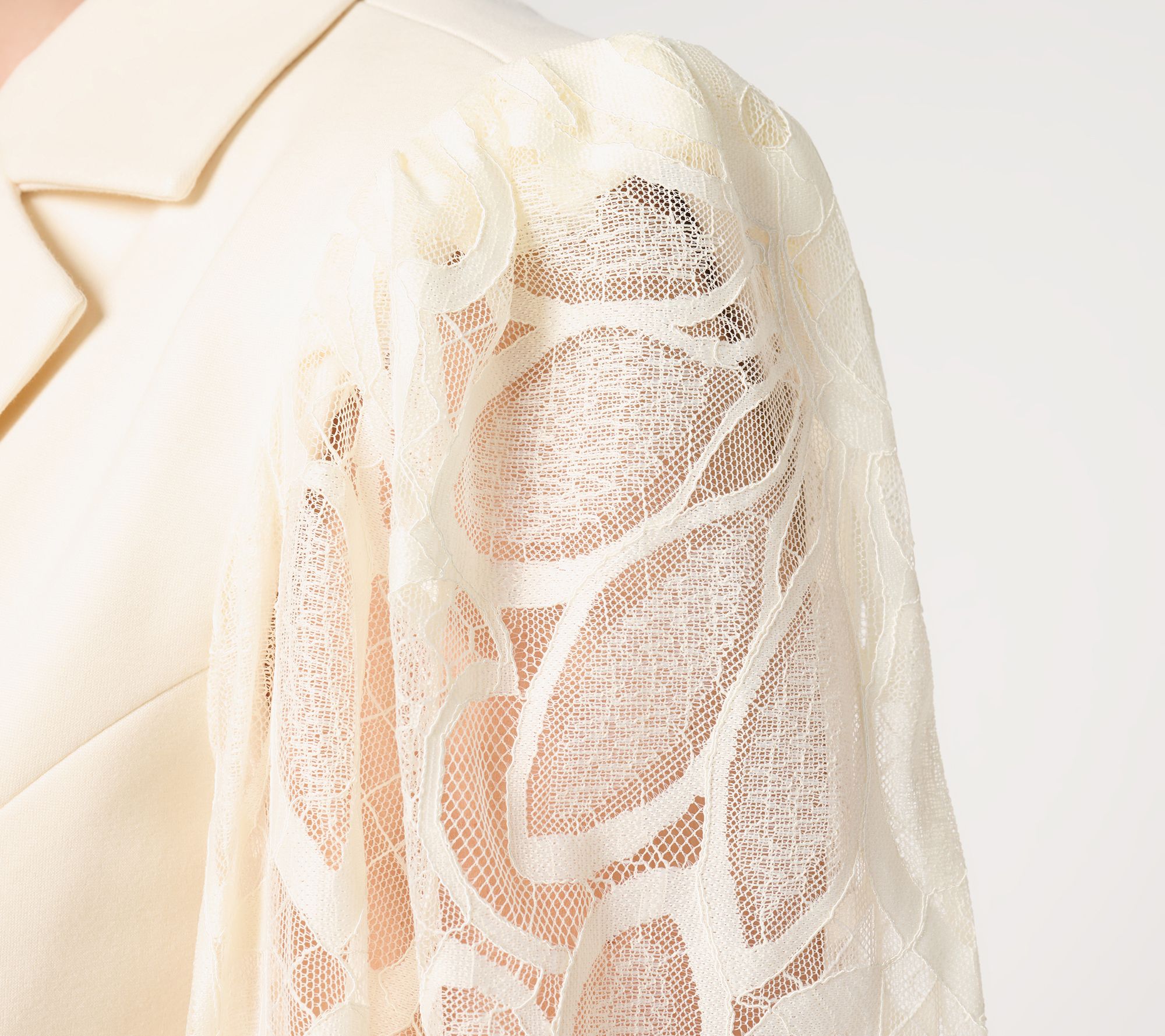 Fabrication: ponte knit body, lace sleeves with elastic openings