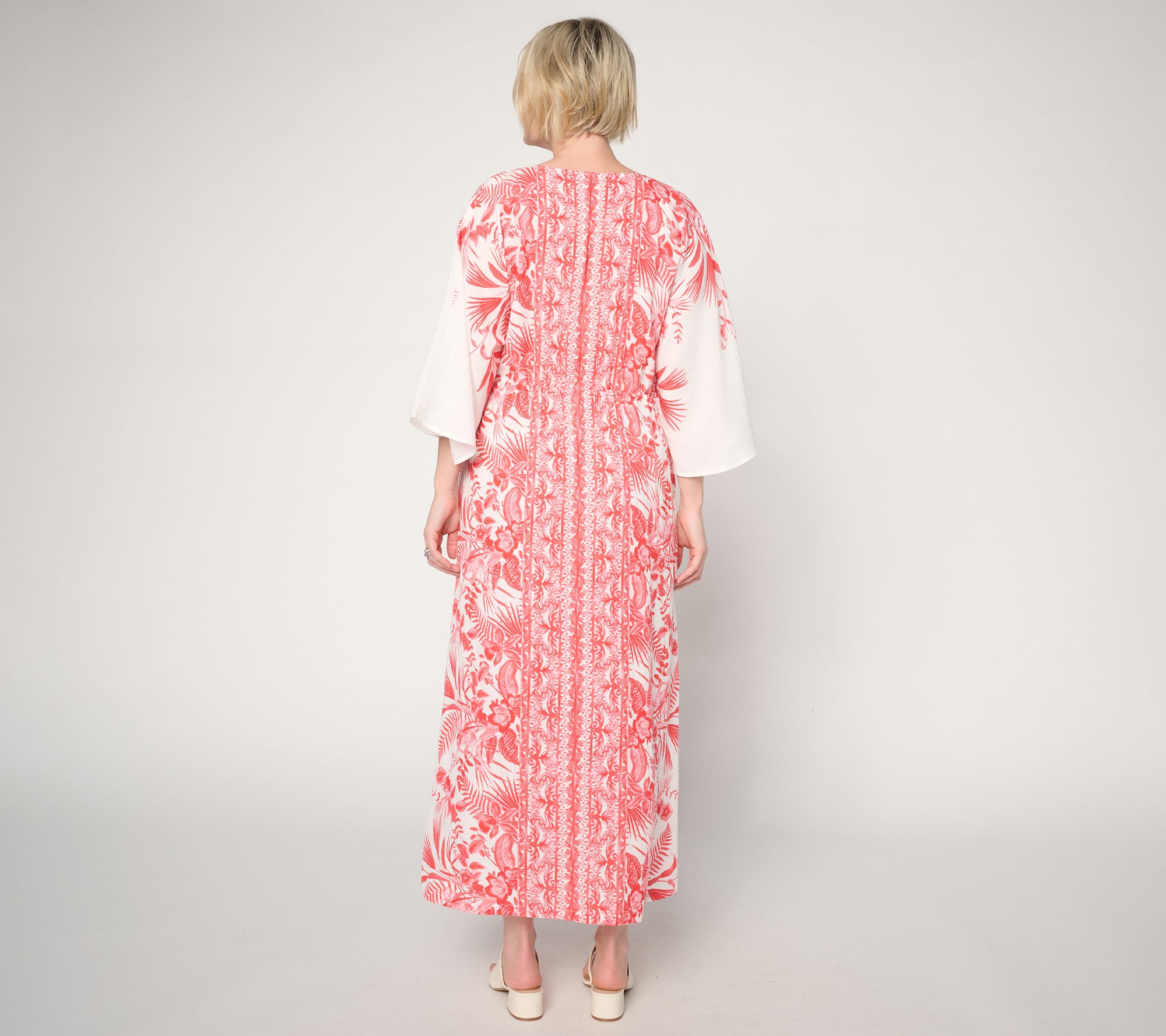 Unwind on a weekend getaway or enjoy downtime at home with this printed kaftan dress that prioritizes comfort and vibrant style. A deep V-neckline adds a hint of drama, while the adjustable drawstring waist lets you customize the silhouette. Side seam pockets bring a helpful touch for your essentials. From Dennis Basso.