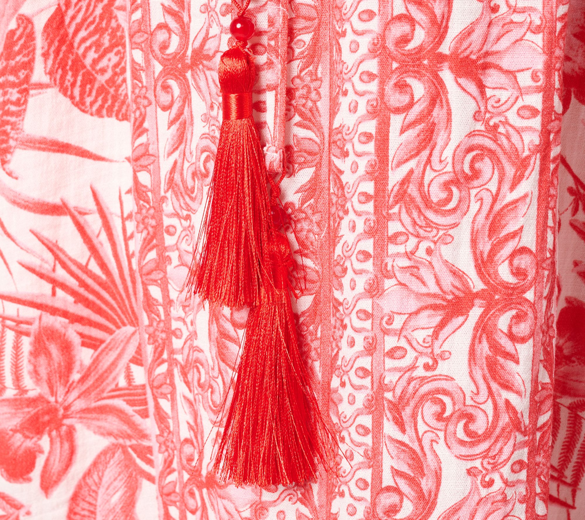 Features: placement print, long kaftan style, deep V-neckline, adjustable drawstring waist, side seam pockets