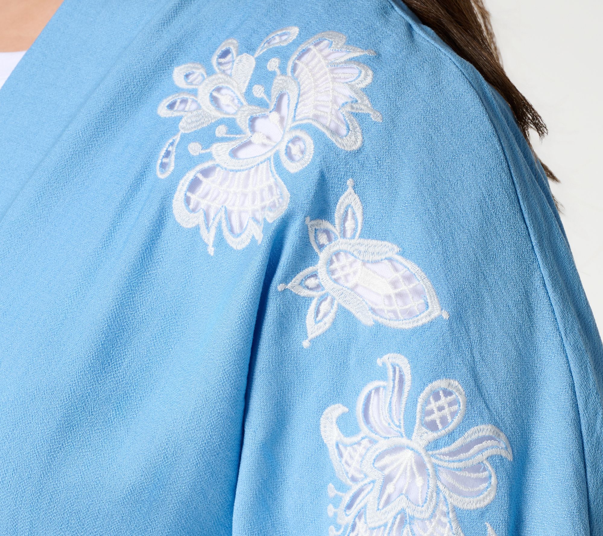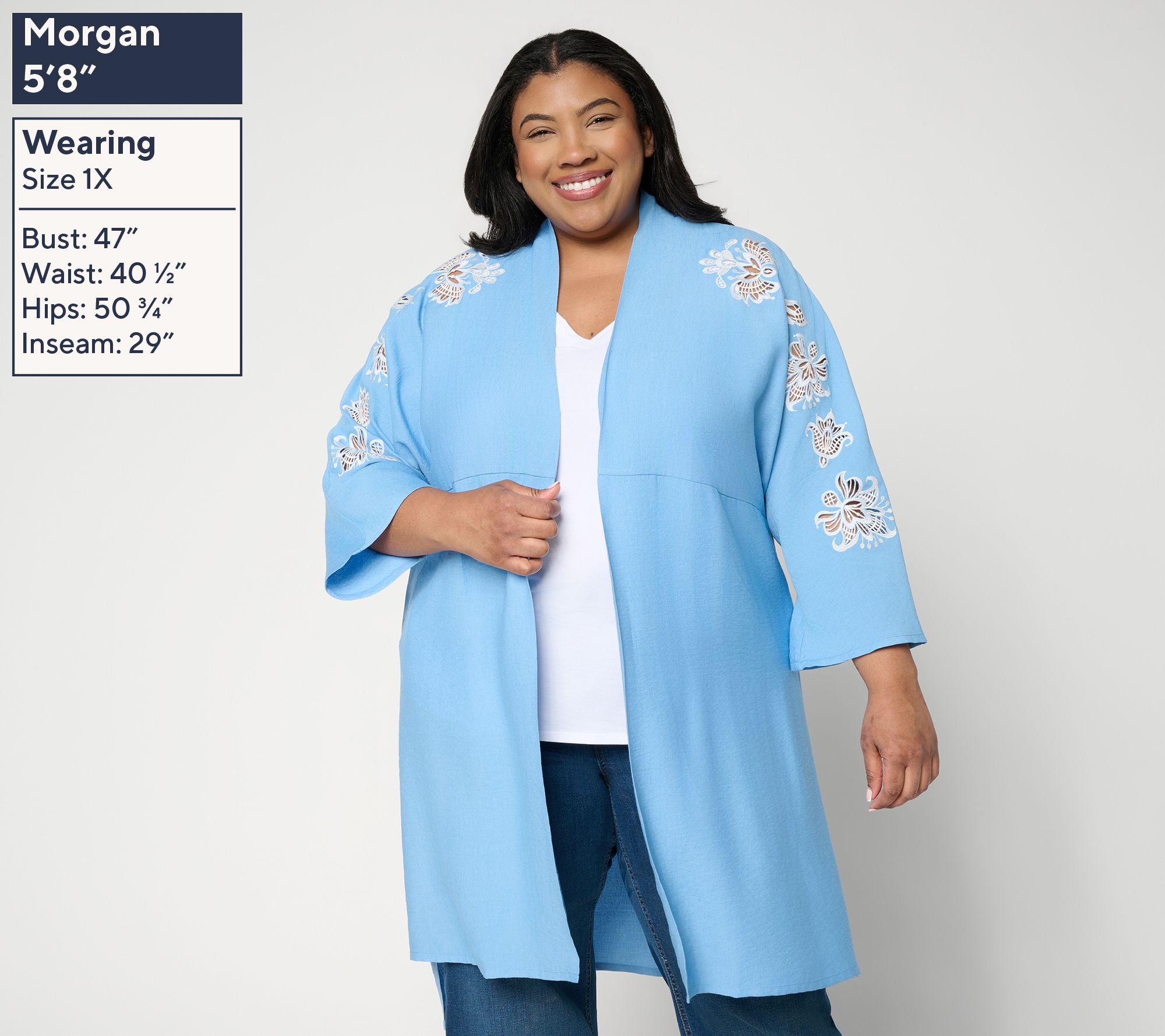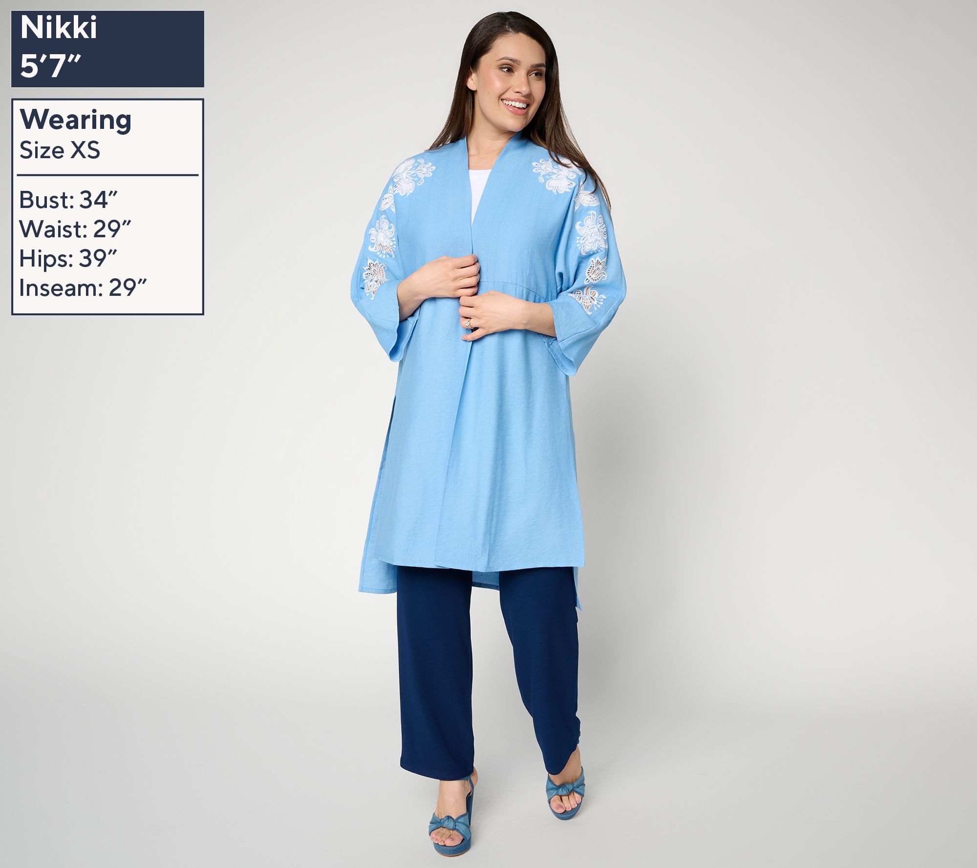 Love a stand-out finishing touch? This woven duster brings sophistication to any moment, from special dinners to a stroll downtown. Detailed embroidery at the shoulders and sleeves adds a fresh twist, while side slits and a hi-low hem create an easy-moving, graceful layer over your favorite tops and dresses. From Dennis Basso.