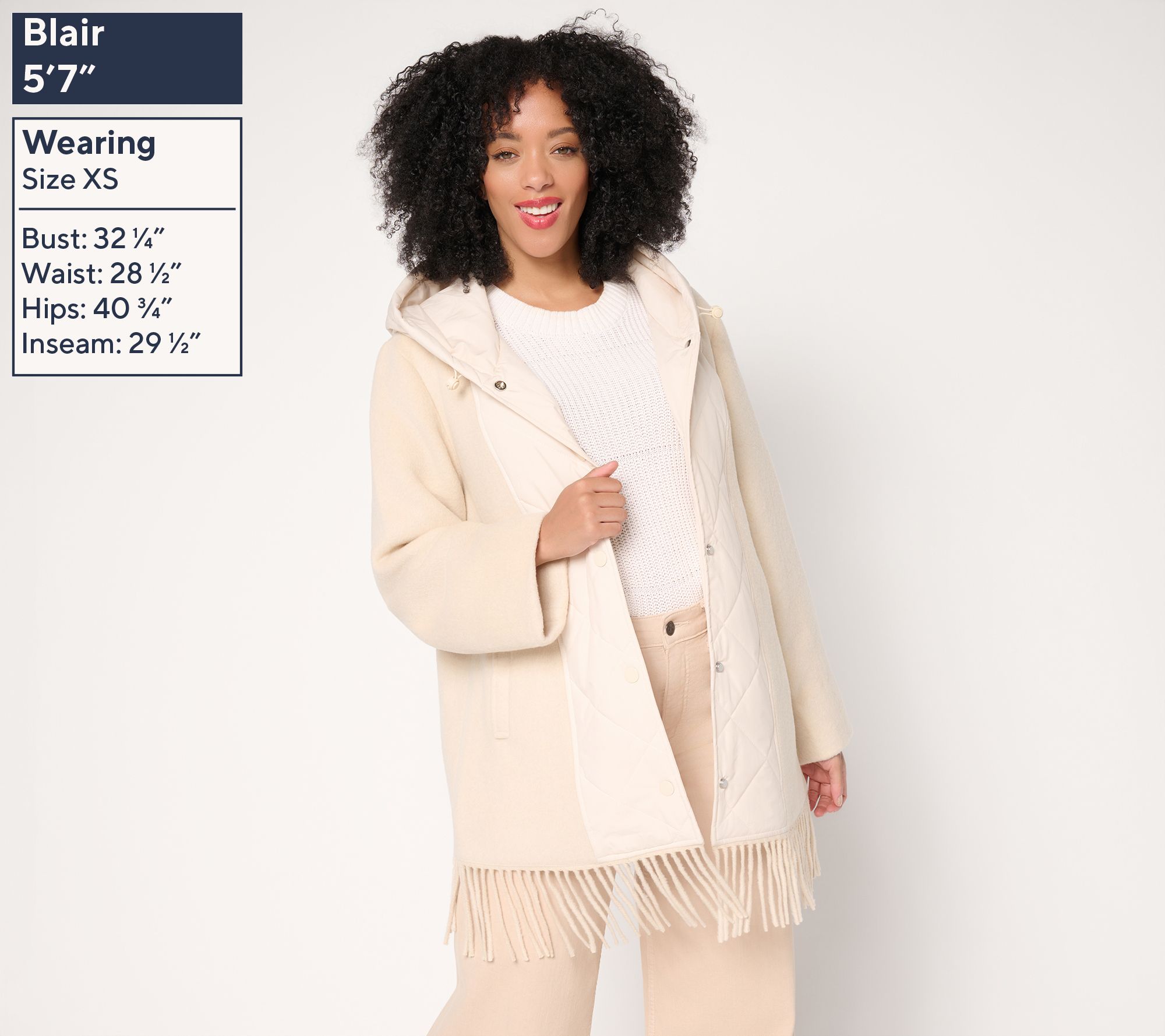 • Features: diamond quilting at center, drawstring at hood, welt pockets, long sleeves, fringe at bottom, fully lined