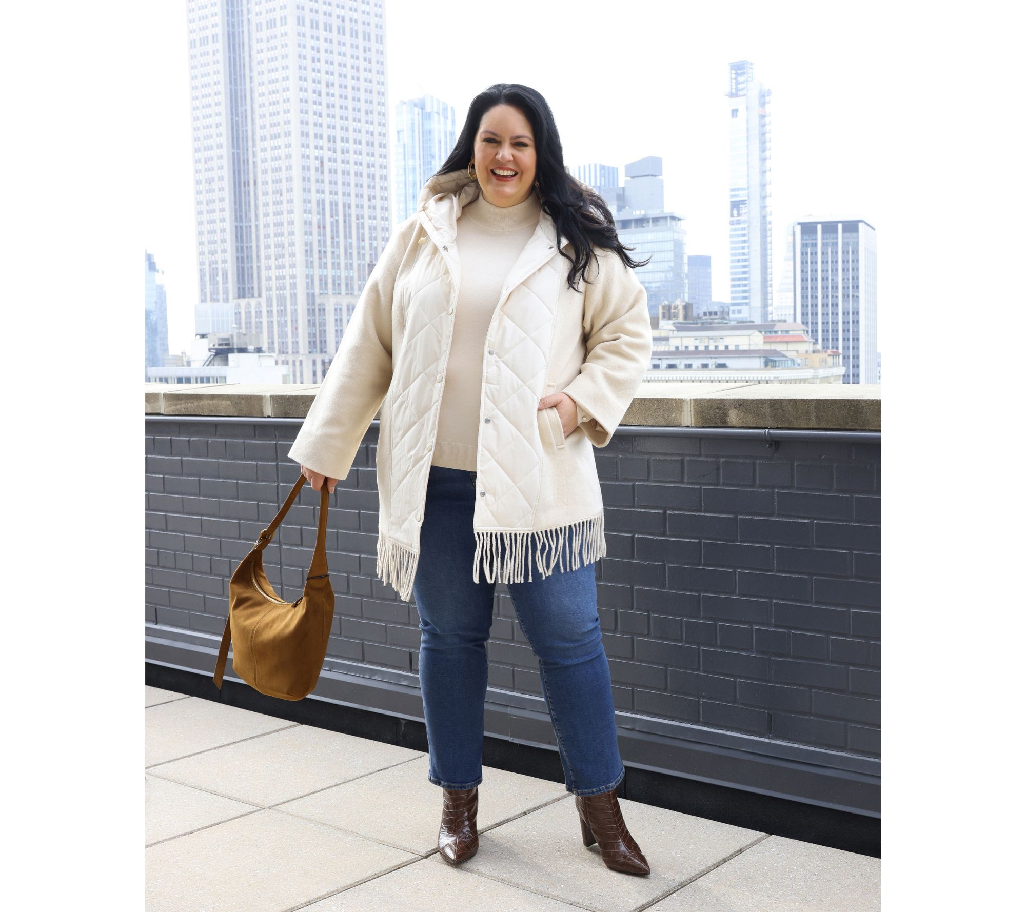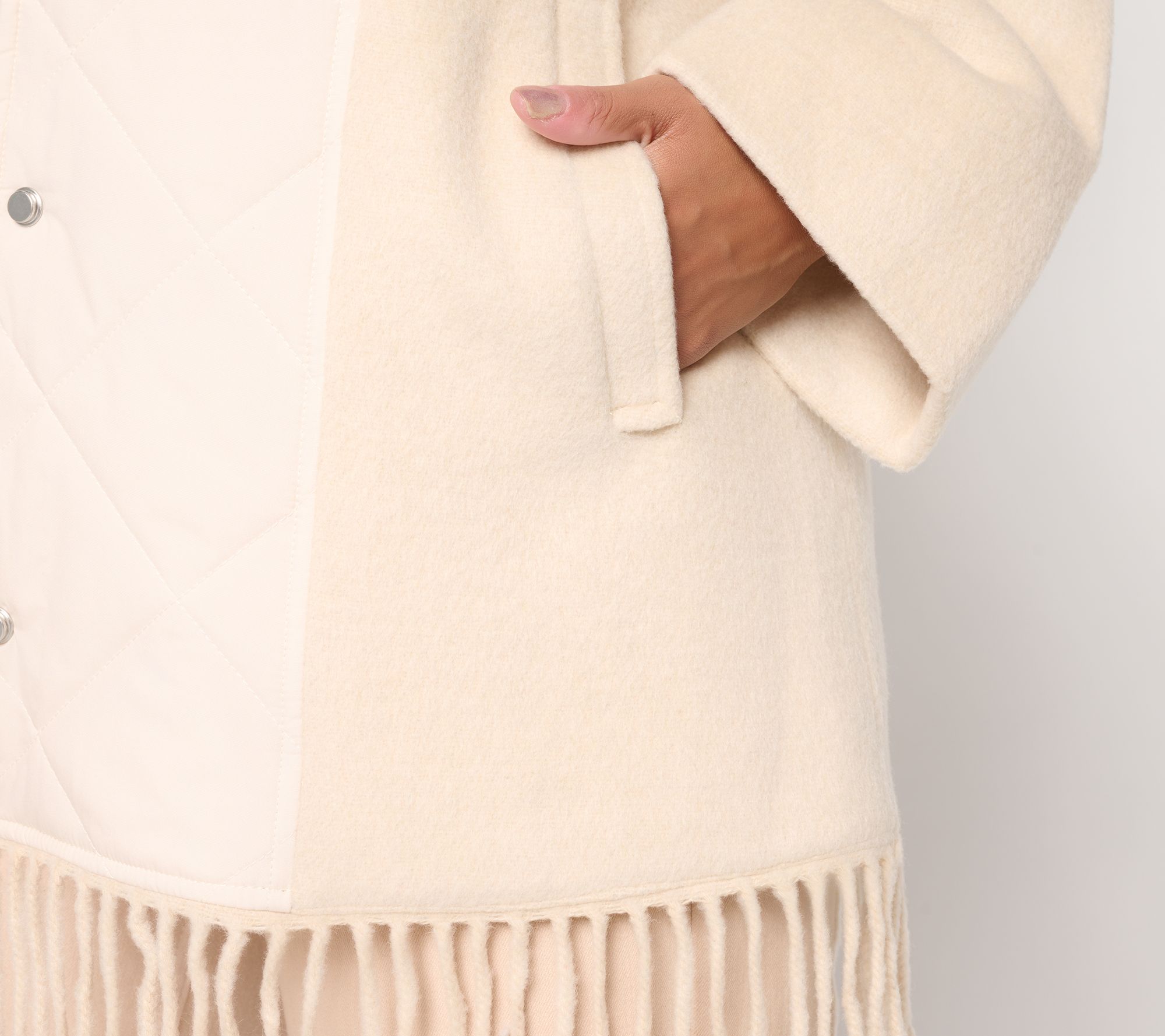 For city strolls or outdoor gatherings, this mixed media capelet wraps you in warmth and flair with its cozy wool-blend body, modern diamond quilting, and a playful fringe at the hem. The drawstring hood, snap-front closure, and welt pockets offer both comfort and versatility, making it an easy layer for any cool-weather plan. From Dennis Basso.