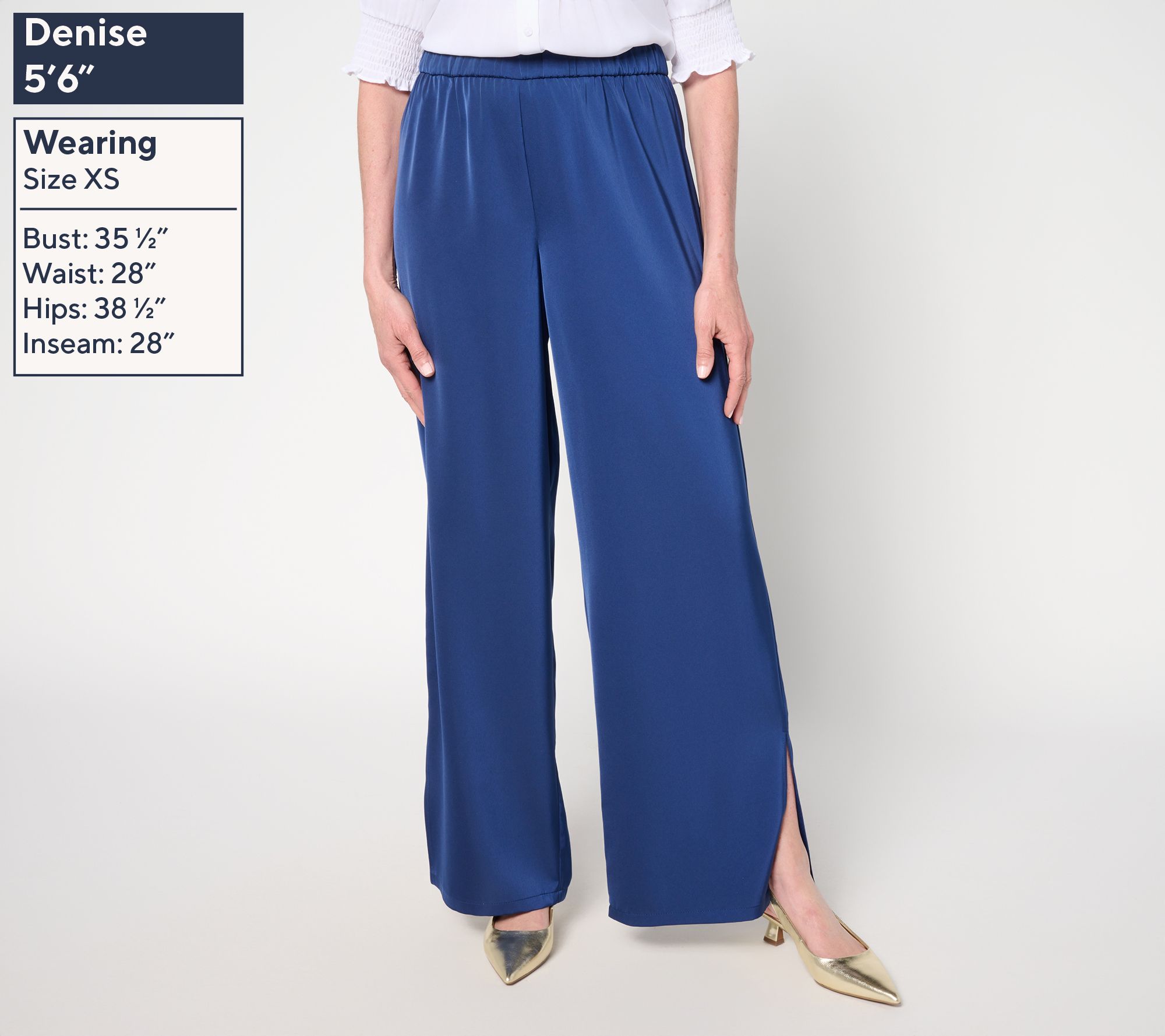 Sashay all day (and into the night) with these showy, flowy pull-on pants from Dennis Basso. You can count on comfort without compromise along with a look that impresses in an instant. Go from conference-room conversations to dinner at eight (don't be late) in wide-leg perfection -- that side slit is so strike-a-pose-worthy! From Dennis Basso.