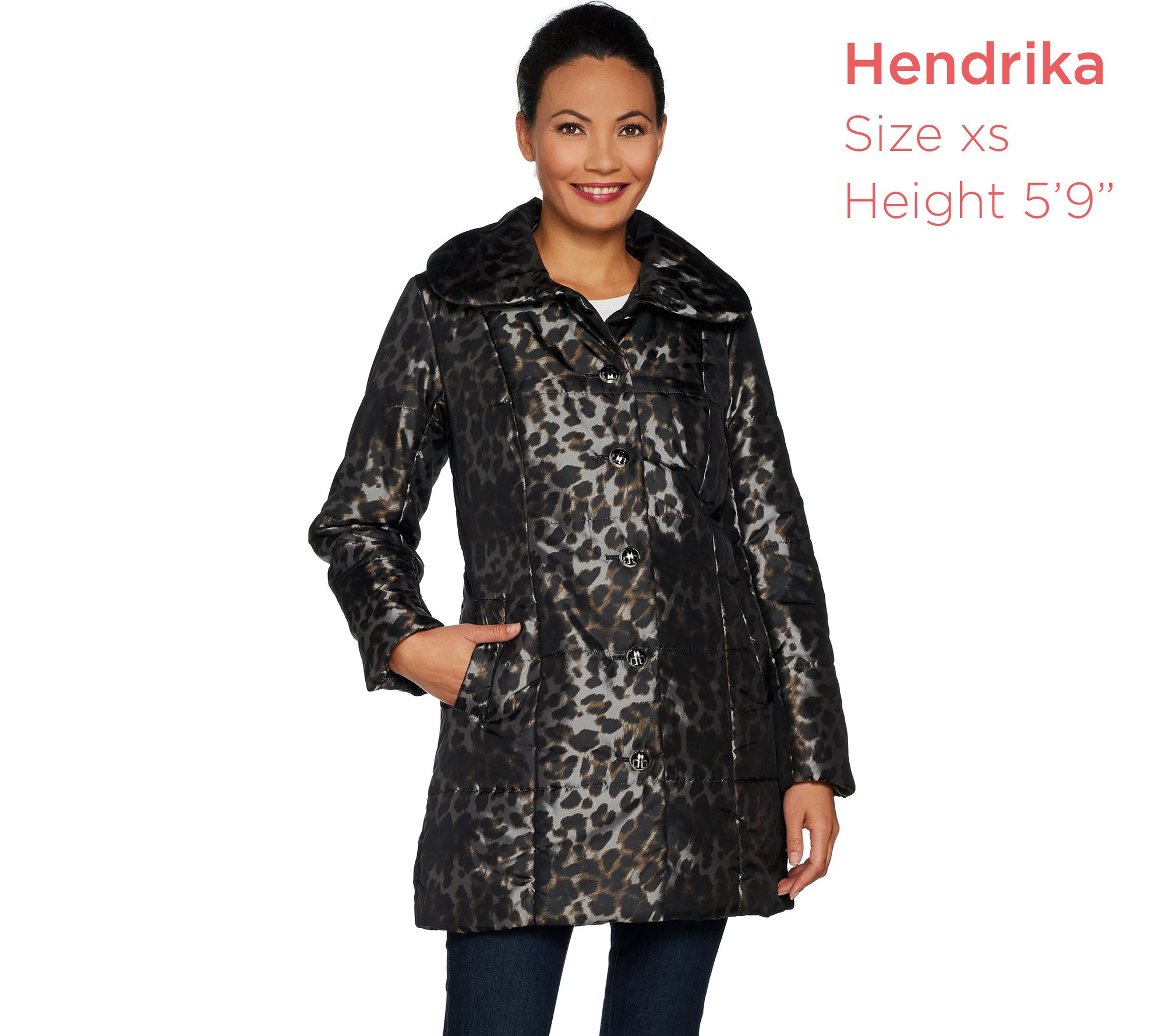 - Features: water-resistant, leopard print, quilted design, envelope collar, button-front closures, angled welt pockets, long sleeves, mixed animal-print lining