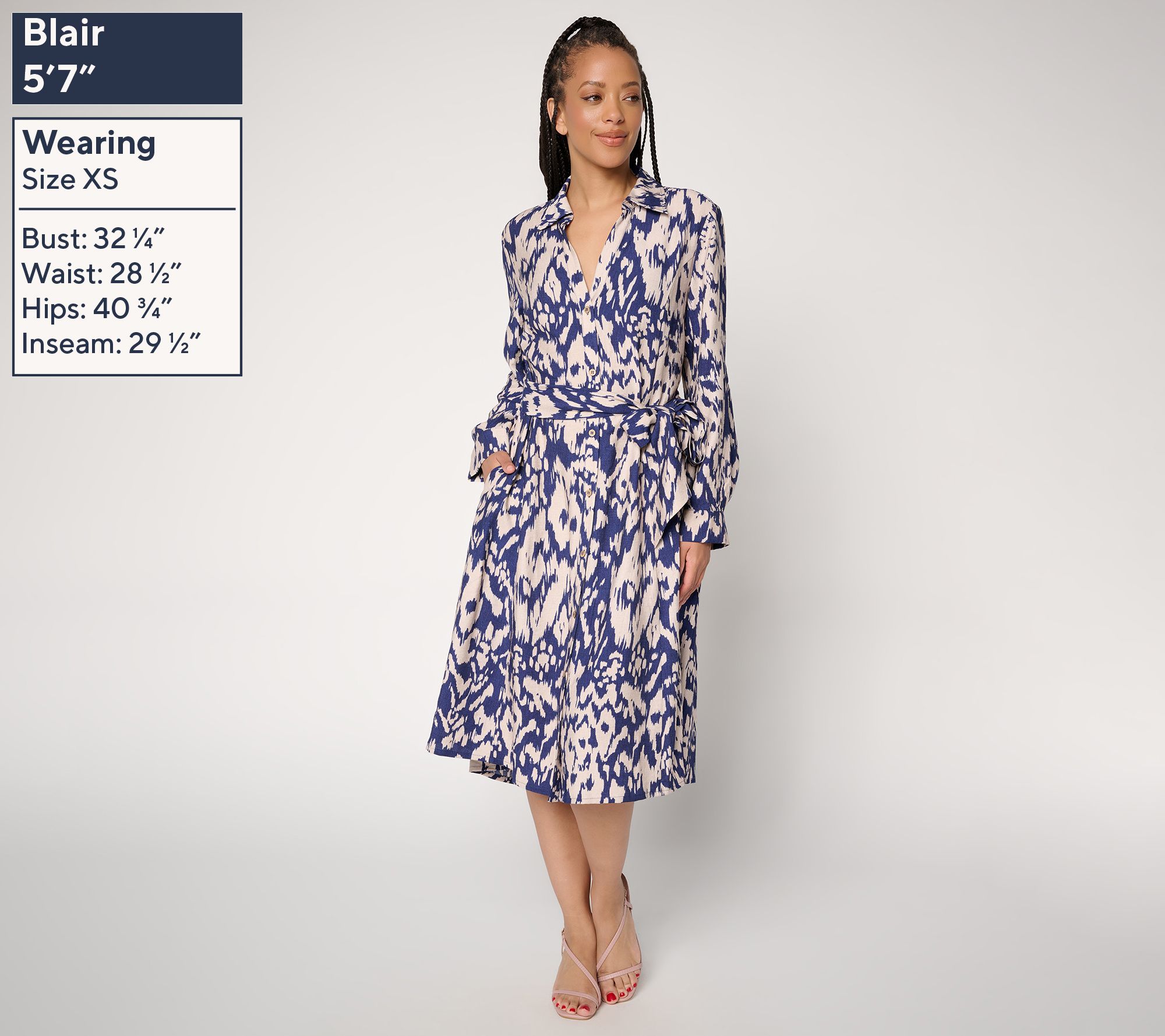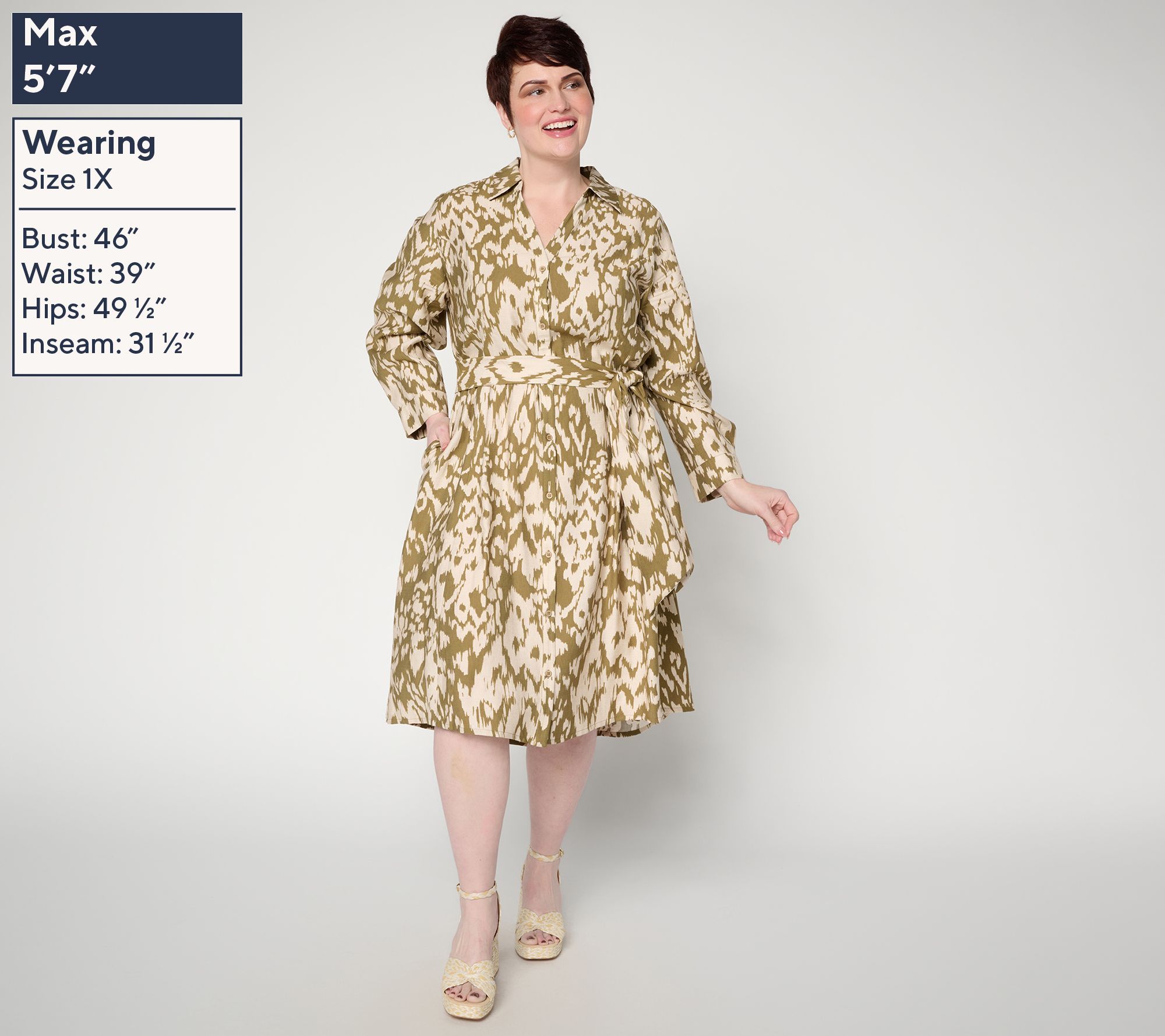 Dennis Basso Regular Drapy Ikat Button Front Shirt Dress. Woven. Semi- fitted, follows the lines of the body with added wearing ease. Length: missy: 43 1/2" - 45 5/8" plus: 46" - 49 1/2". Care: MWC/TGIO/ON CBWN/LD/LIIN. Content: 87% rayon, 13% nylon. COO: import. Features: printed woven shirt dress with front and back princess seams, collar a nd button front y-shaped placket. Long sleeves with cuffs that roll up side seam pockets and self belt. Shirttail hem. Unlined.