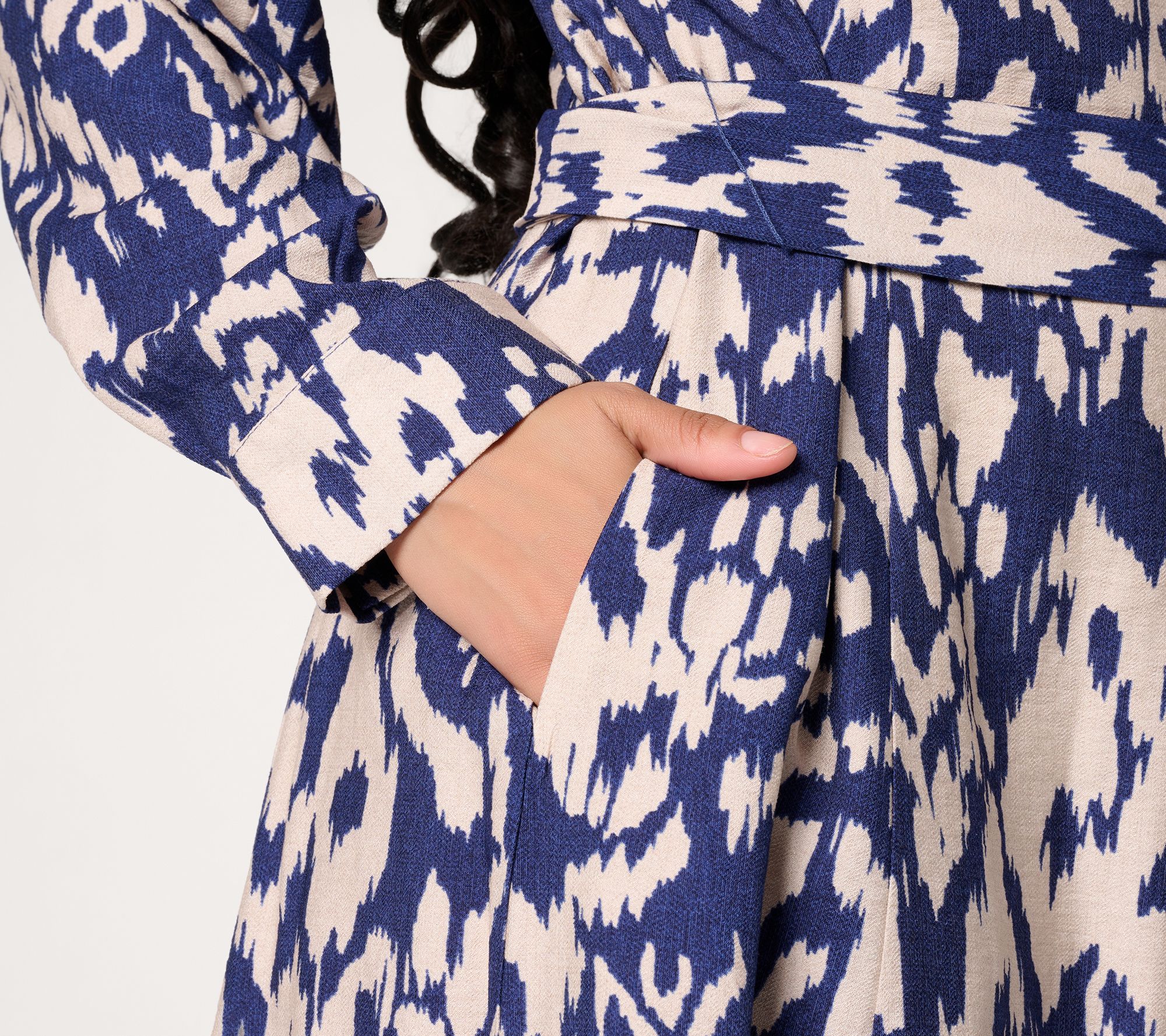 Features: ikat print, front and back princess seams, collar, button-front closure, Y-shaped placket, long sleeves with roll cuffs, side-seam pockets, self belt, shirttail hem, unlined