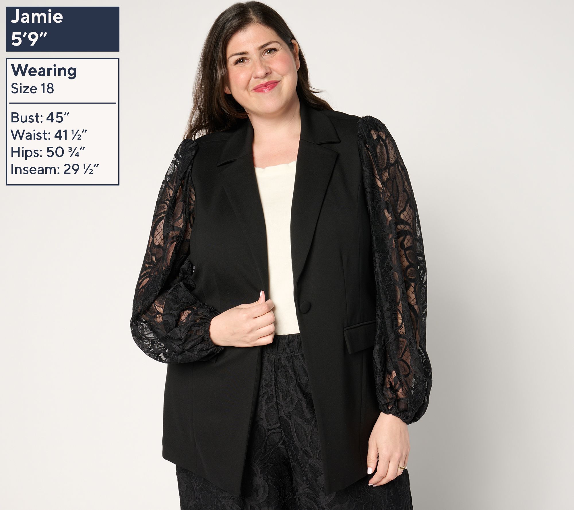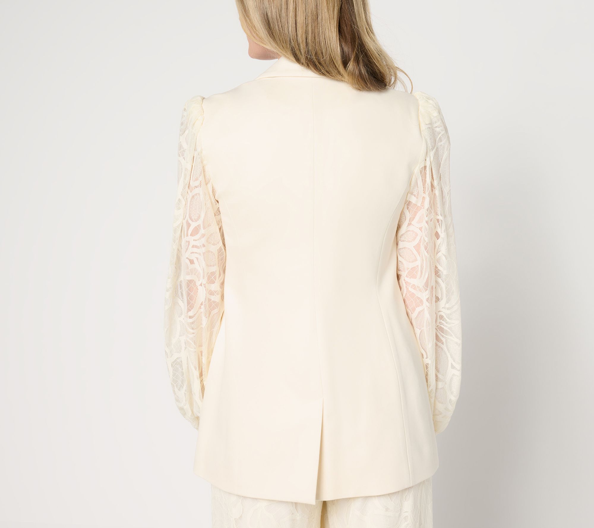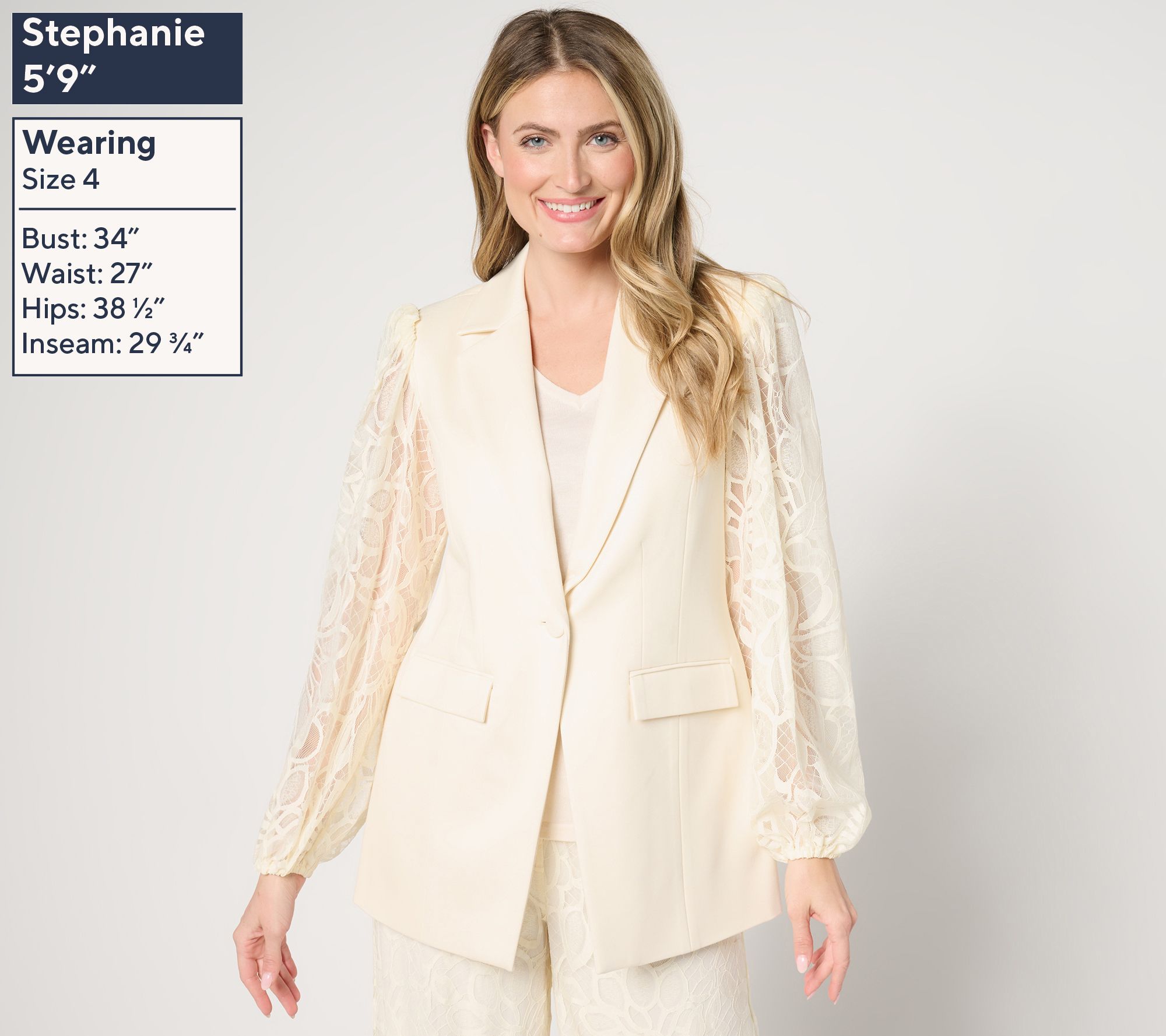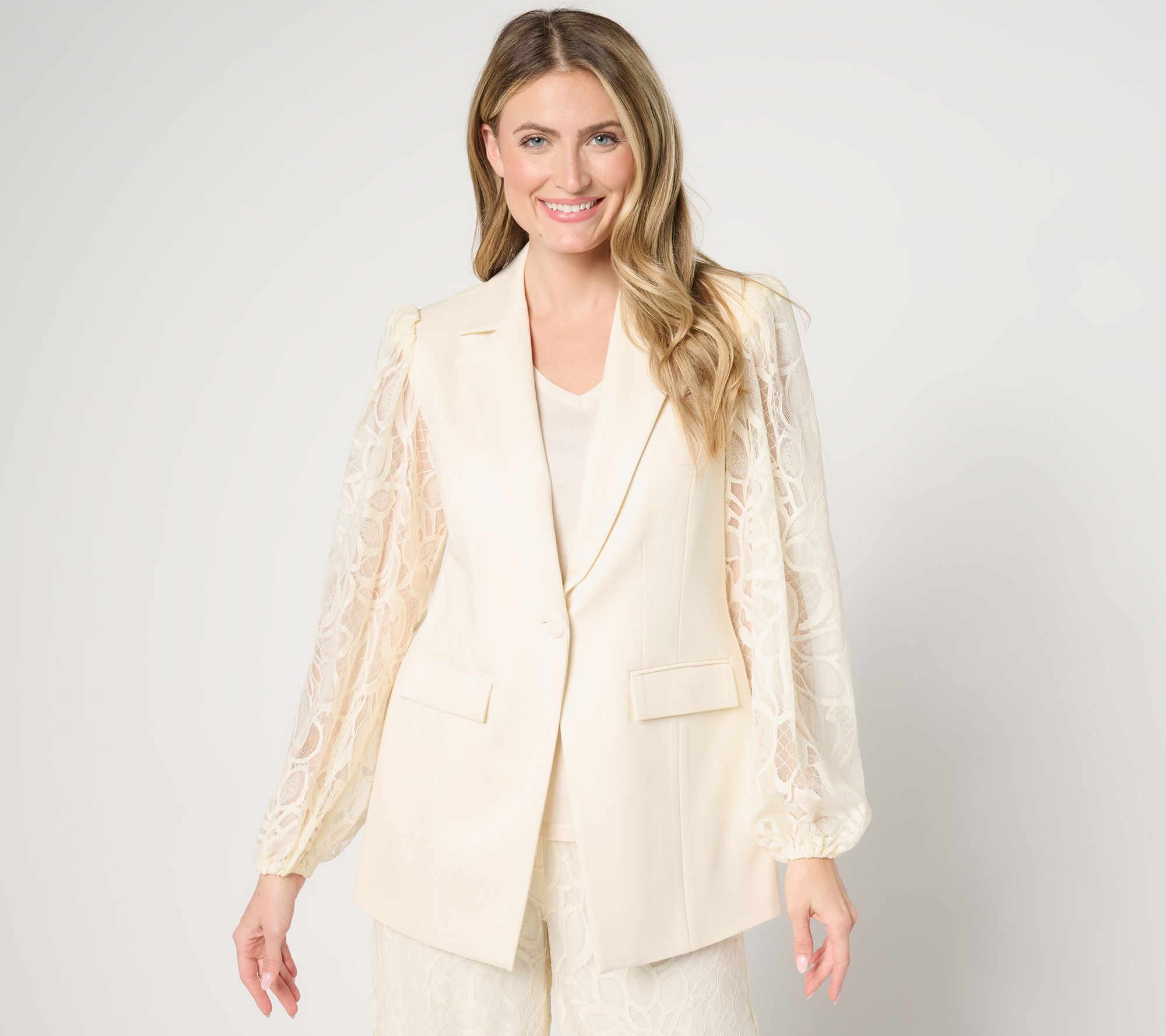 We love a statement sleeve -- and a statement blazer! Slip this ponte-meets-lace style on with wide-leg trousers or a simple sheath, and you've got a ultra-posh, polished look for your niece's wedding, best friend's birthday luncheon, or any splashy soiree. From Dennis Basso.