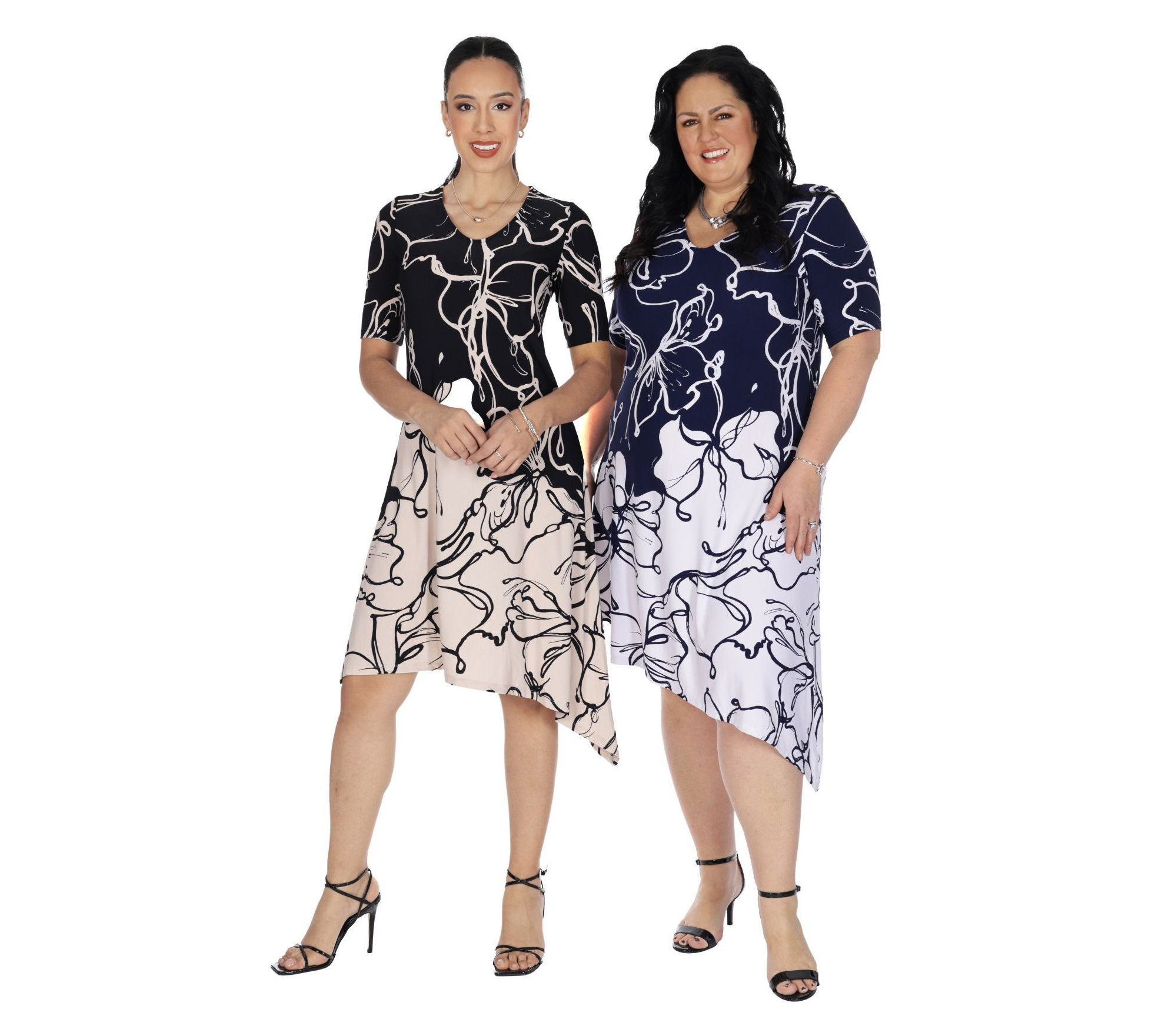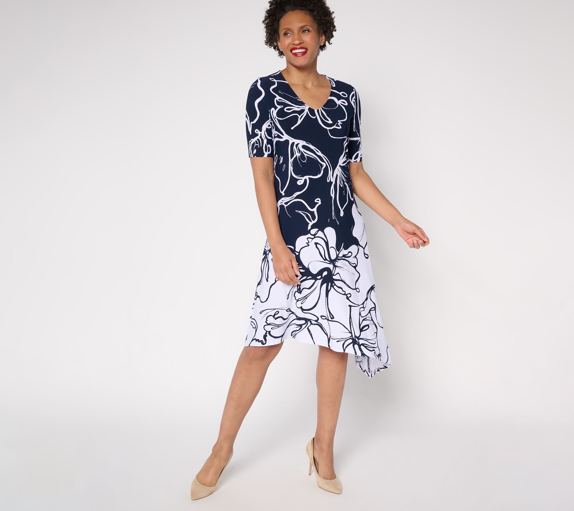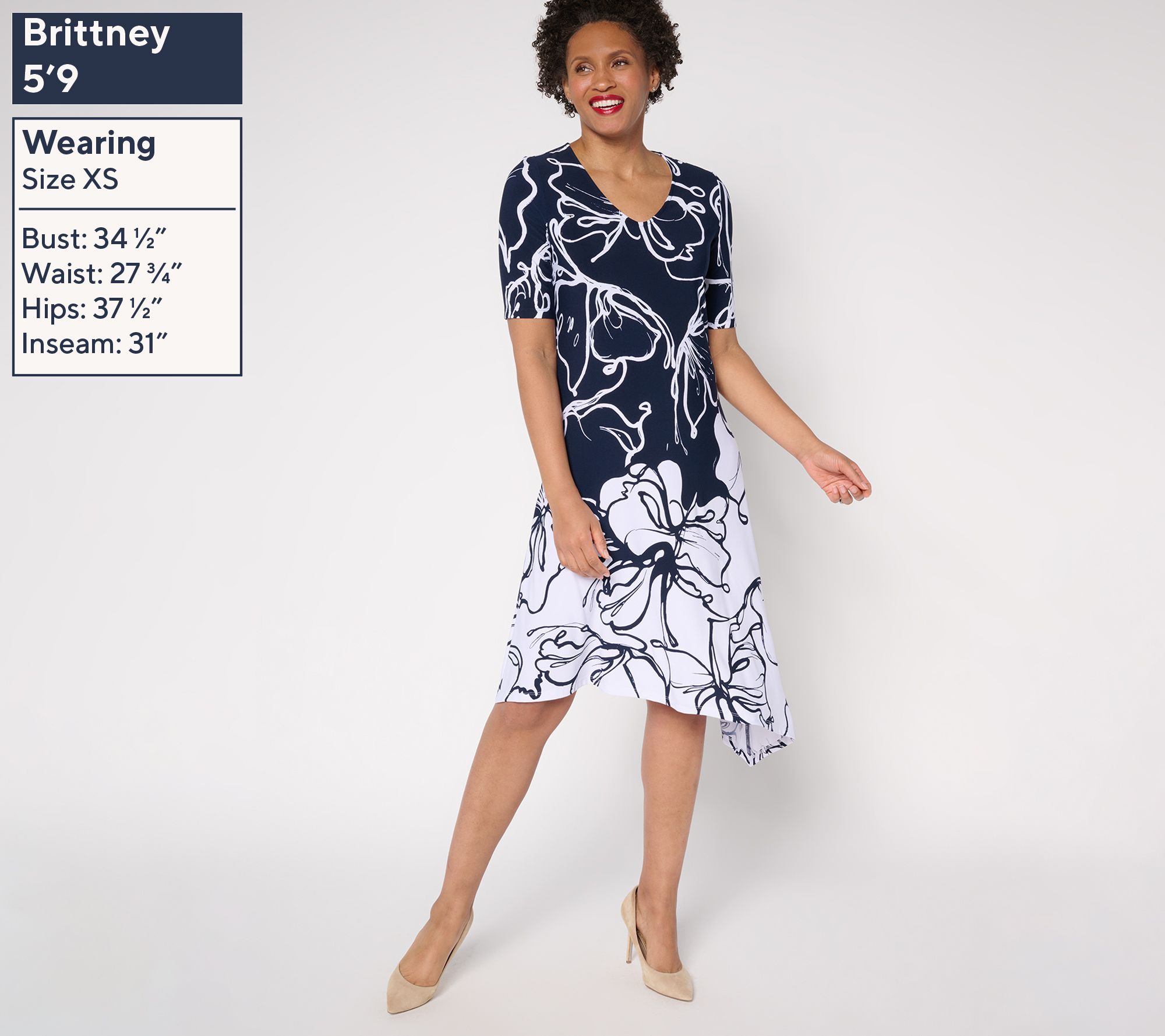 Features: printed design, elbow-length sleeves, V-neckline, asymmetric hem
