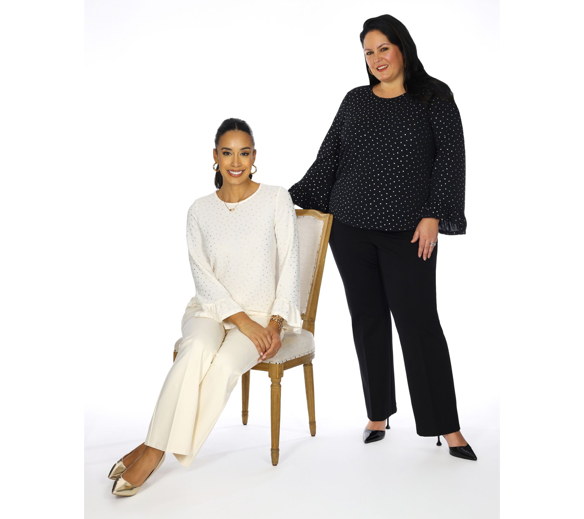 Features: gold foil dot details, pullover style, round neckline, curved hem, long flounce sleeves with ruffle