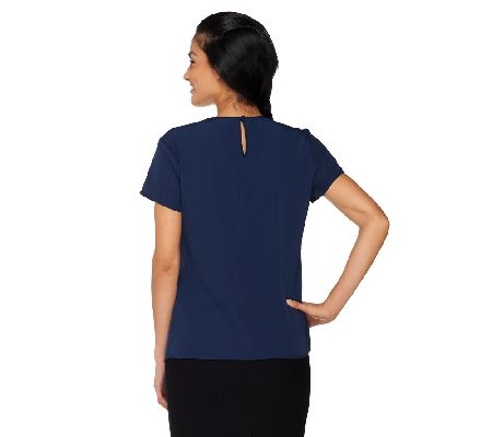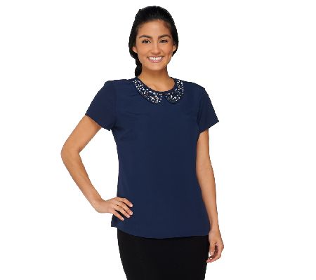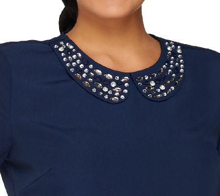 With an embellished Peter Pan collar, this Dennis Basso top glitters with elegant glamour. A single button-and-loop closure in the back keeps this fitted top snug and secure. From Dennis Basso.
