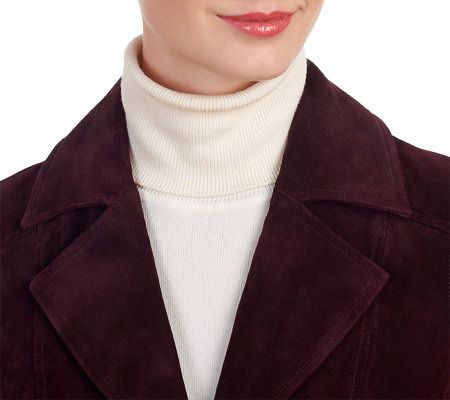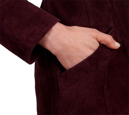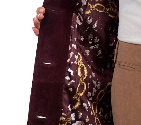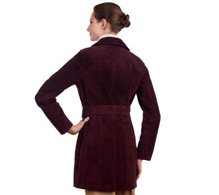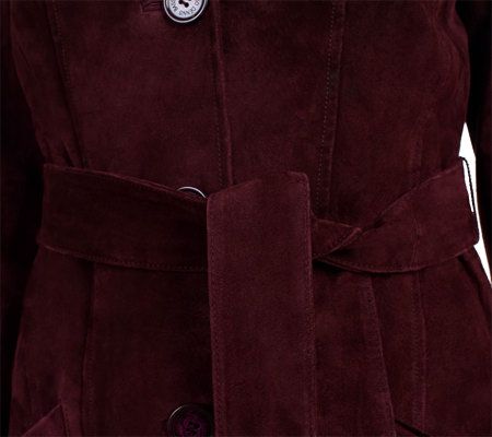 The look you love, from the name you trust. With its genuine leather washable suede and attention to detail throughout, this must-have jacket gives you carefree couture with uncompromising style. Wear the removable belt for an always classic trench coat look, or leave it off and let the seaming detail provide versatility and shape. Even unbutton the front to get a glimpse of the signature printed lining. And, when it's time for a clean, just toss it into the washing machine and tumble dry.