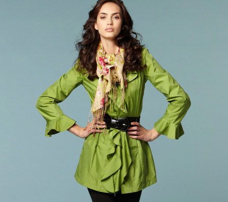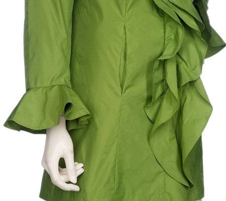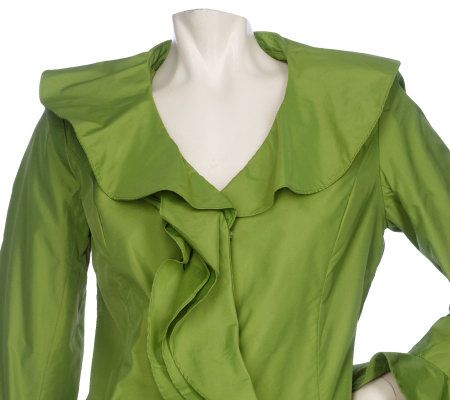 Trade in that old rain slicker for a more fashion-forward choice. Designed with a shawl collar, ruffle trim down the center, and ruffled cuffs, this jacket is a must-have for spring. And, because it's water-resistant, you never have to worry about being caught out in the rain! From Dennis Basso.