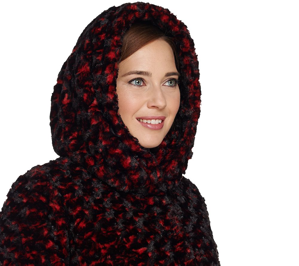 Features: shawl pillow collar with hood, fabric-covered snap closures, single button and loop at neckline, slash pockets, long sleeves