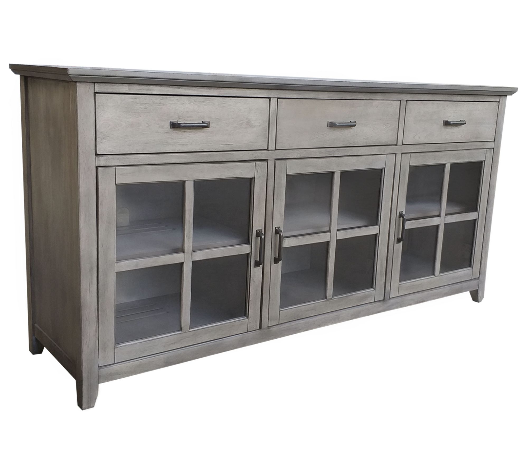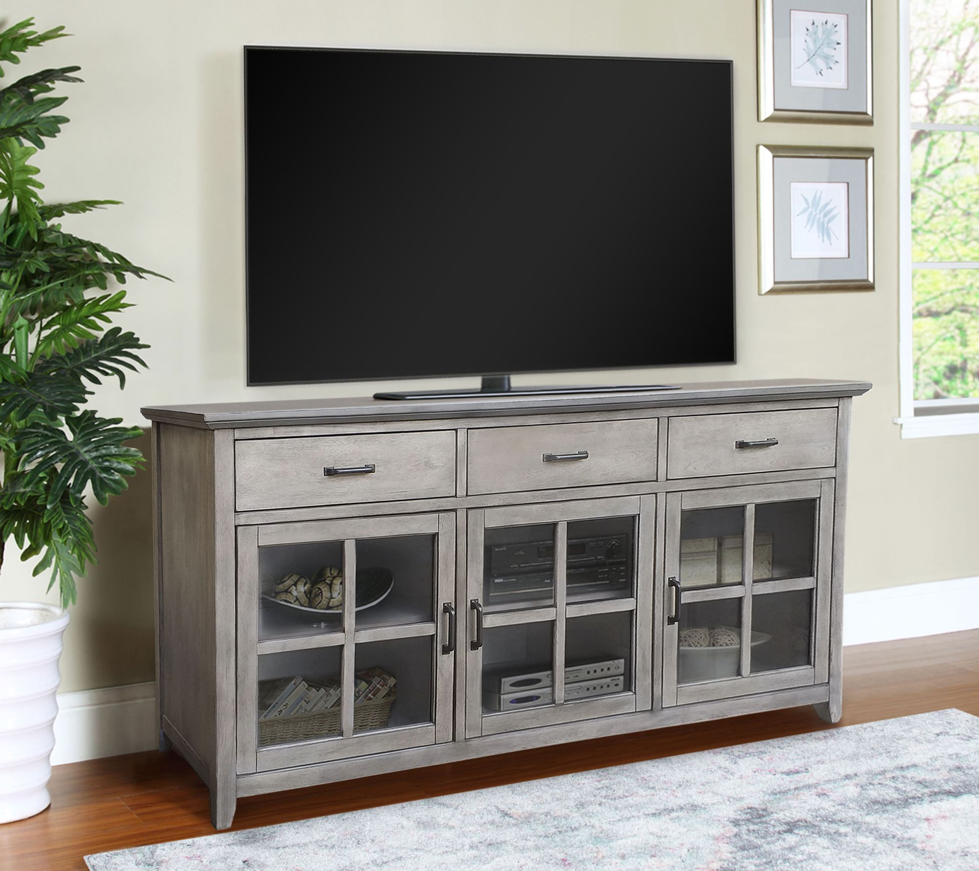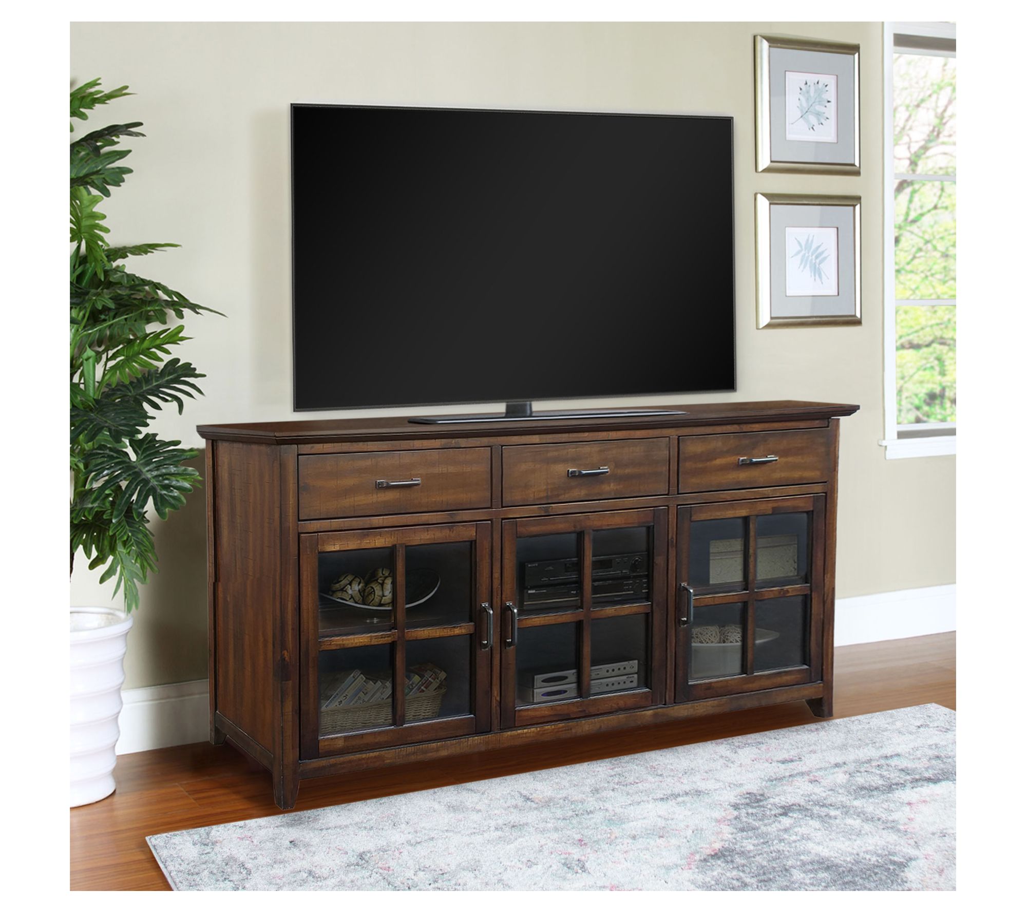 A classic, elegant entertainment station that completes your living room, study, or den, this versatile media console accommodates various television sizes and includes three spacious top drawers, opened glass door doors for more storage, and adjustable center shelves. From Abbyson Living.