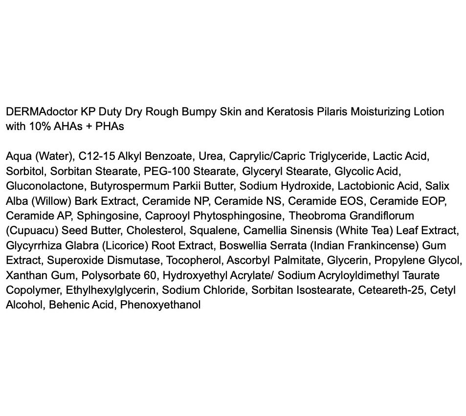DERMAdoctor KP Duty Dry Rough Bumpy Skin Moisturizing Lotion provides your skin with both exfoliation and hydration. Formulated with a blend of AHAs, BHA, urea, and green tea plus PHAs, the lotion helps to chemically exfoliate dry, rough skin to reveal the appearance of a smooth, healthy-looking complexion. Skin feels smoother, softer, silky and supple.