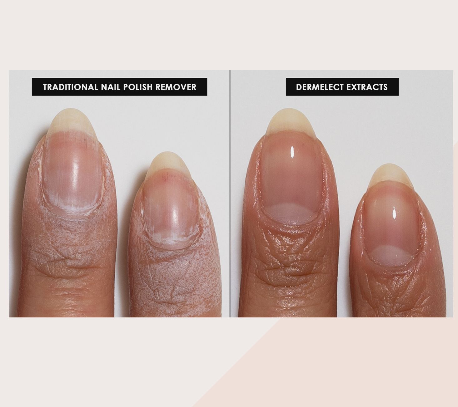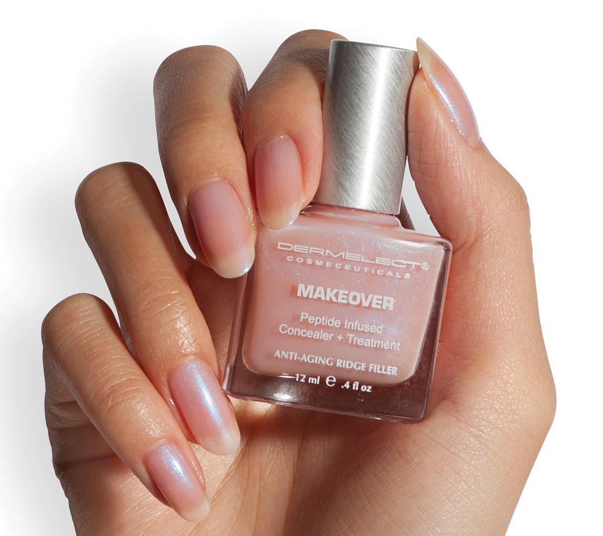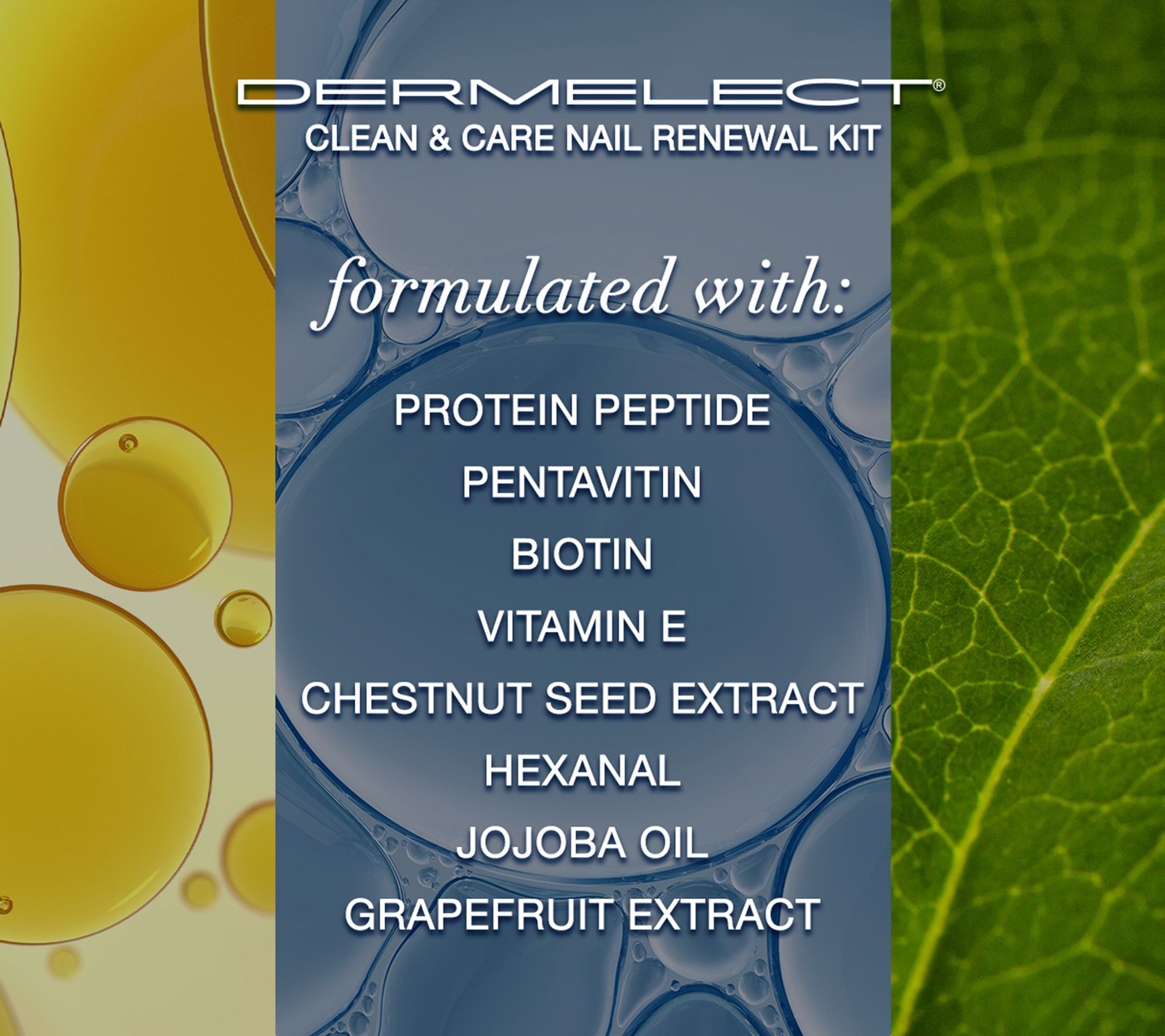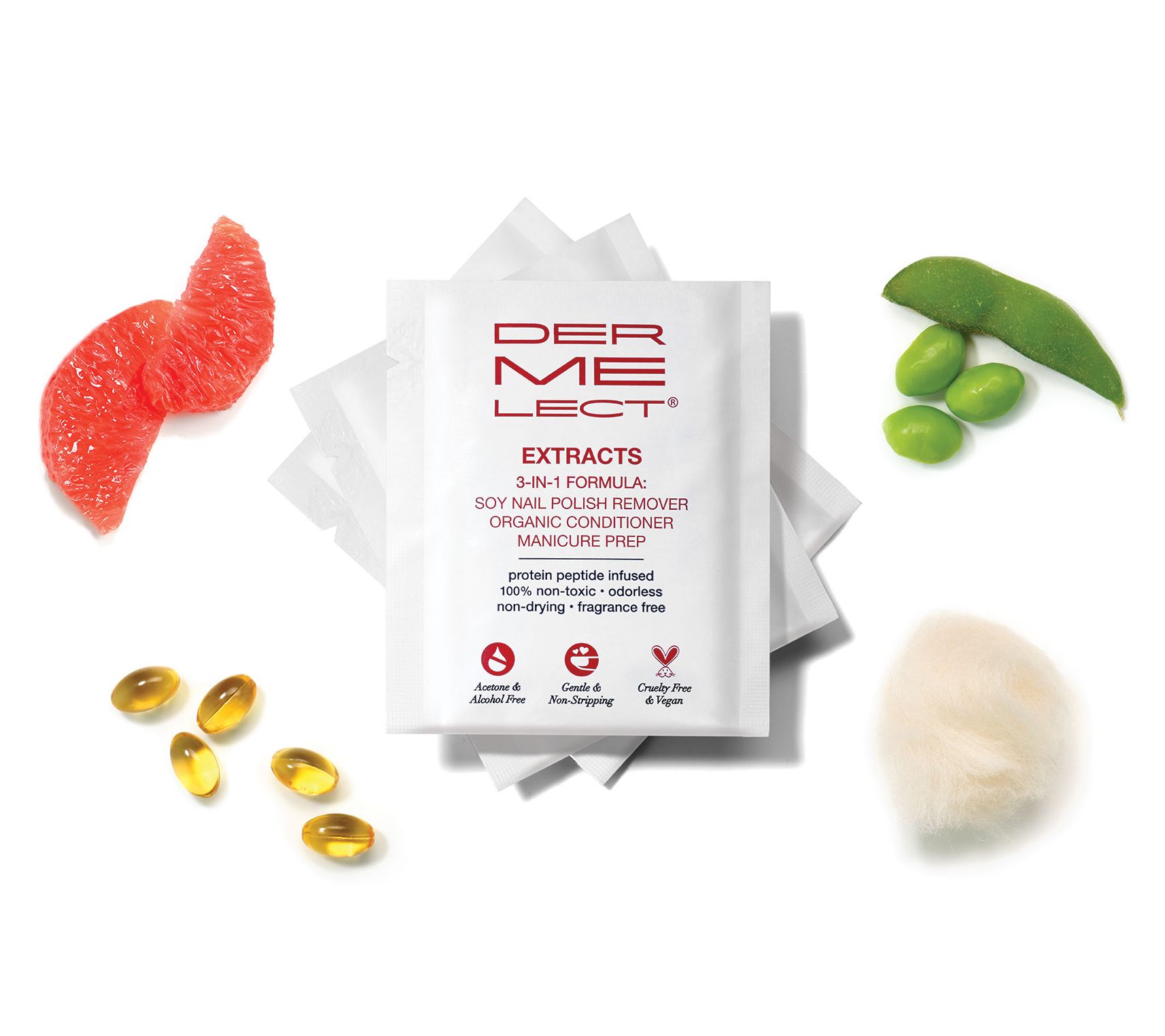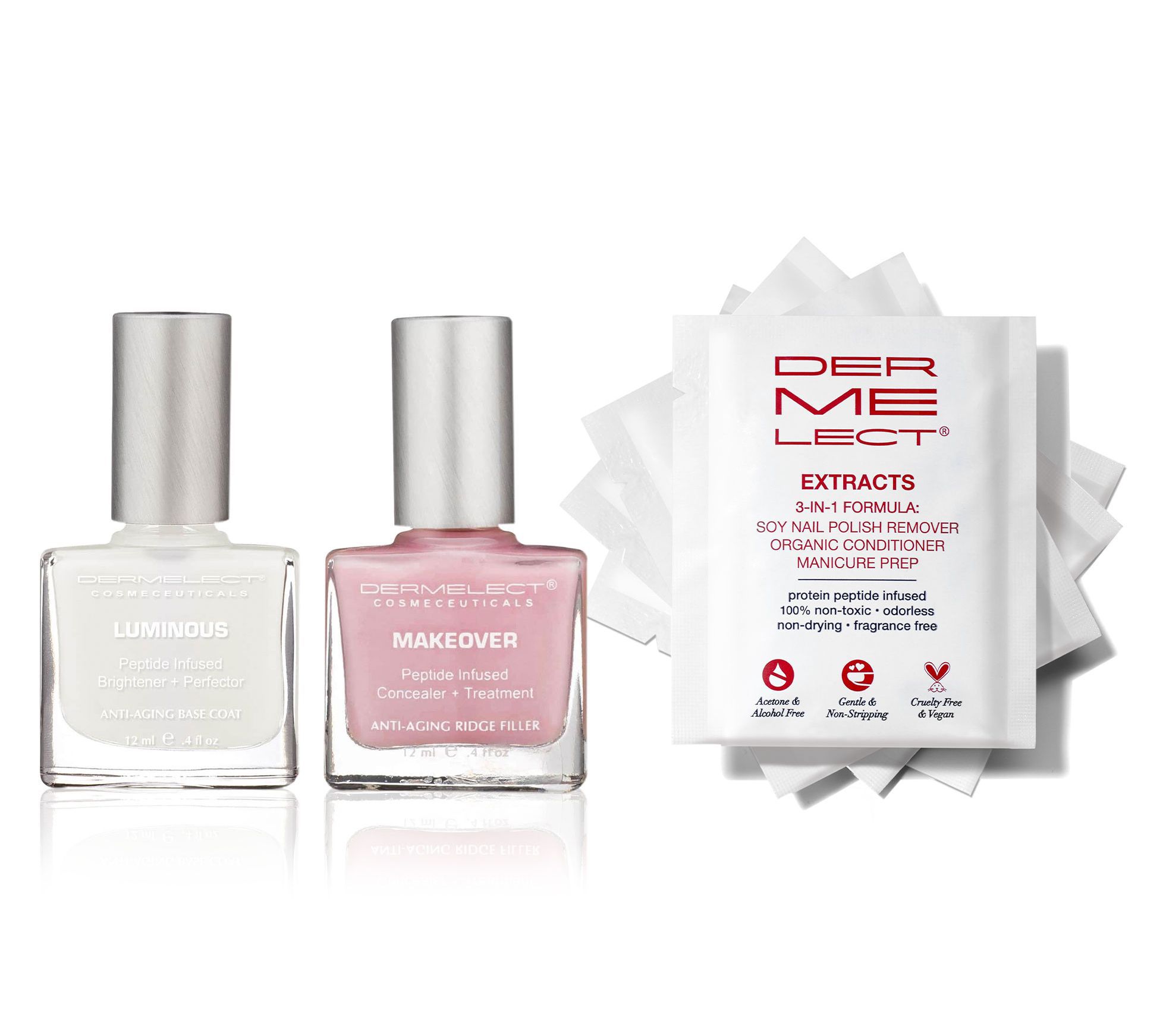 It's like skin care -- for your nails! This clean and care nail collection from Dermelect helps to camouflage nail imperfections and temporarily strengthen nails -- perfect for brittle, thinning, chipping, weak, and splitting nails. Soy Nail Polish Remover Wipes are formulated with moisturizing extracts that leaves no white residue as opposed to traditional nail polish removers. Makeover Smoothing Ridge Filler instantly camouflages nail imperfections with a shimmering pink hue, coating the nail and providing strength and flexibility temporarily and with continued wear. Luminous Nail Brightener + Perfector is formulated with chestnut seed extract, a known moisturizer and conditioner.