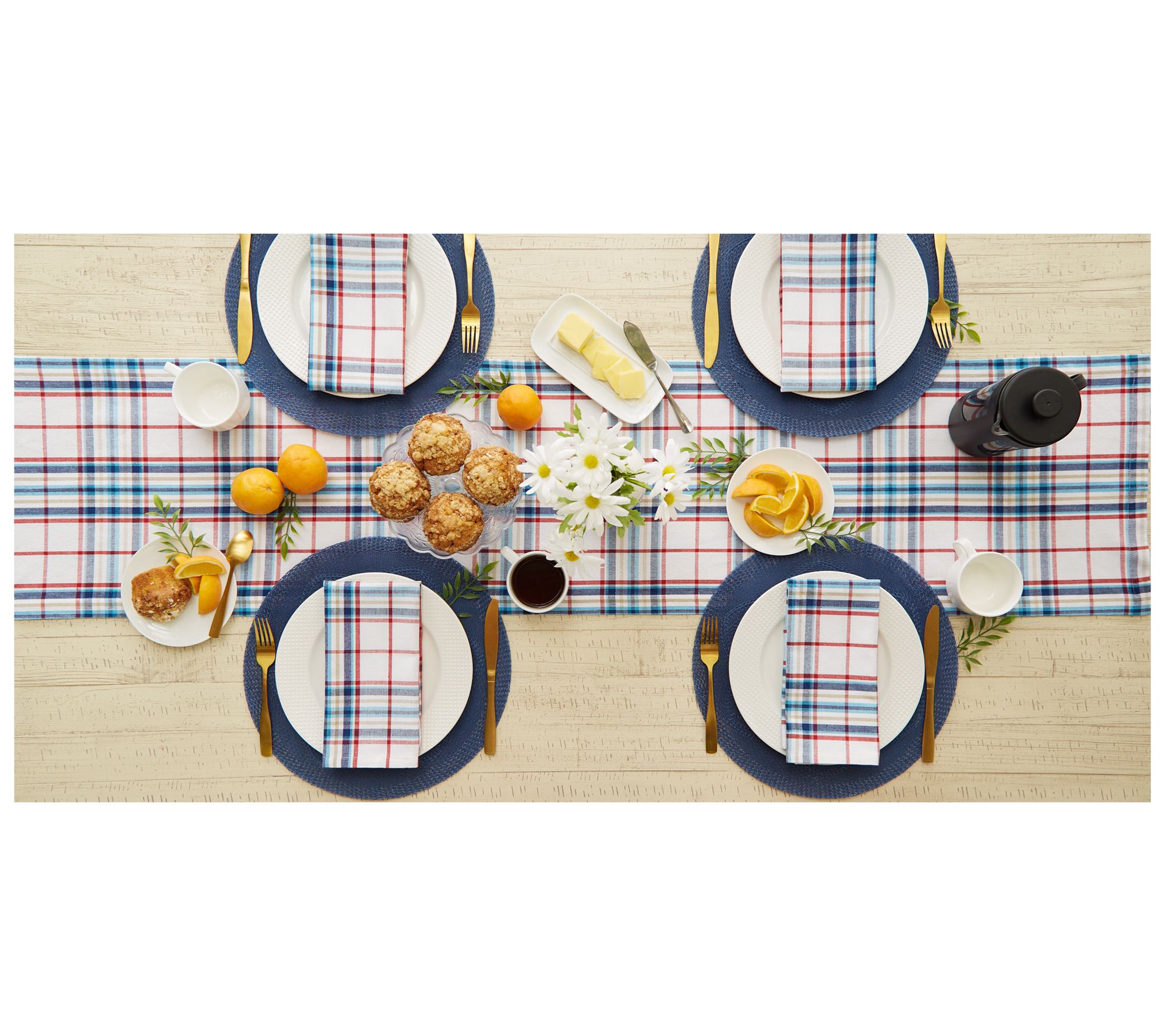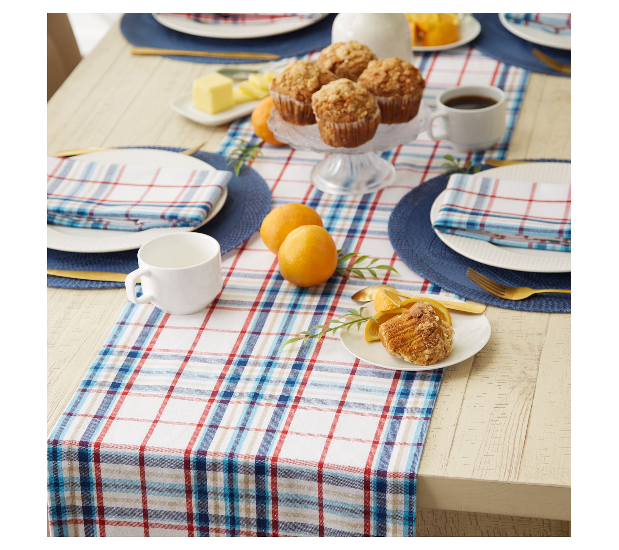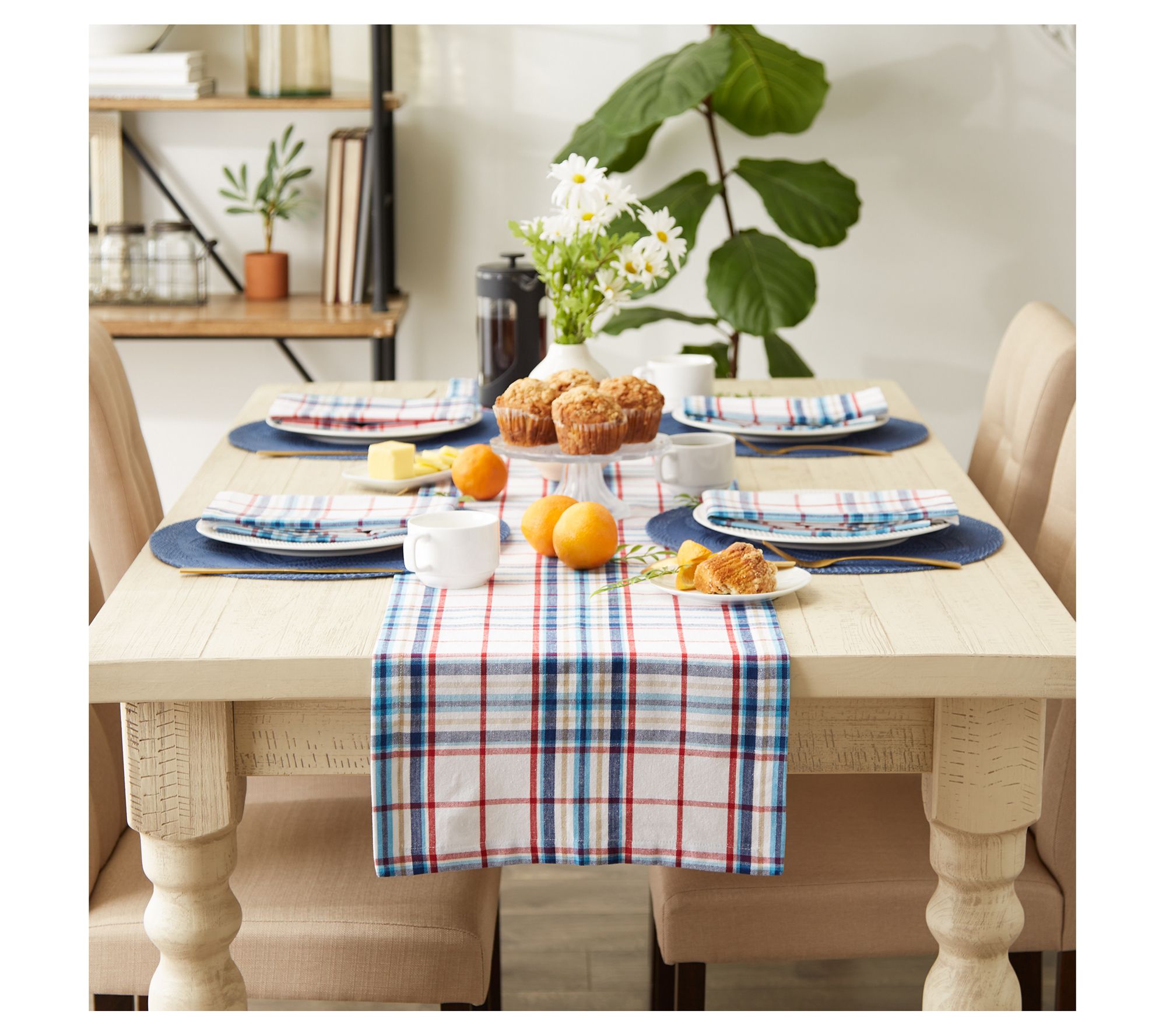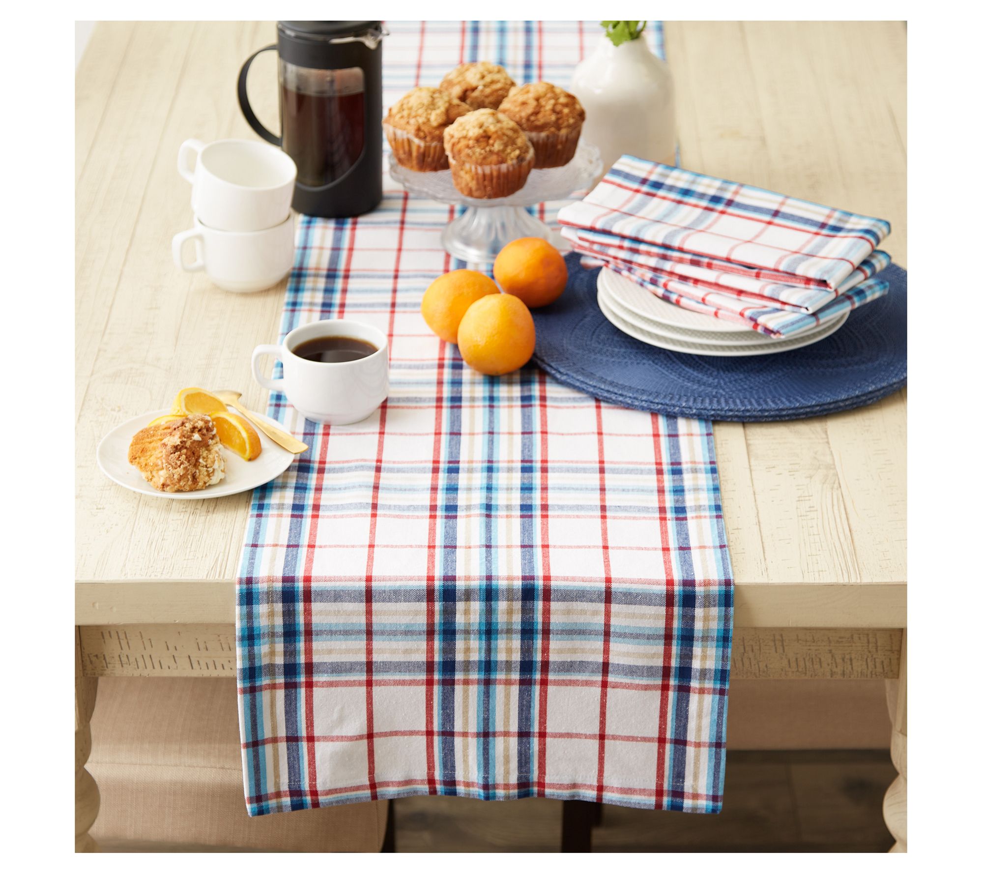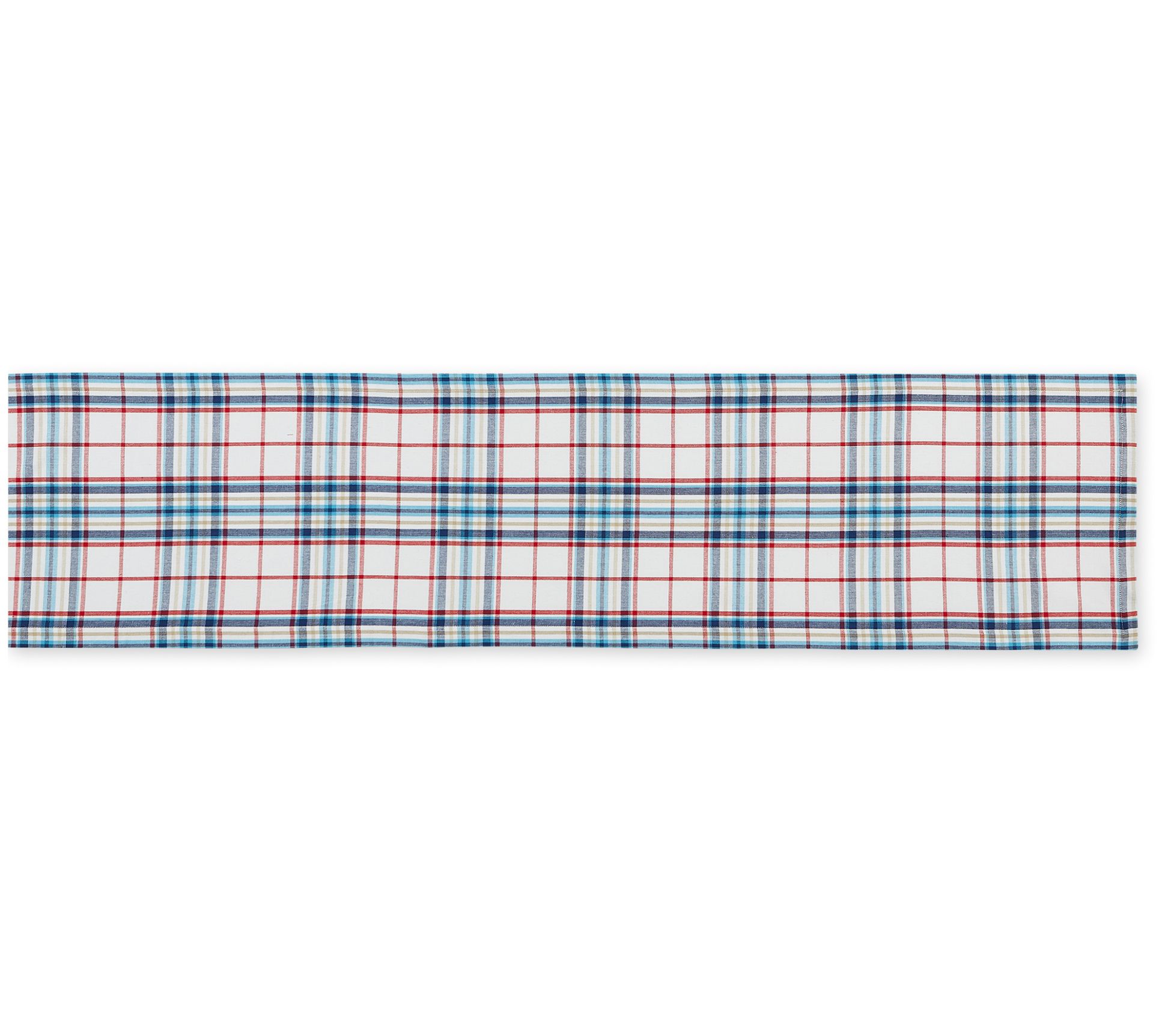 A bright backdrop for celebrating Independence Day or lively summer gatherings, the Lighthouse Plaid runner adds a charming touch of fun and style to your table. From Design Imports.