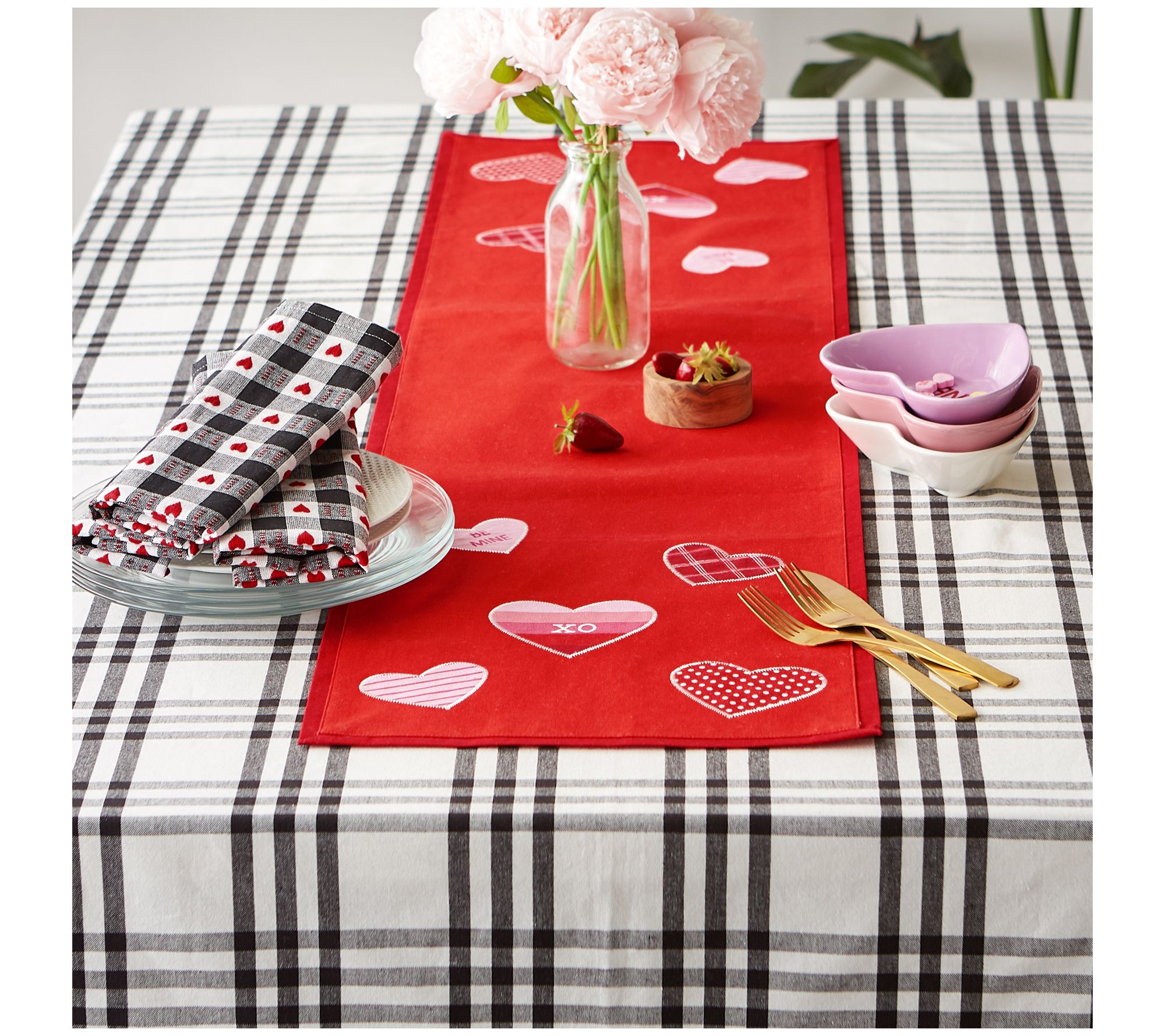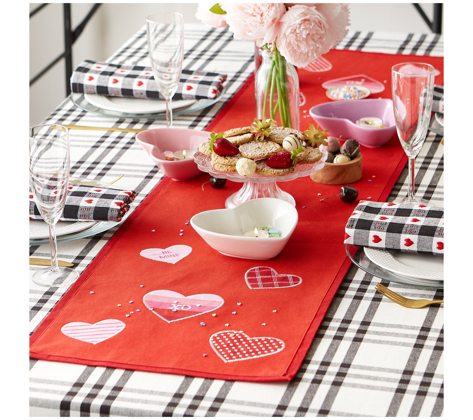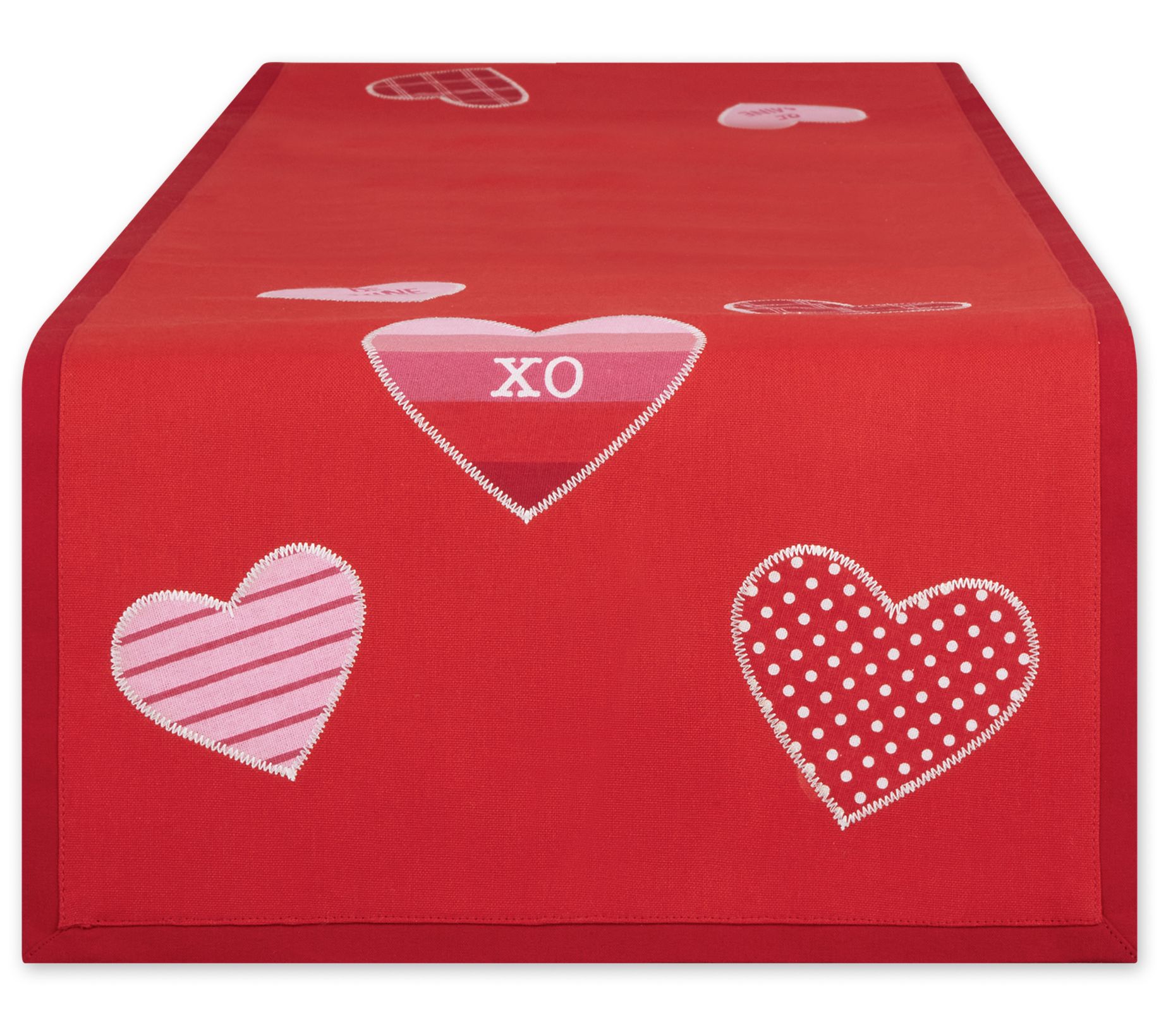 With adorable applique embroidered hearts, this cherry red cotton table runner brings a festive, romantic flair to any table and makes the perfect Valentine's Day or anniversary accent. From Design Imports.