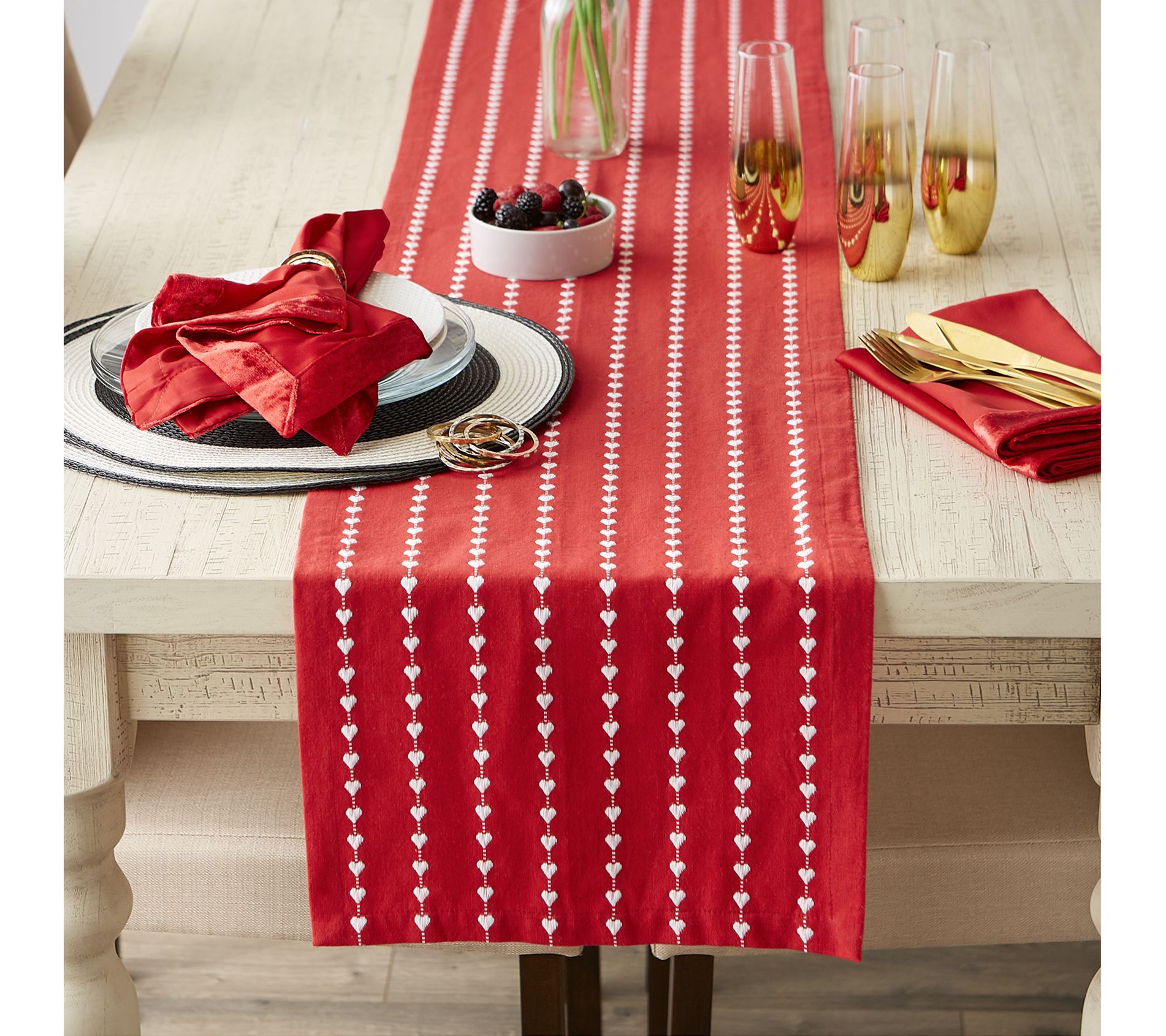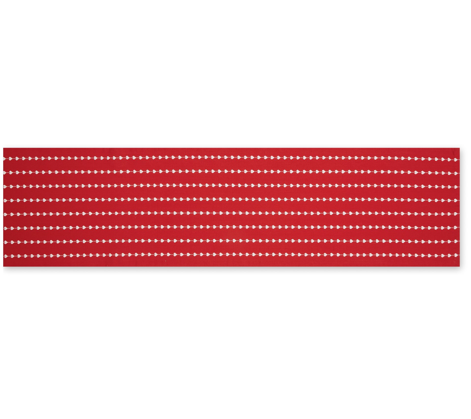 Add a dash of romance to any occasion with this cotton table runner with white hearts and dobby stripes. From Design Imports.