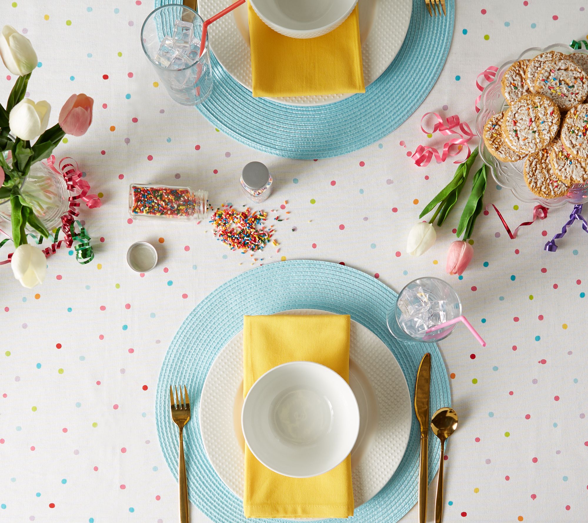 Set the stage for celebration with this Confetti Toss tablecloth. With its festive design and color-fast, wrinkle-resistant fabric, it adds style to any party. From Design Imports.
