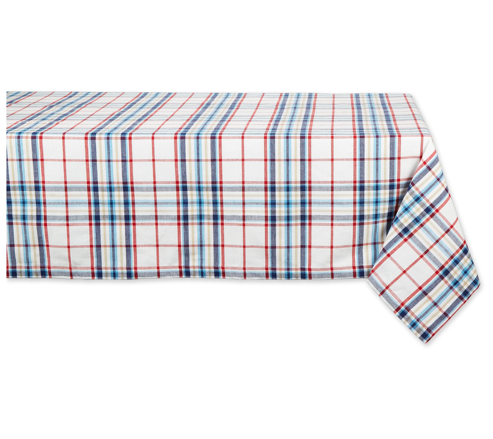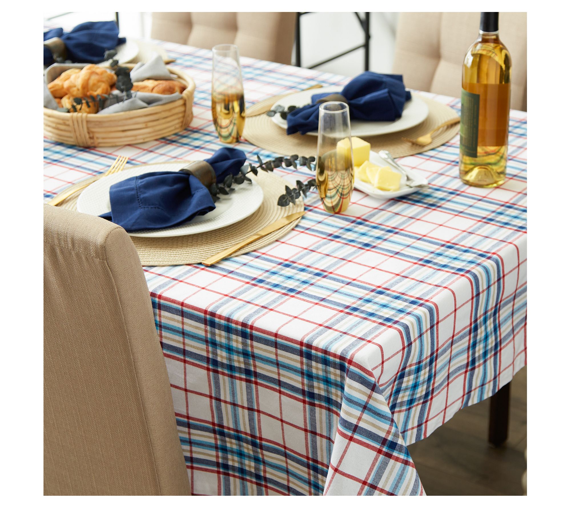 A colorful backdrop for a lively summer holiday or a casual gathering, this vibrant Lighthouse Plaid tablecloth adds farmhouse chic charm to any table setting. From Design Imports.